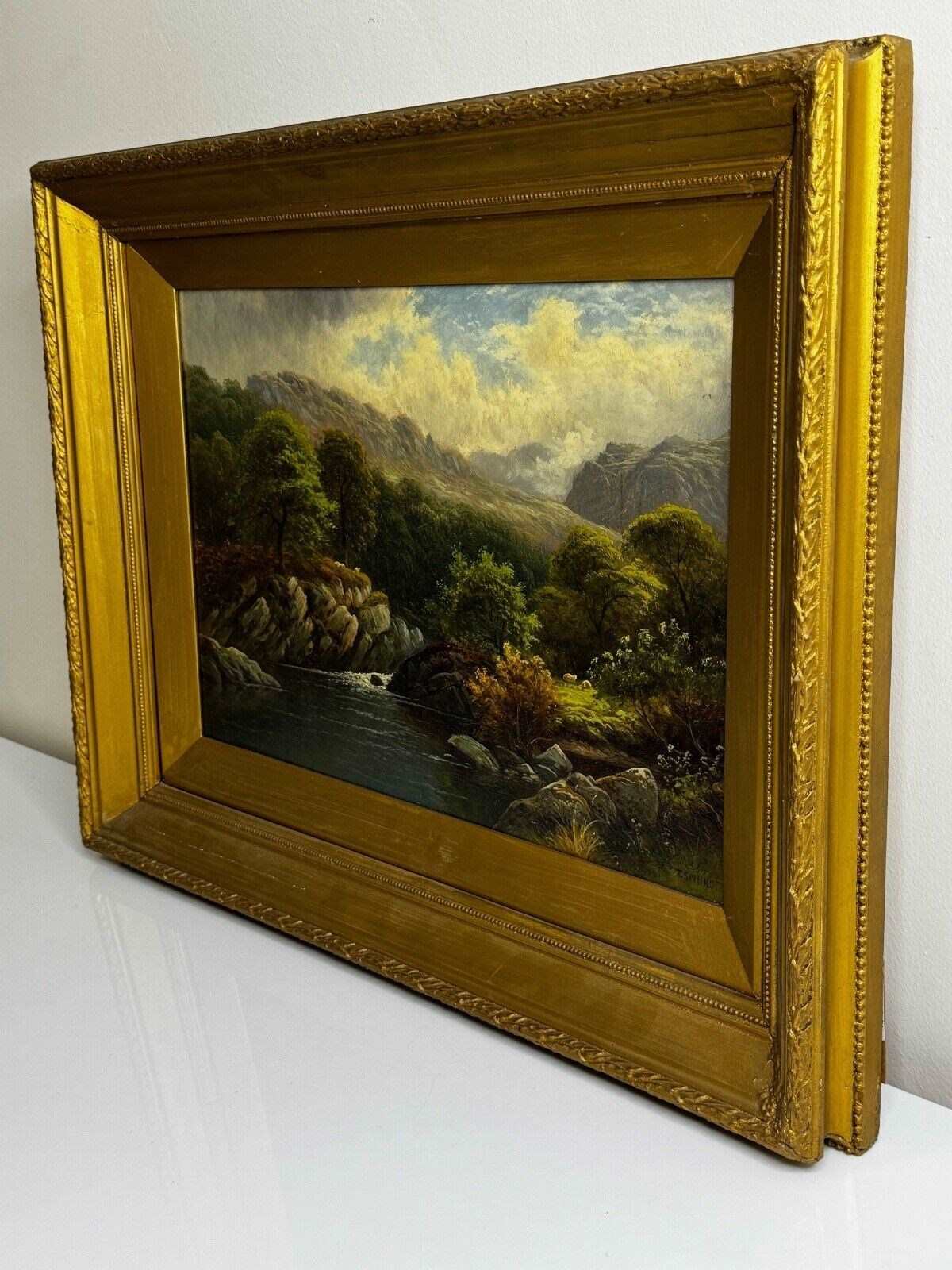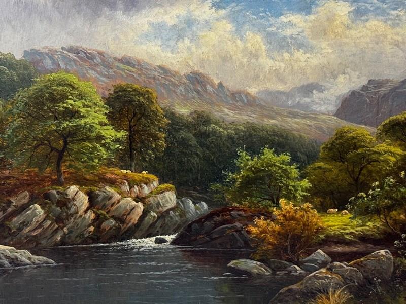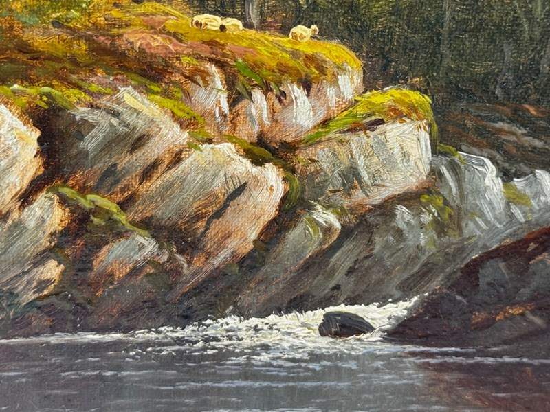 A highly decorative Victorian oil on canvas depicting a tranquil pool on the River Conwy, North Wales, painted during Thomas Spinks’ desirable Welsh period. The scene is beautifully composed, with rugged boulders defining the left bank and softer, tree-lined ground to the right. A small clearing with two grazing sheep adds scale and a gentle pastoral note.