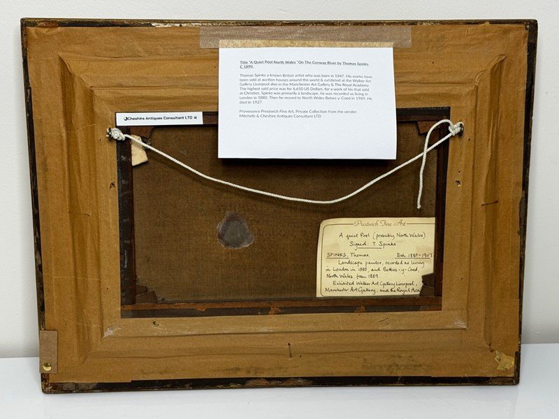 Thomas Spinks (1847–1927) was a recognised British landscape painter who exhibited from 1880 to 1907, including at the Royal Academy, and major institutions such as the Walker Art Gallery (Liverpool) and Manchester Art Gallery. He relocated to Bettws-y-Coed in 1889, and his Welsh river and mountain landscapes from this period are considered among his strongest and most collectible works.