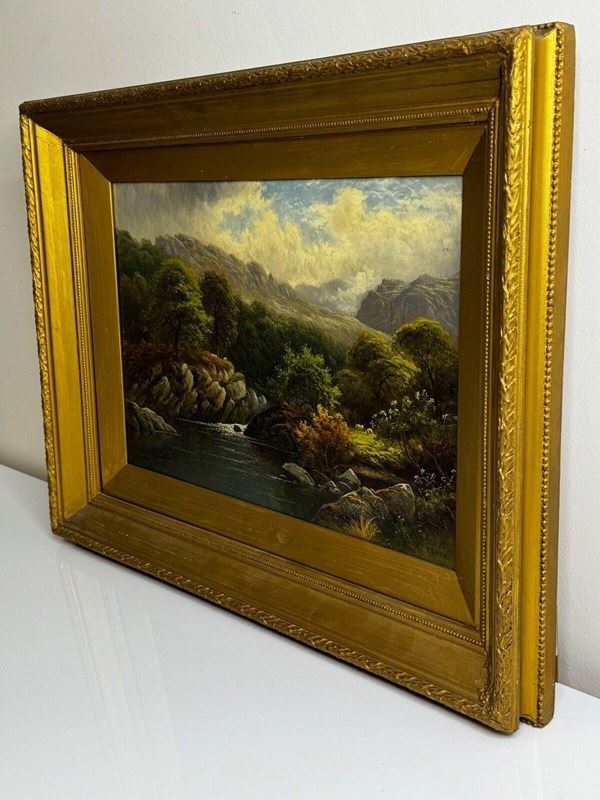 Victorian oil painting, antique landscape painting, British landscape oil, Welsh landscape, River Conwy, North Wales painting, Bettws-y-Coed artist, Thomas Spinks, signed oil on canvas, gilt framed oil painting, 19th century painting, antique wall art, pastoral landscape, decorative Victorian picture.