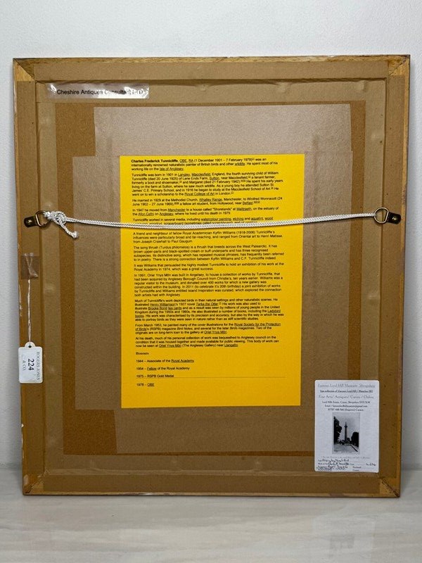 Another great influence on Tunnicliffe was the renowned Franco-American ornithological artist adventurer, John James Audubon (1785-1851), whose striking compositions provide an ancestral echo to the present work. Both artists were keen walkers, and shared an indefatigable fascination with nature, which is communicated in their output. The song thrush (Turdus philomelos) is a thrush that breeds across the West Palearctic. It has brown upper-parts and black-spotted cream or buff underparts and has three recognised subspecies. Its distinctive song, which has repeated musical phrases, has frequently been referred to in poetry. There is a strong connection between Kyffin Williams and C.F. Tunnicliffe indeed.