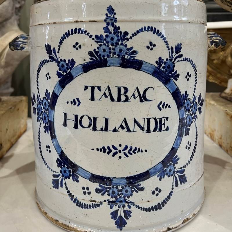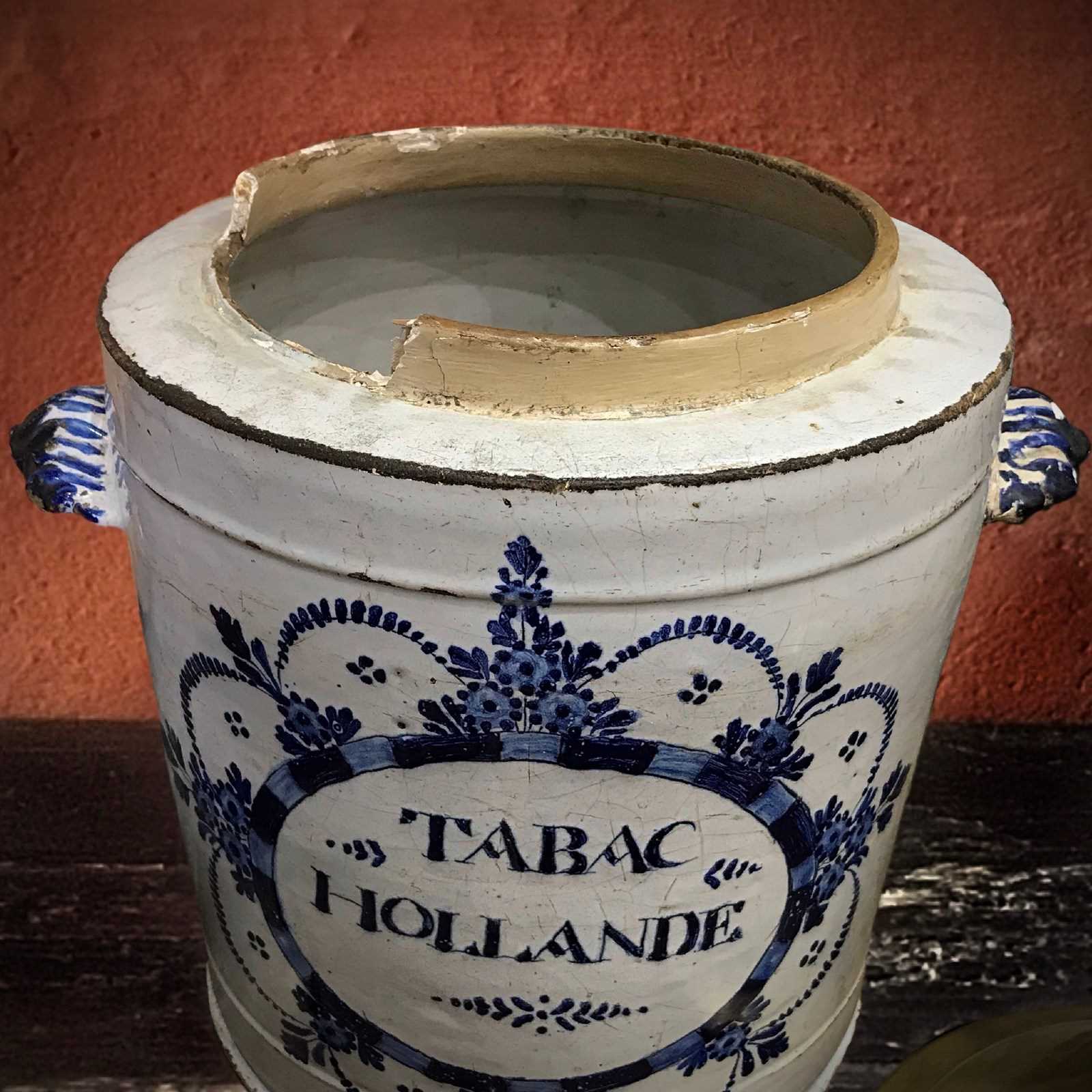 A substantial early Delft tobacconist’s jar made around 1700–1730, decorated in strong cobalt blue with a floral cartouche framing the inscription TABAC HOLLANDE. The jar retains its rare chimney-form brass lid, original to the piece and characteristic of the earliest Dutch tobacco vessels.