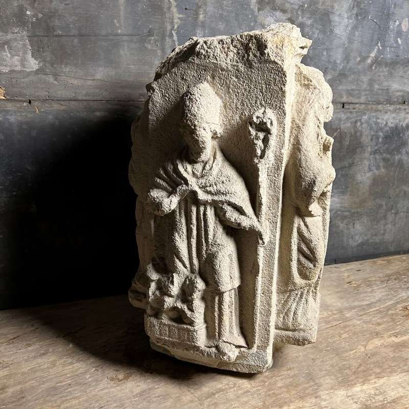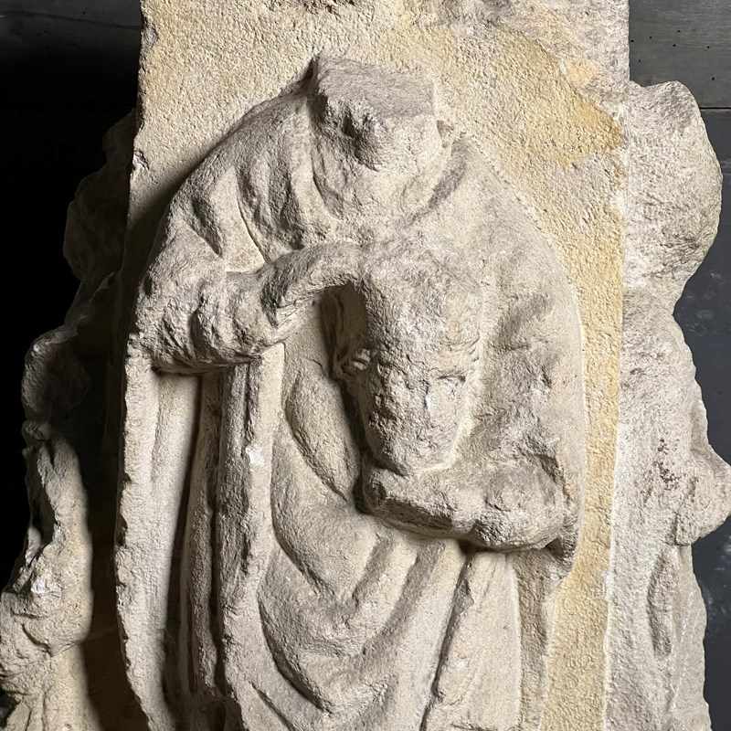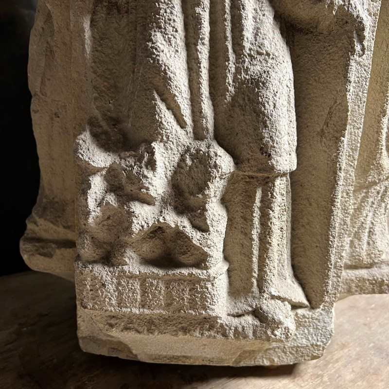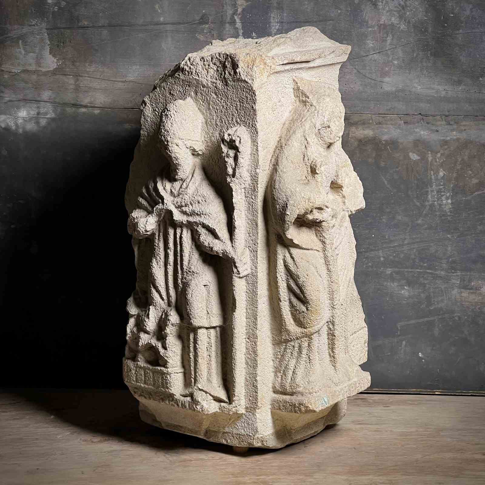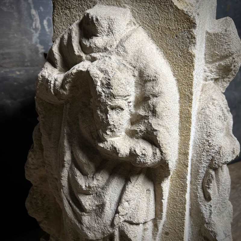 Carved from fine French Jurassic limestone typical of Northern ecclesiastical work, the figures are deeply recessed from the background, their silhouettes sharpened by confident undercutting. The combination of strong presence, clear iconography and architectural form makes this a powerful and evocative piece.