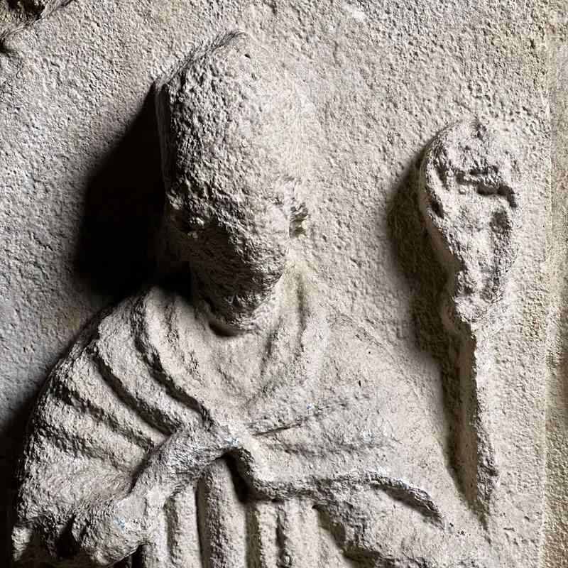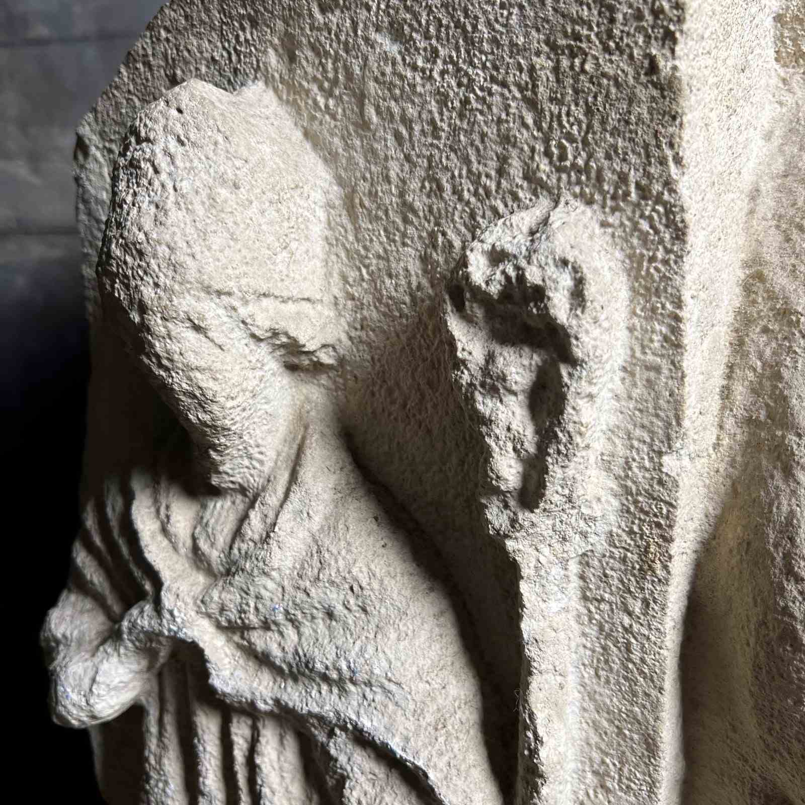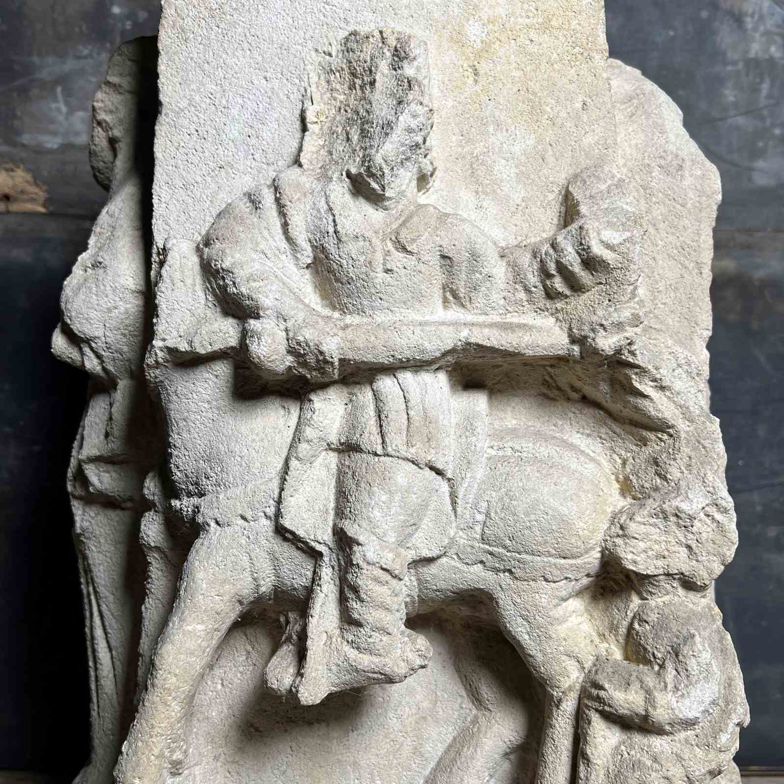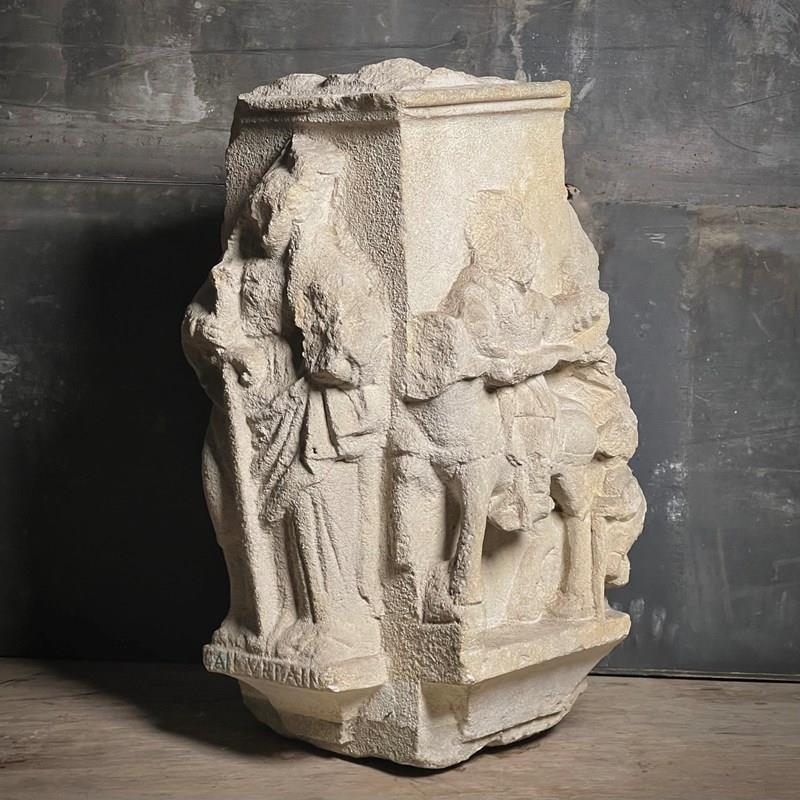 Carved from fine French Jurassic limestone typical of Northern ecclesiastical work, the figures are deeply recessed from the background, their silhouettes sharpened by confident undercutting. The combination of strong presence, clear iconography and architectural form makes this a powerful and evocative piece.