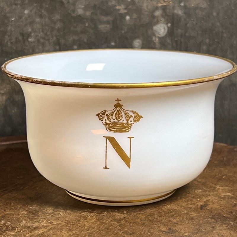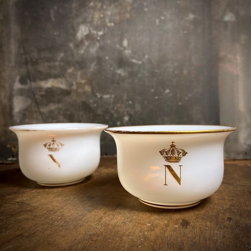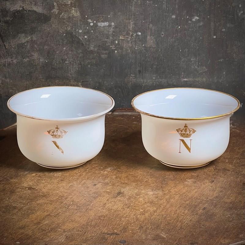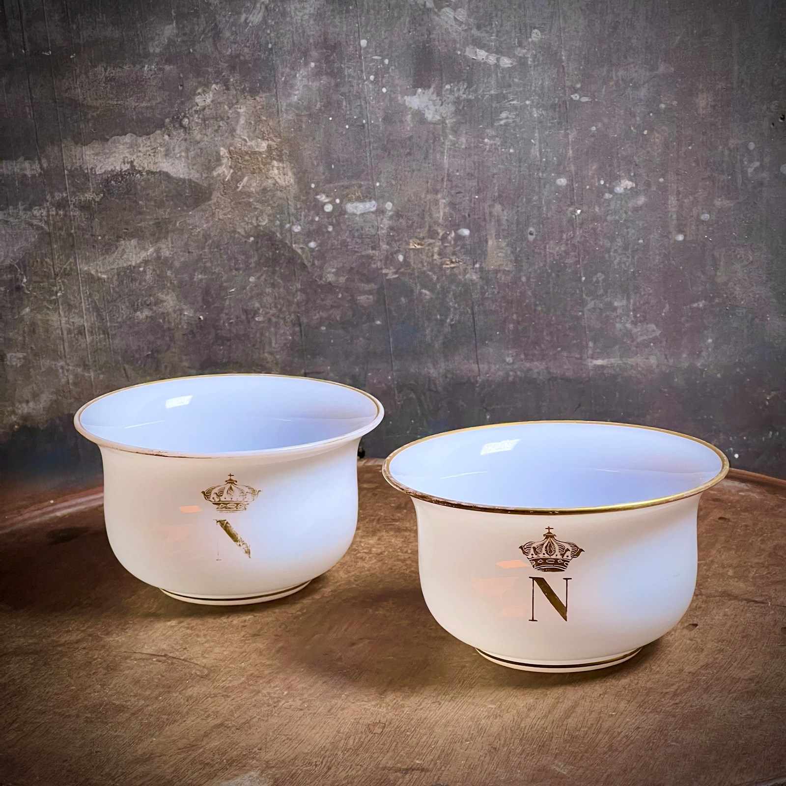 A beautifully refined pair of French bols en opaline — opaline glass finger bowls — each decorated with the gilded crowned N of Napoleon III. These elegant Second Empire pieces were almost certainly produced for the Imperial household and formed part of a formal table service or guest apartment setting.