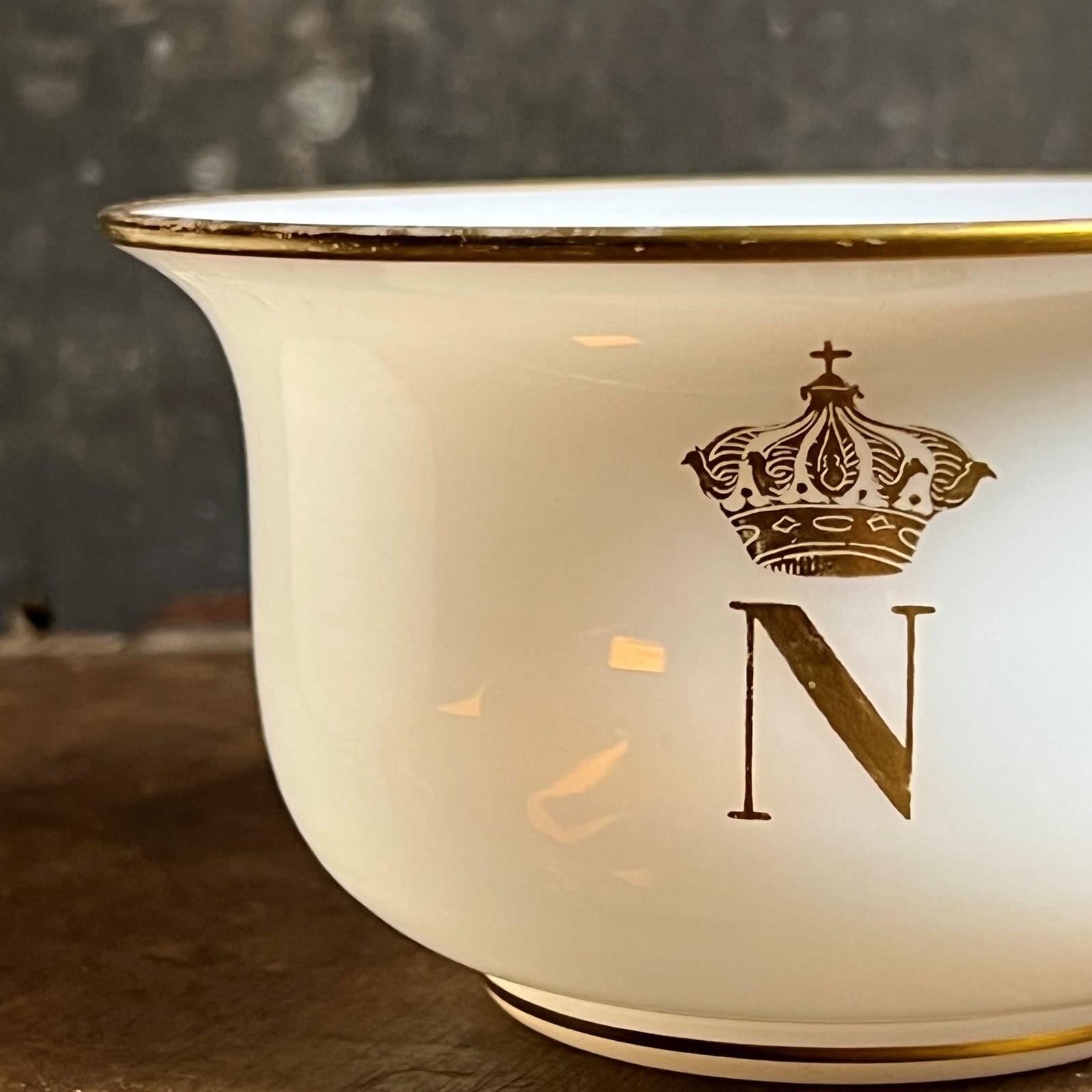 The Imperial monogram is finely rendered in gold leaf; one bowl retains crisp gilding while the other shows gentle softening from age and use — entirely consistent with authentic court service pieces. Finger bowls from Napoleon III’s own table are scarce, and matched pairs such as this are exceptionally uncommon.