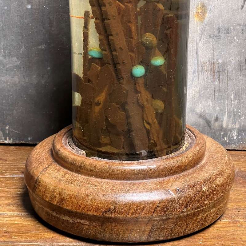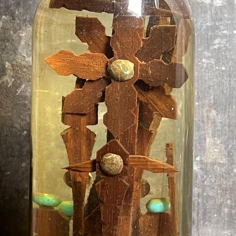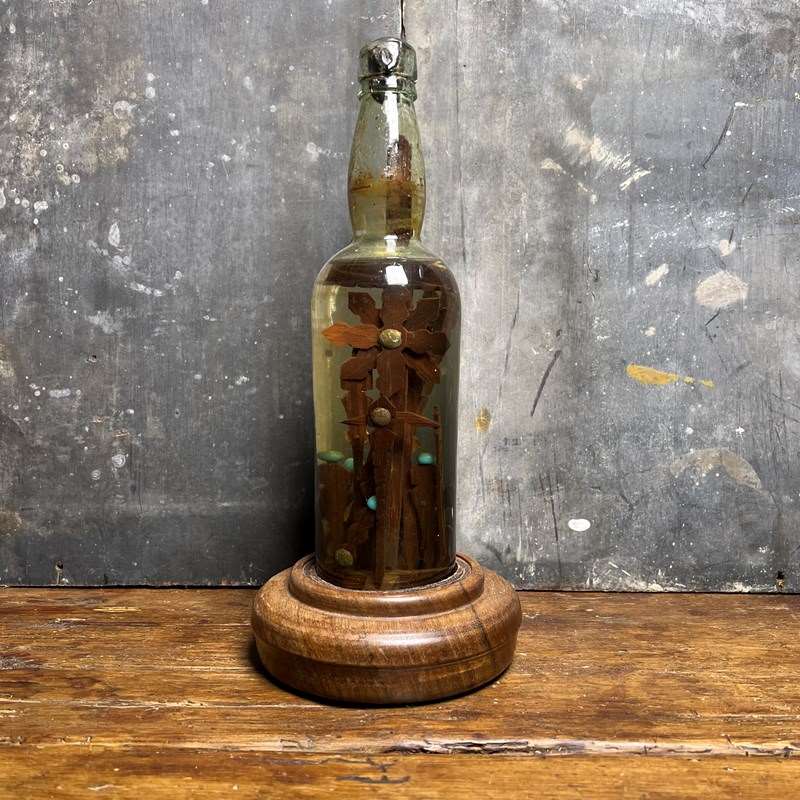 Housed in an early clear-glass spirits bottle—almost certainly once used for schnapps or fruit brandy—the piece contains a carefully constructed wooden crucifix built inside the vessel through the narrow neck, then fully submerged in consecrated (Holy) water. Over more than a century, the liquid has taken on a warm amber tone from the natural tannins in the wood, giving the interior a soft, atmospheric glow.