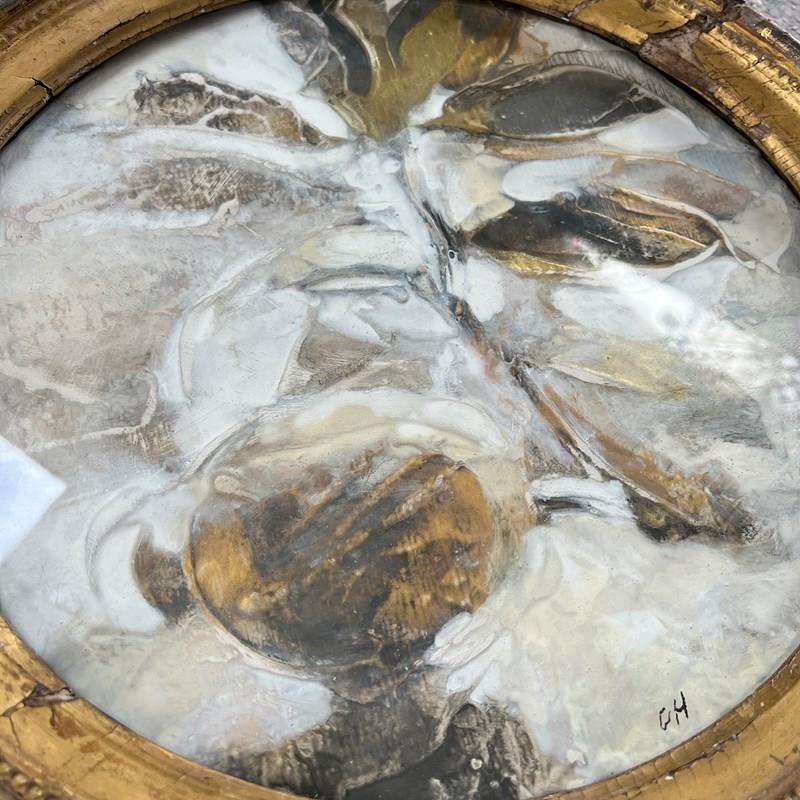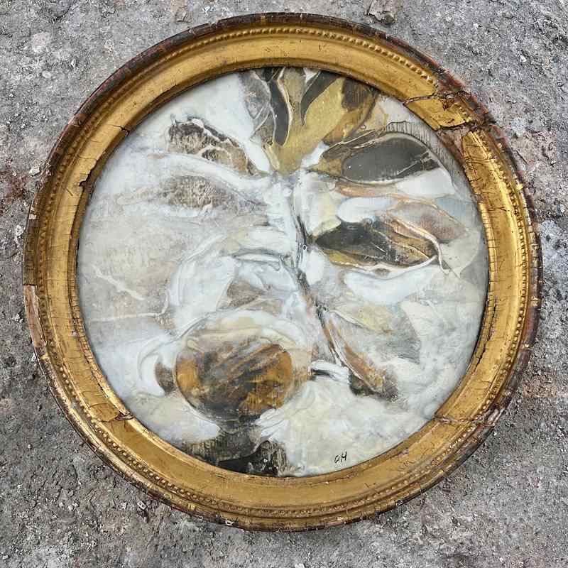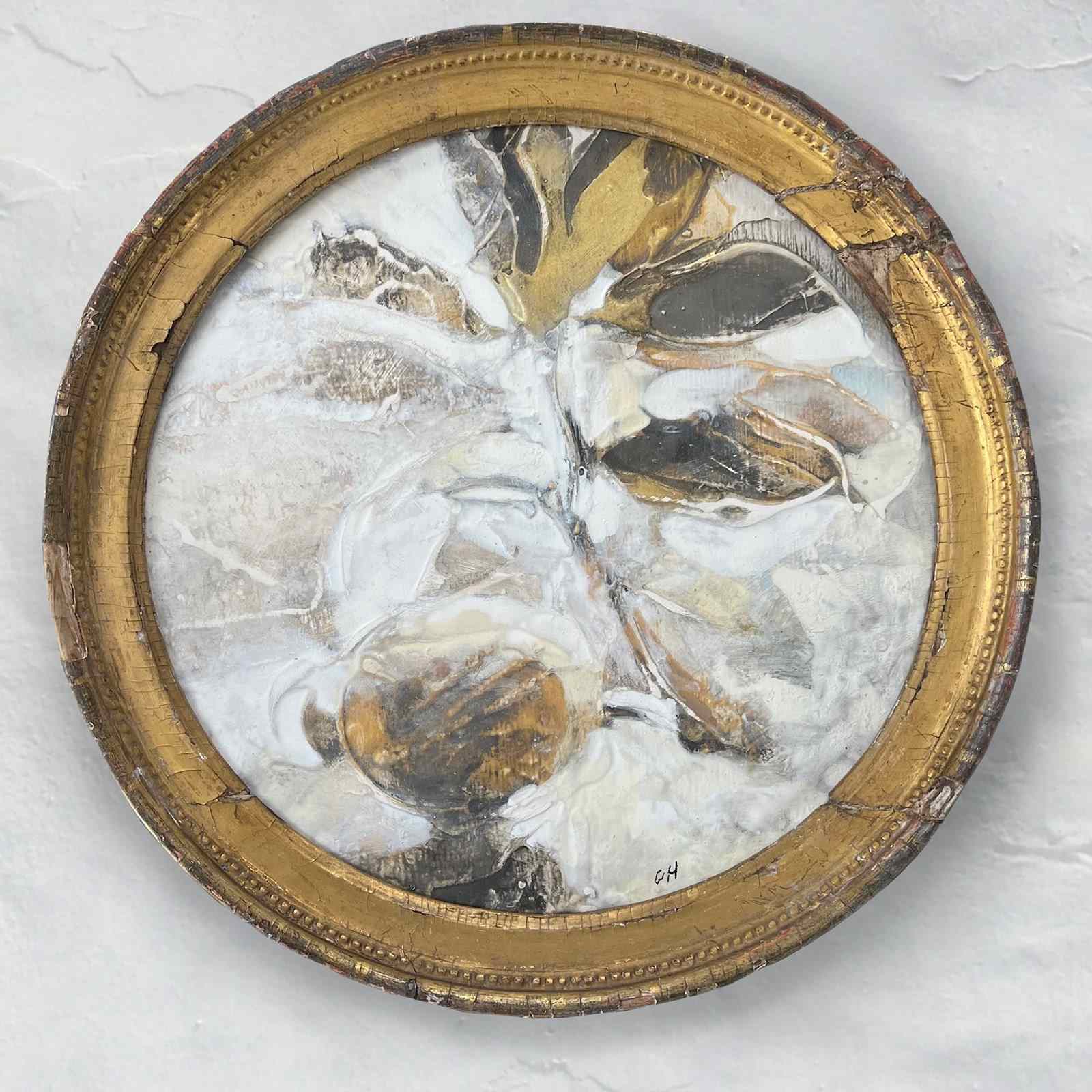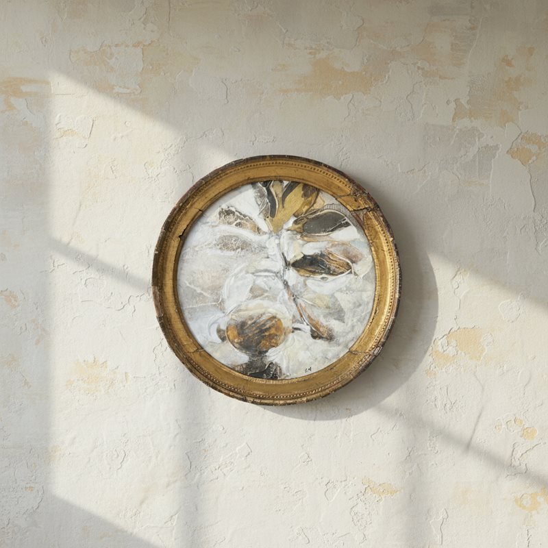 Here it remains whole. Gilded leaves catch and return the dappled light, contained within a small Georgian round frame — something held and treasured.” - Chloë Holt