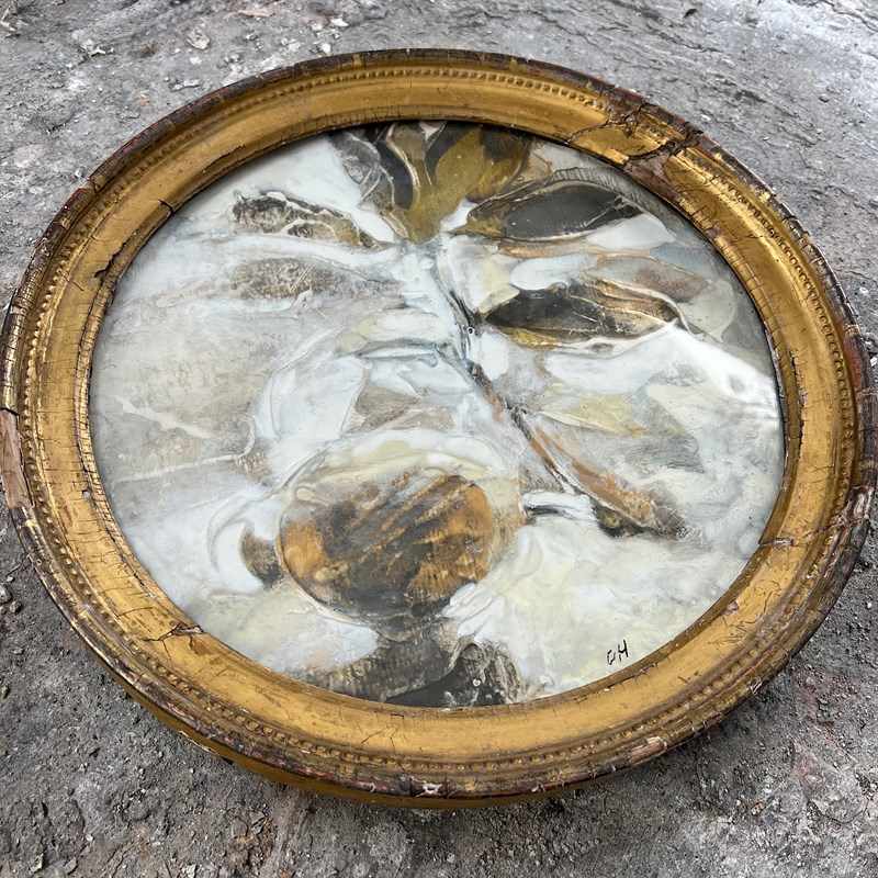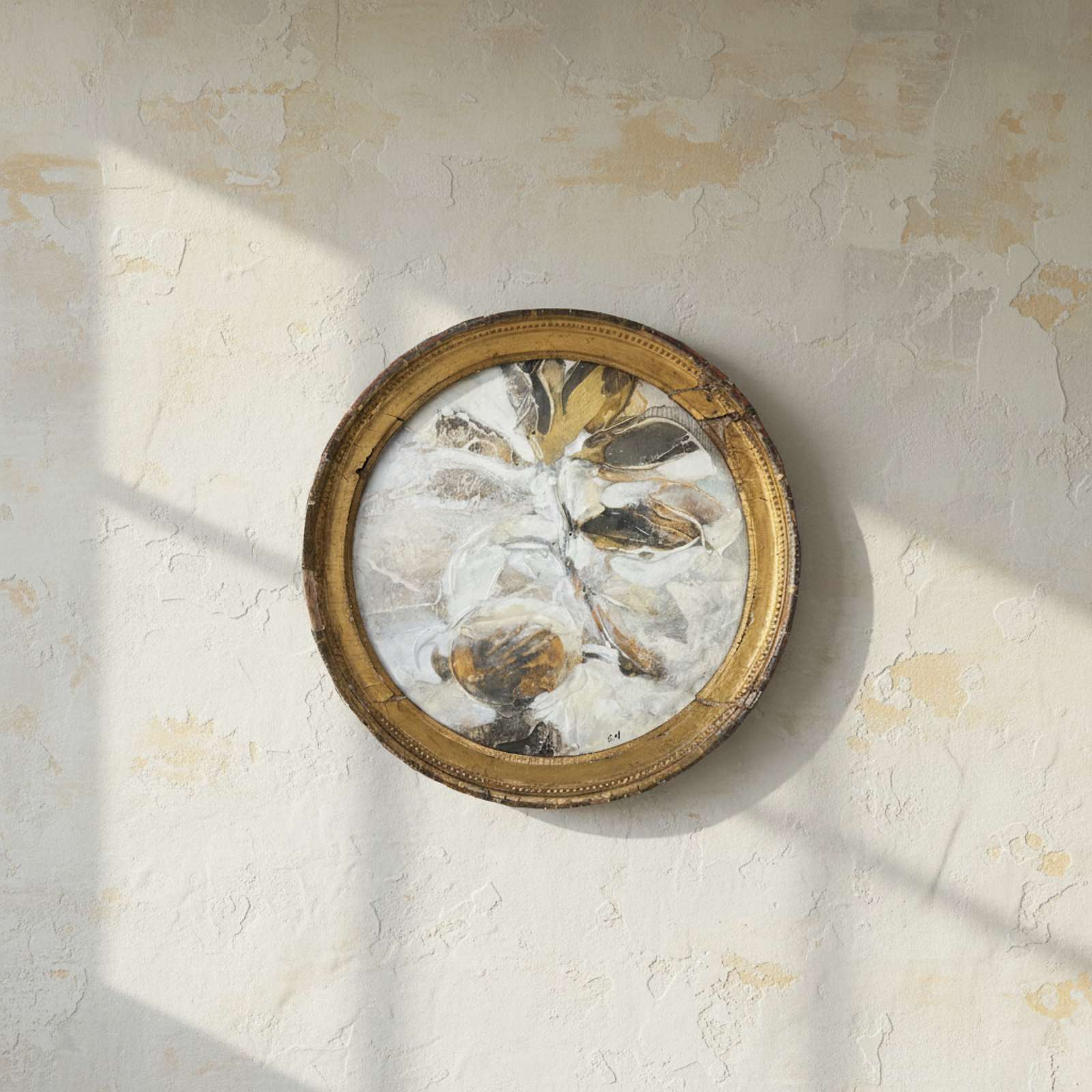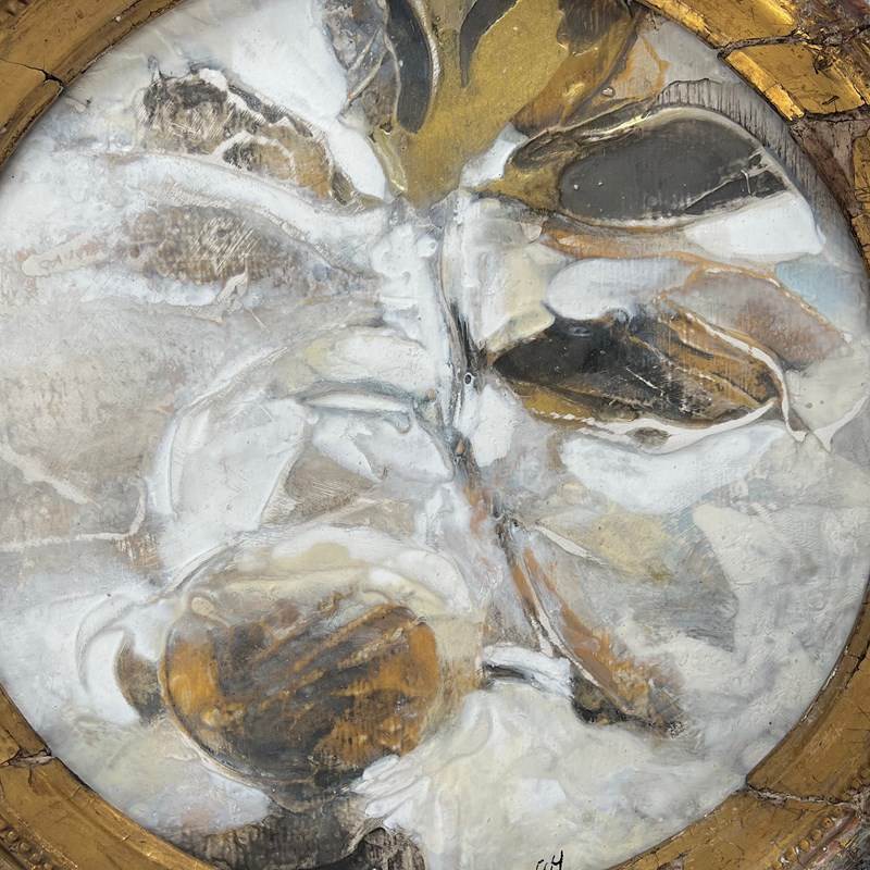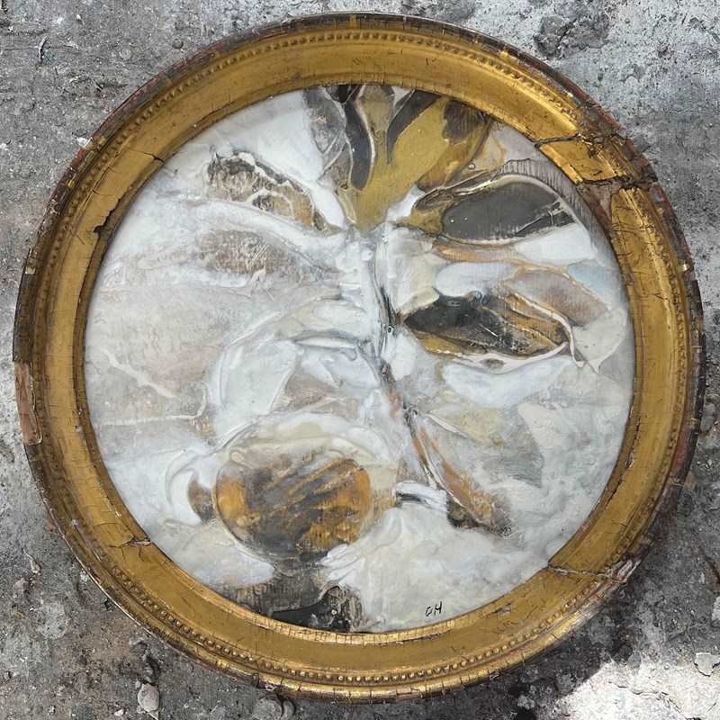 Here it remains whole. Gilded leaves catch and return the dappled light, contained within a small Georgian round frame — something held and treasured.” - Chloë Holt