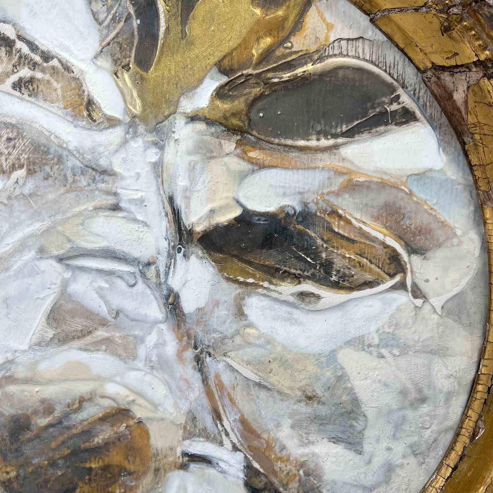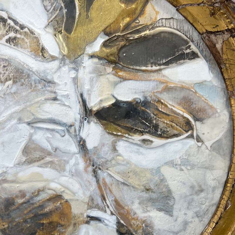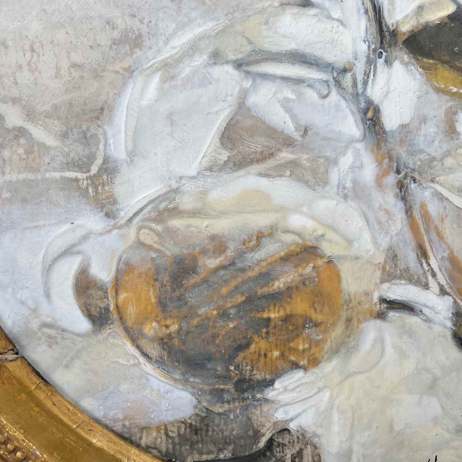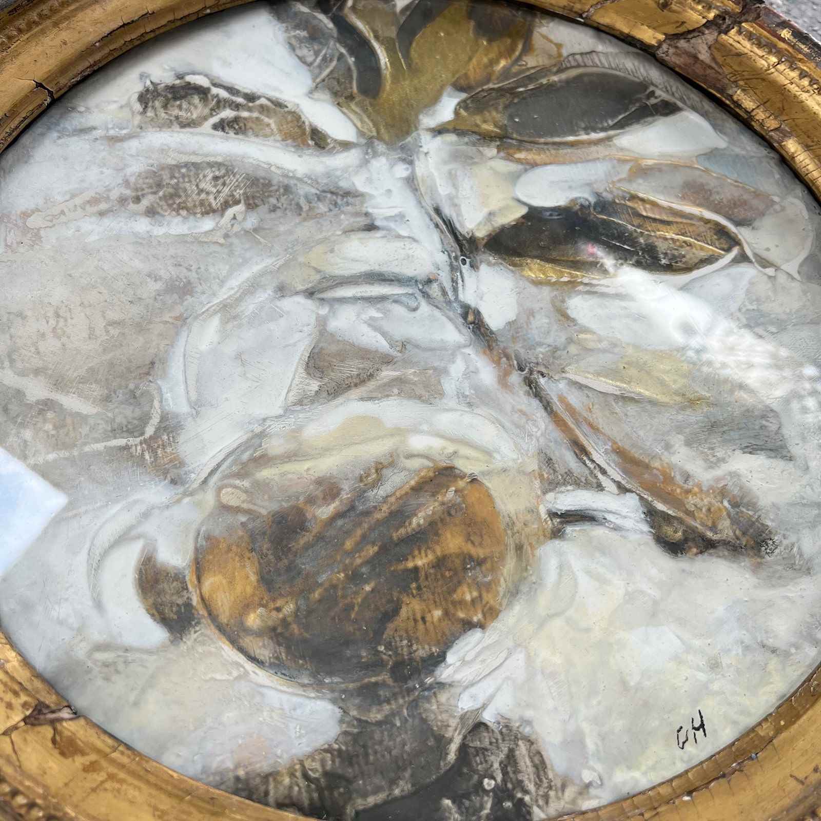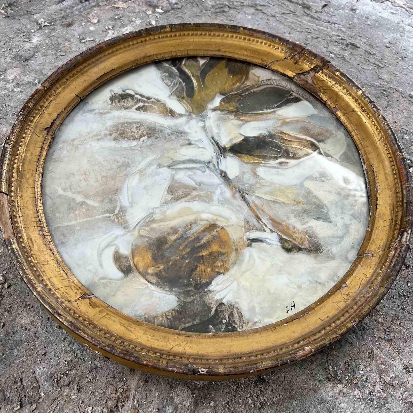 Oil and mixed media on board in antique Georgian tondo gilded frame with original glass.