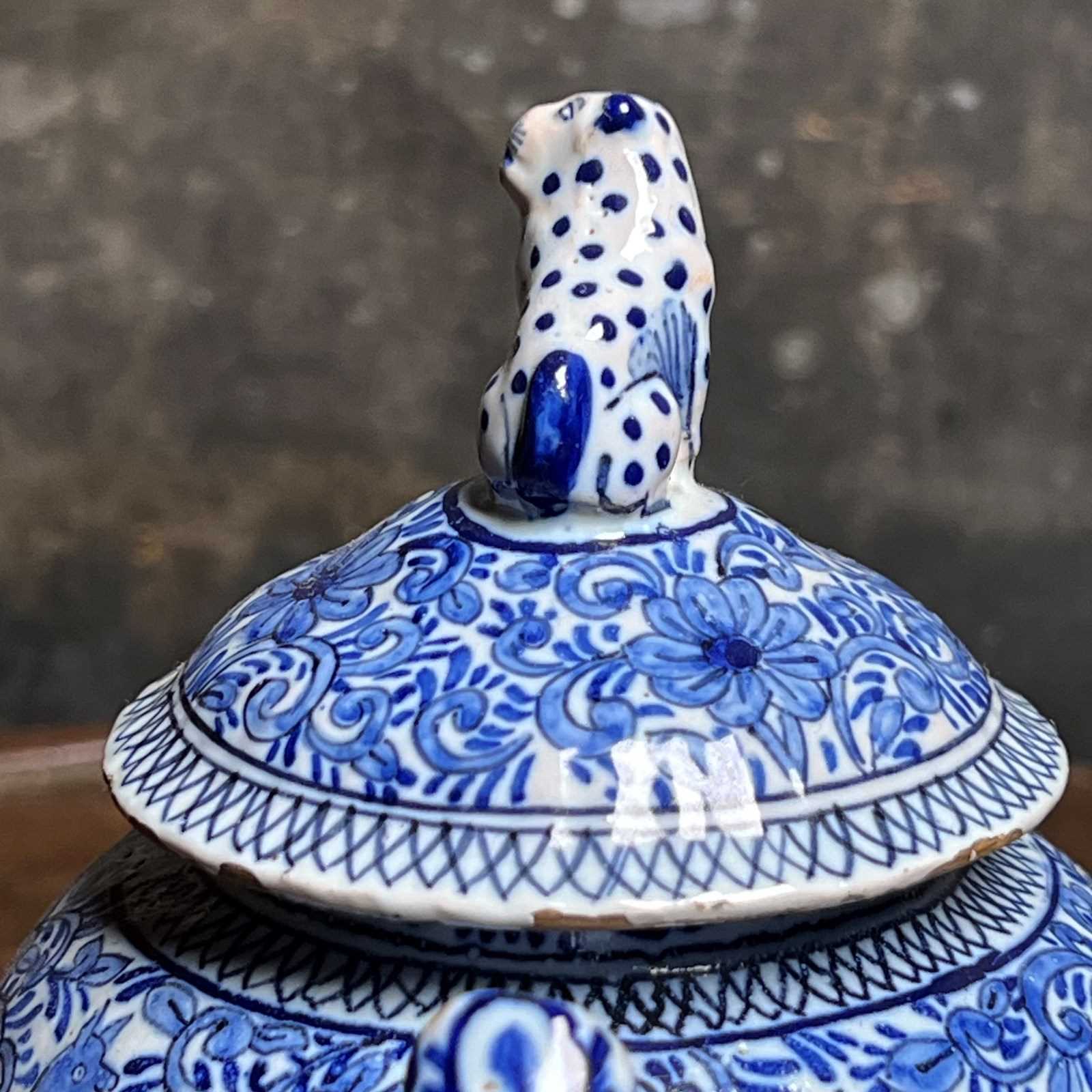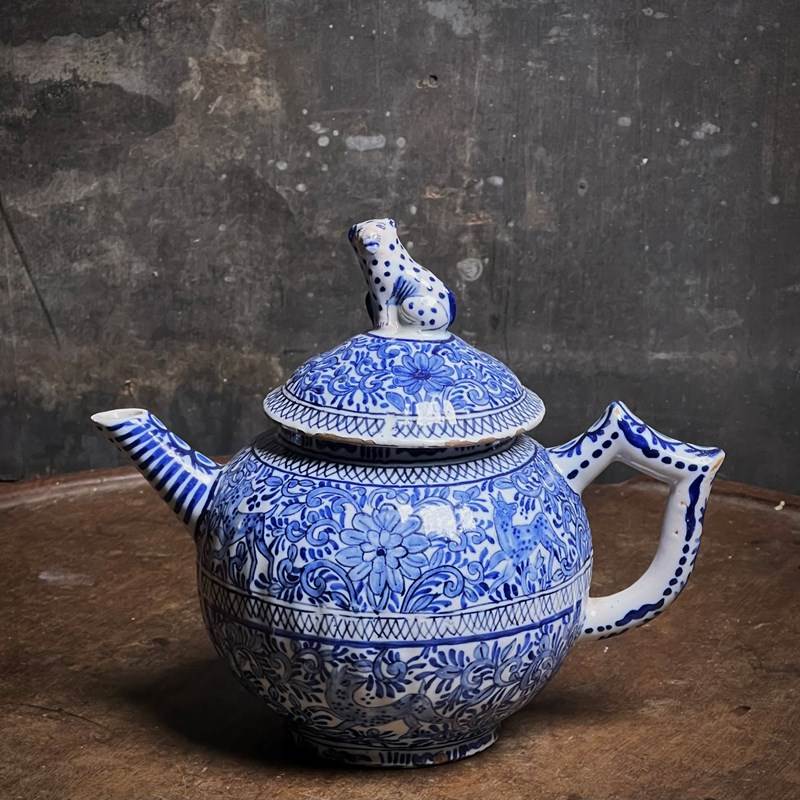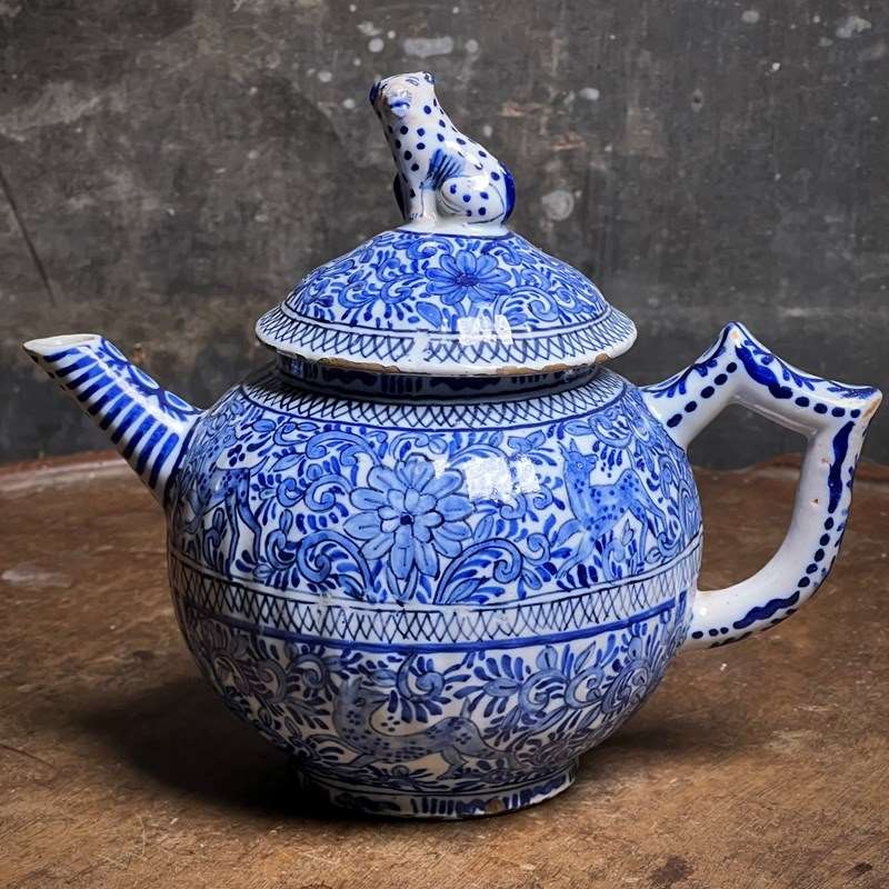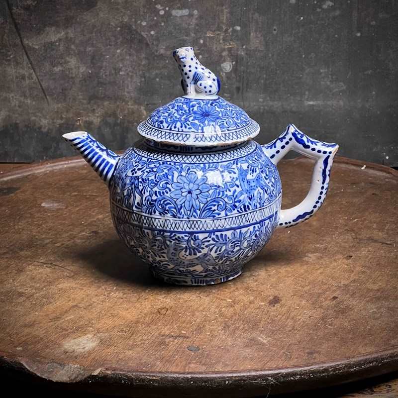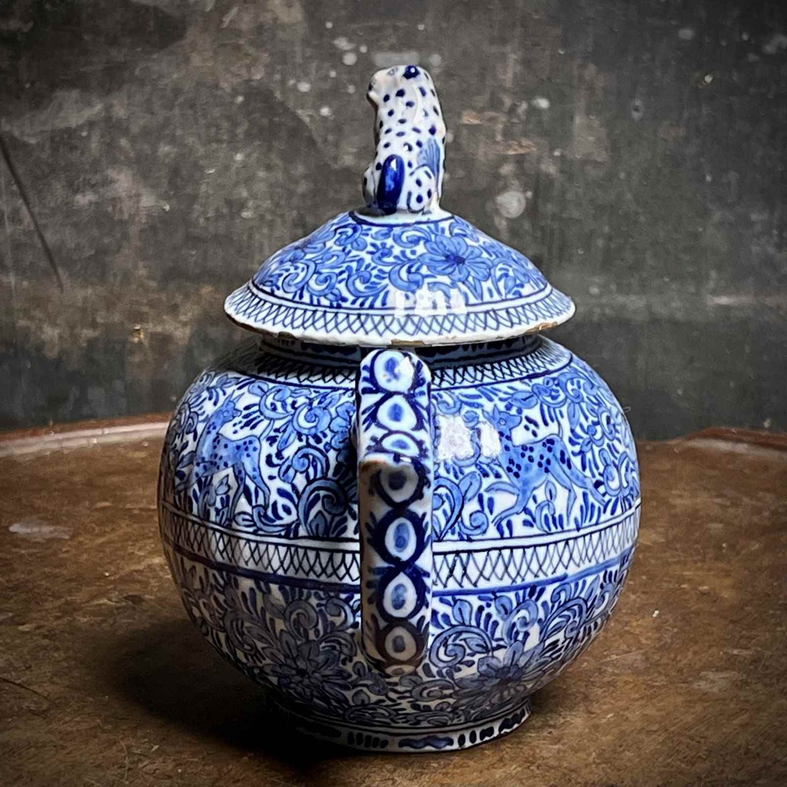 A rare and exceptionally well-preserved small and perfectly formed early 18th-century Dutch Delft blue and white teapot. Delicately and finely painted in cobalt with scrolling foliage, flowering branches and stylised animals in the Chinese taste. The domed cover retains its original seated spotted dog finial, a charming and characteristic feature.