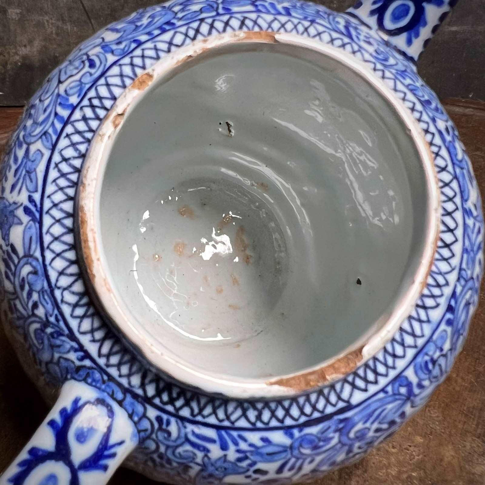 In wonderful condition: the original lid and finial are intact; the handle and spout are original; and only minor fritting to the rim reflects its early tin-glazed manufacture. Teapots of this earlier Delft period, especially signed examples retaining their covers and finials, are rare.