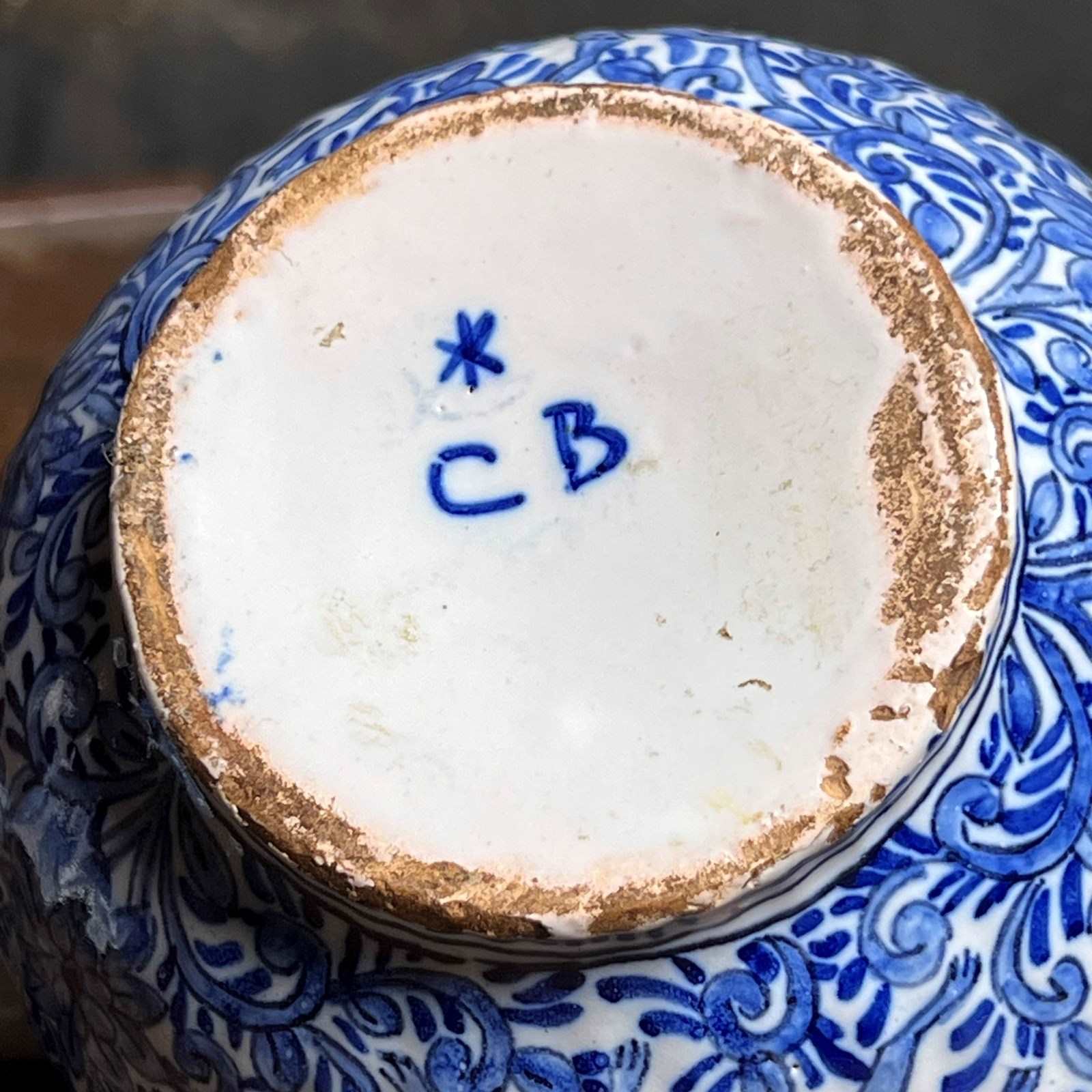 The globular body is decorated on all sides with large foliate panels framed by trellis and cross-hatched borders, typical of high-quality Delft faience of the period. The underside is marked in blue with a star above the initials C B, the documented device of Cornelis Brouwer, proprietor of the Delft pottery De Witte Ster (“The White Star”), active 1724–1738. Brouwer’s workshop is associated with vivid cobalt palettes, confidently brushed chinoiserie foliage and lively animal motifs, all clearly present here.