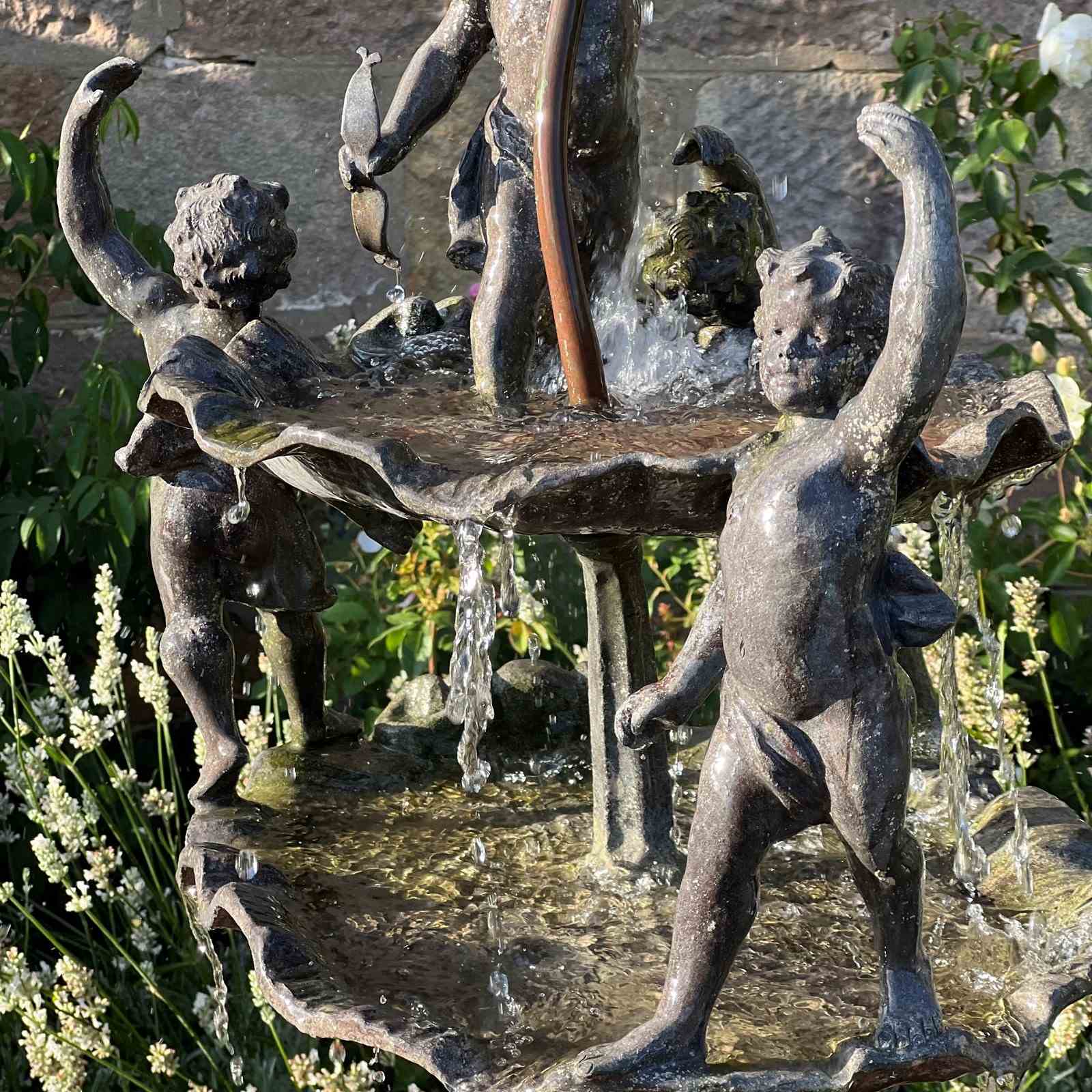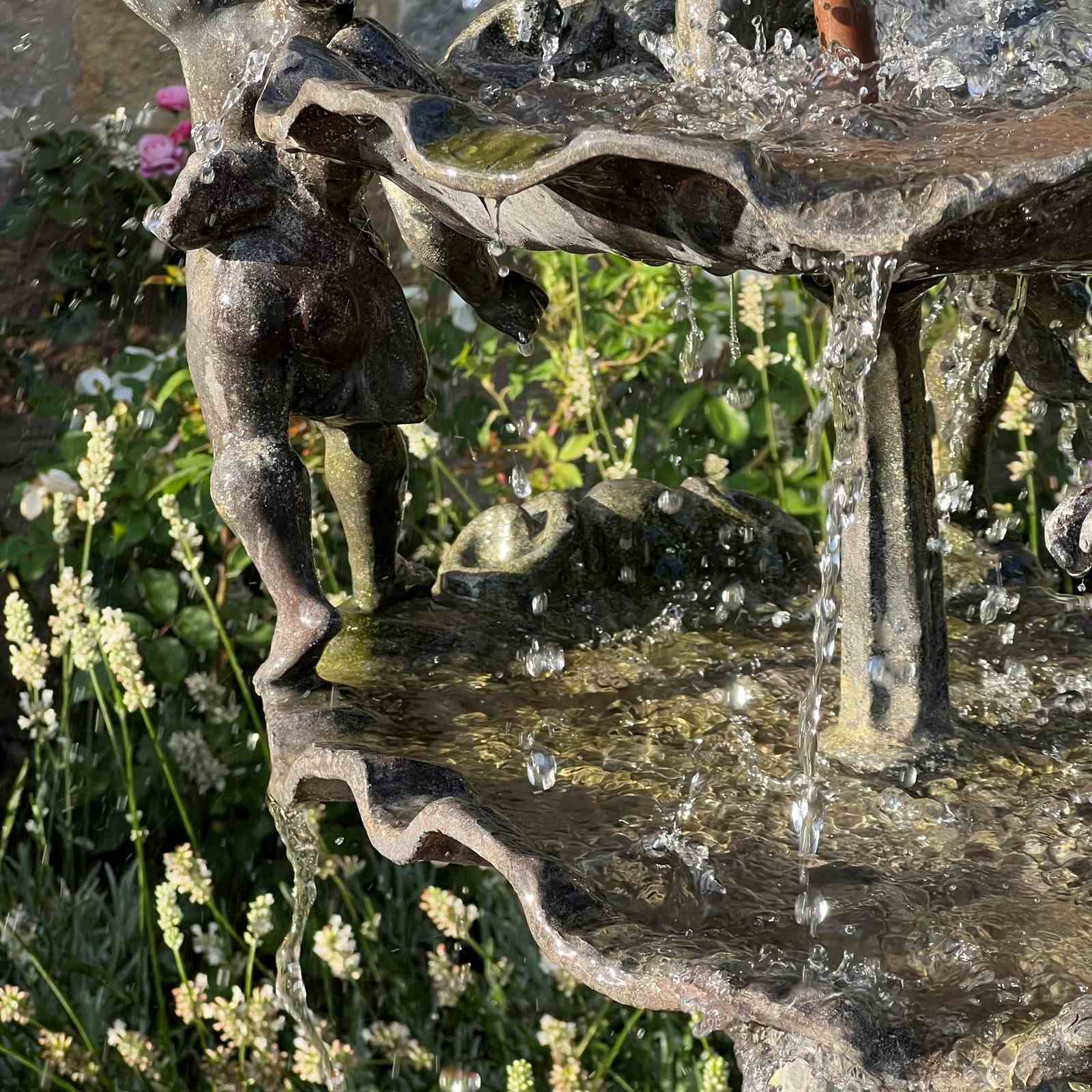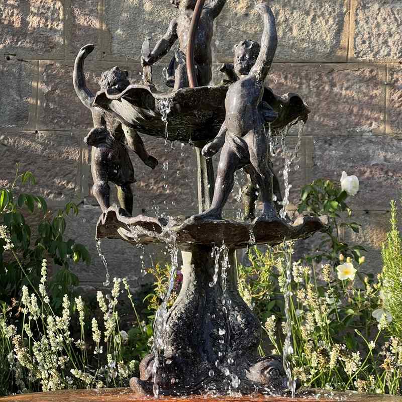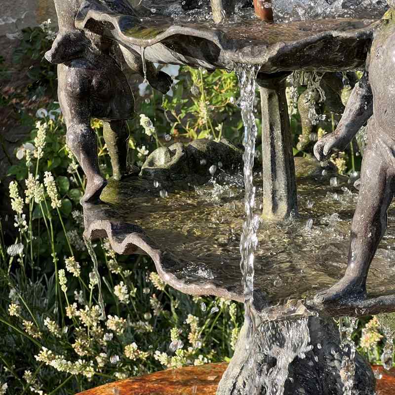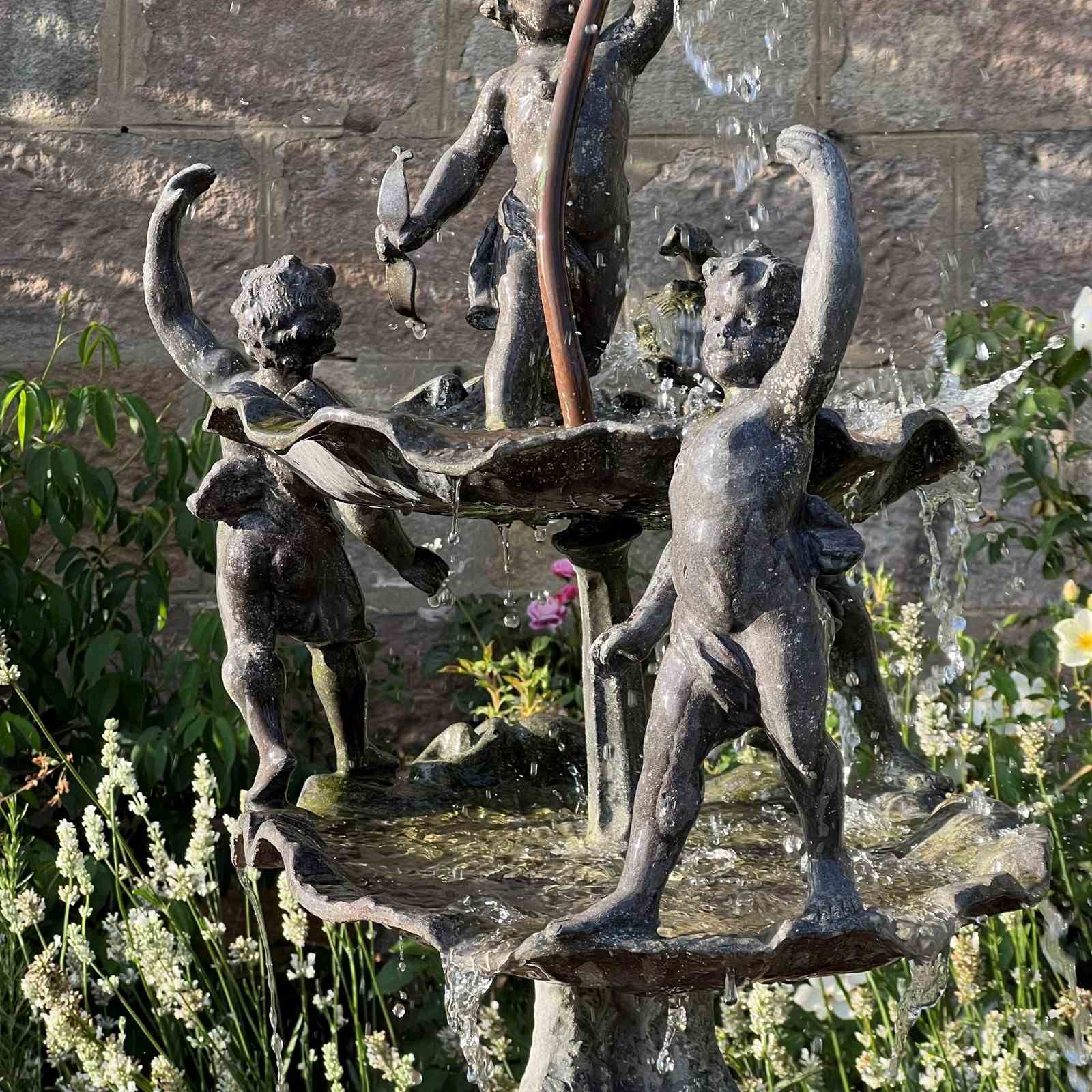 The fountain is richly detailed, with lively modelling and a naturalistic shell base. When plumbed, water rises through the central copper pipe and spills over the scallop bowls, enlivening the figures with movement and sound.
