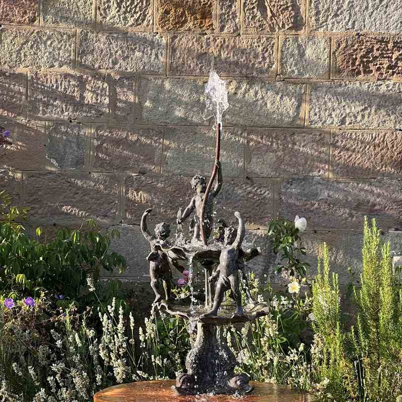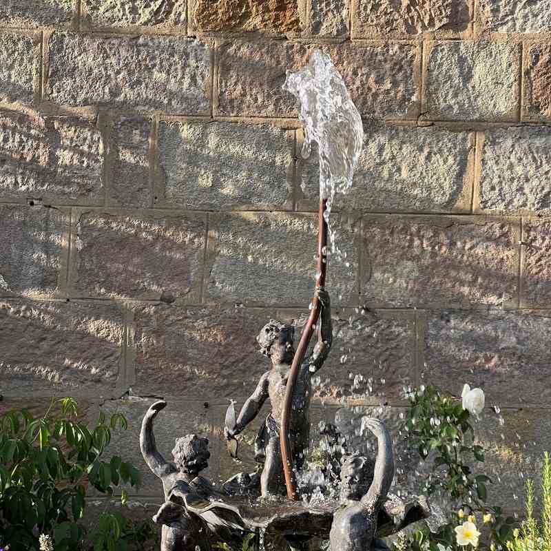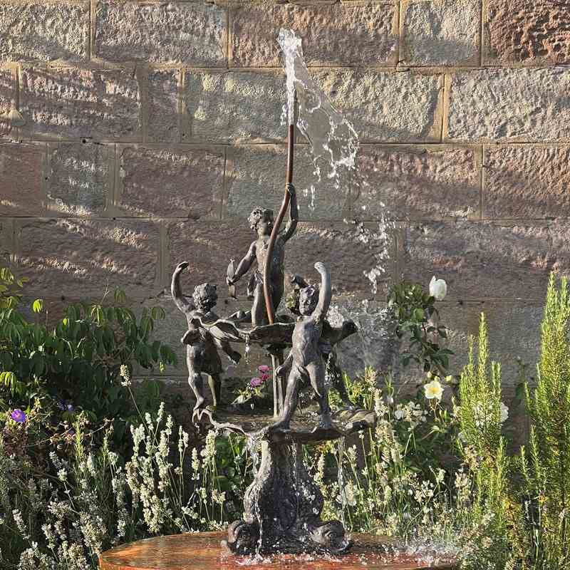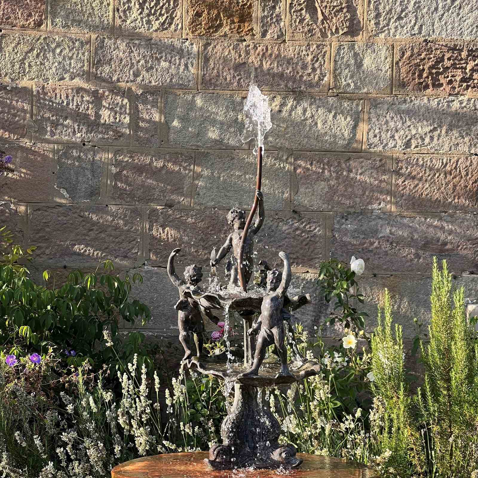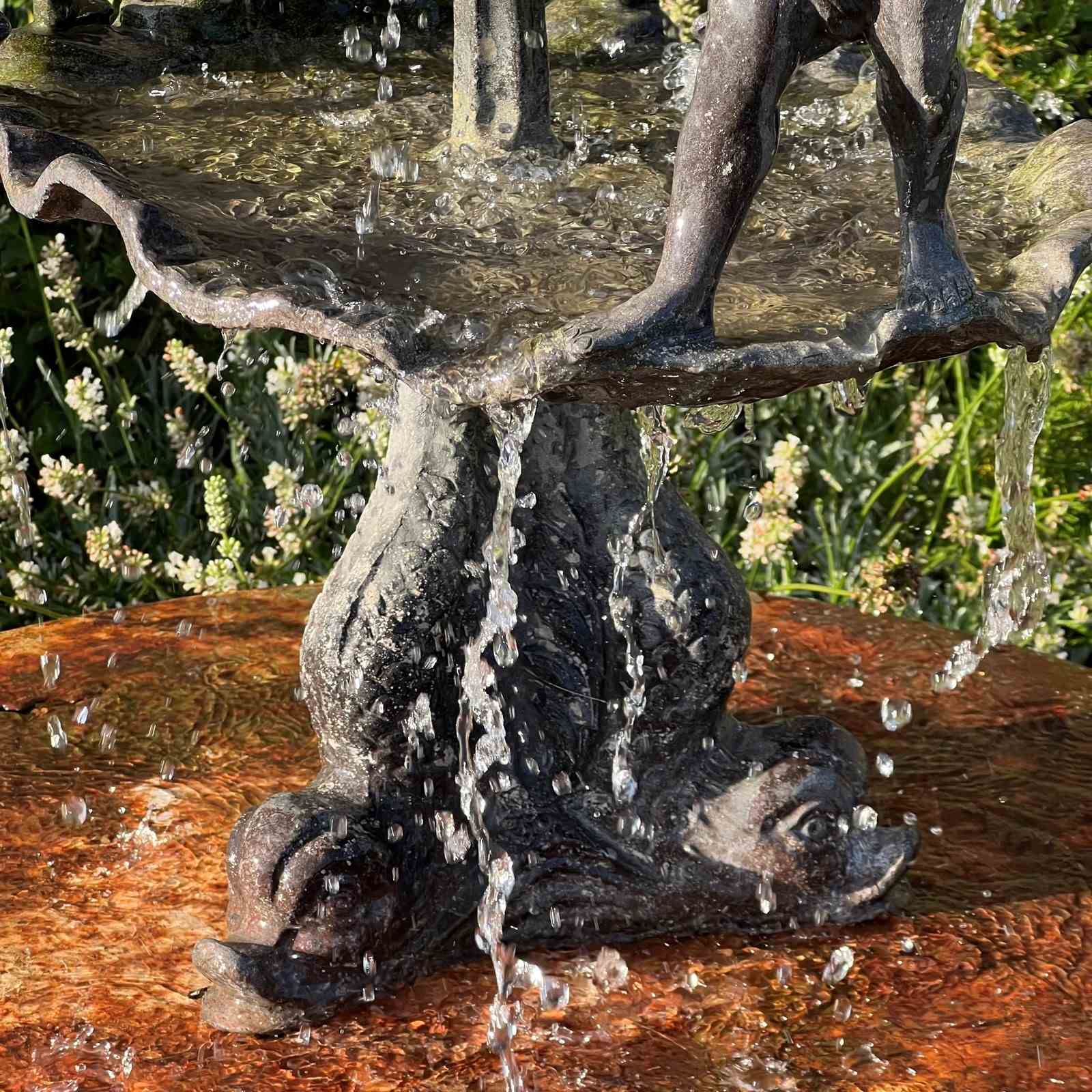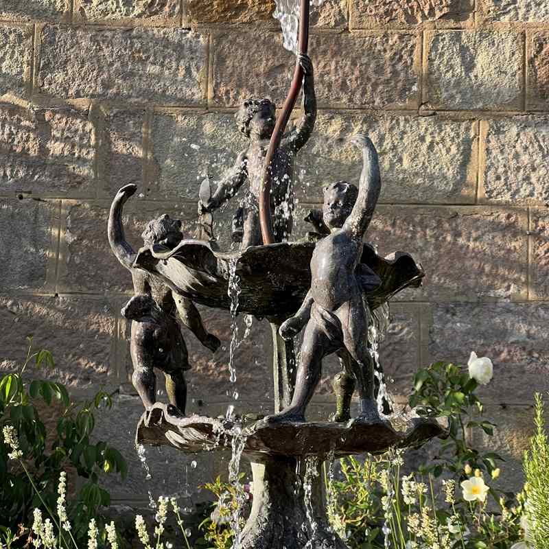 The fountain is richly detailed, with lively modelling and a naturalistic shell base. When plumbed, water rises through the central copper pipe and spills over the scallop bowls, enlivening the figures with movement and sound.