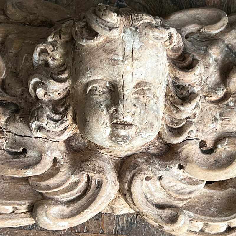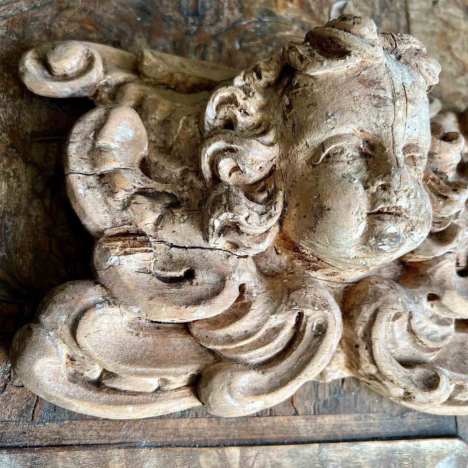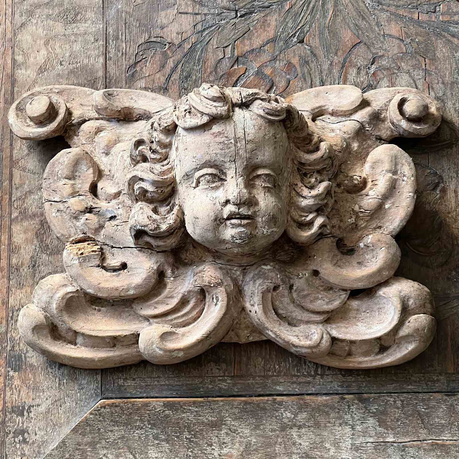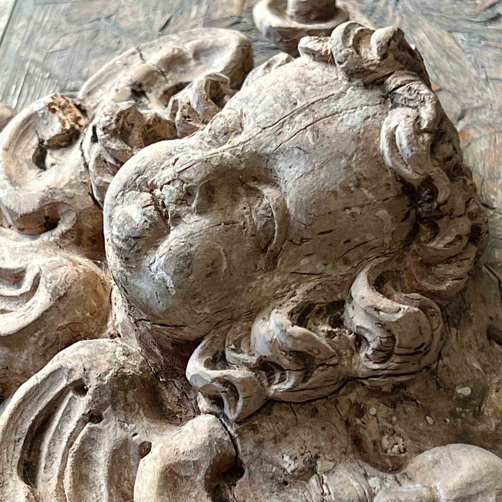The expressive putto is framed by deeply cut Baroque foliage, a motif widely used in ecclesiastical wood carving where cherub and angel figures animated the architectural ornament of altarpieces, tabernacles and frames.