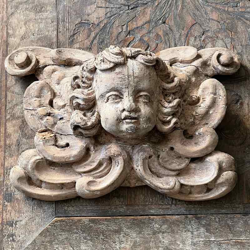 Italian Baroque Carved Limewood Cherub Or Angel Carving With Acanthus Scrolls, C