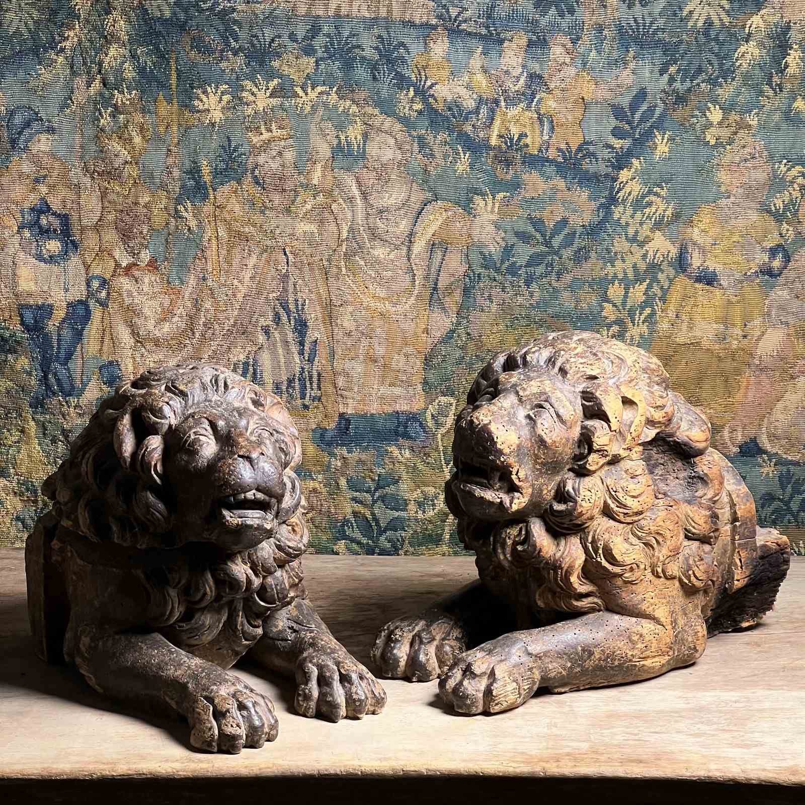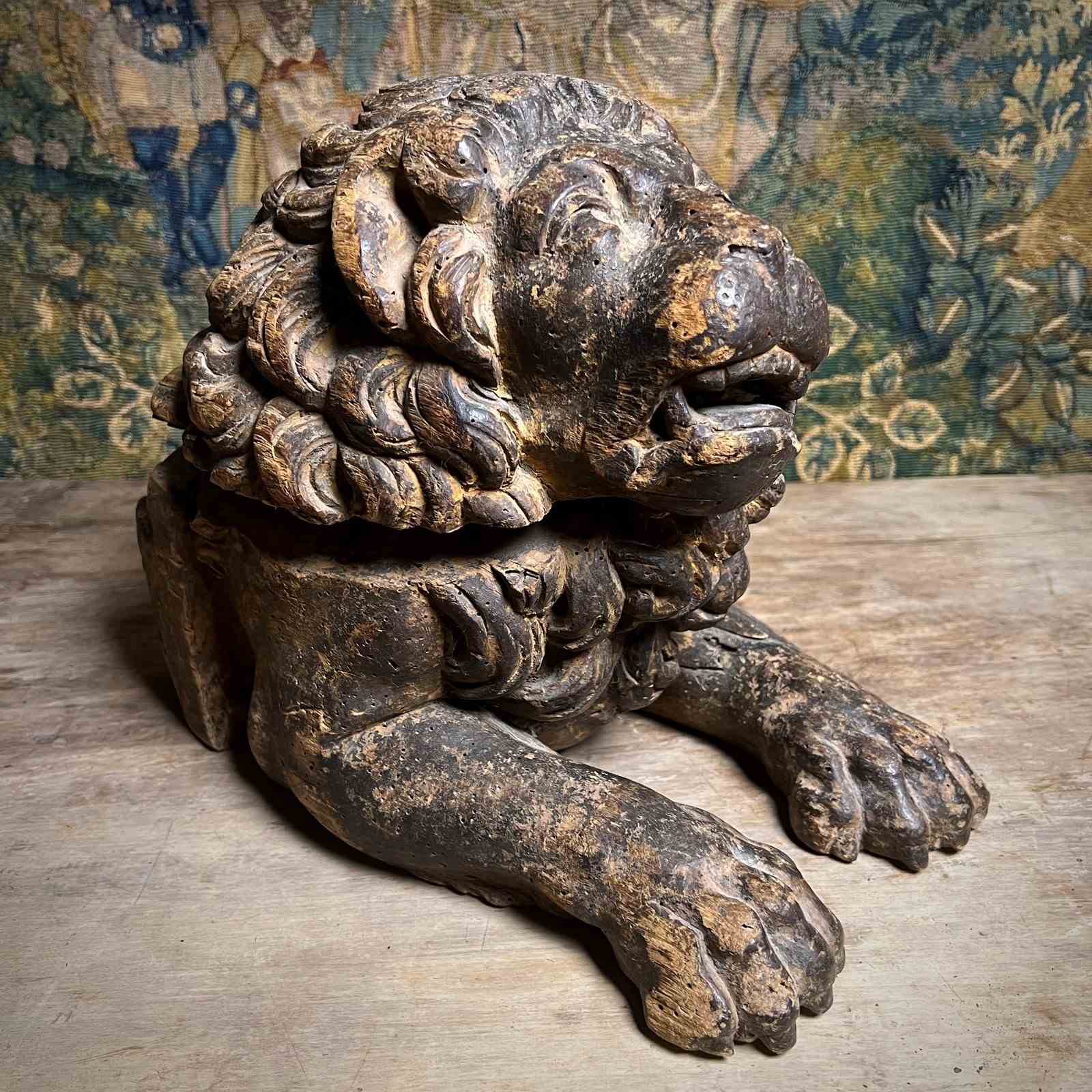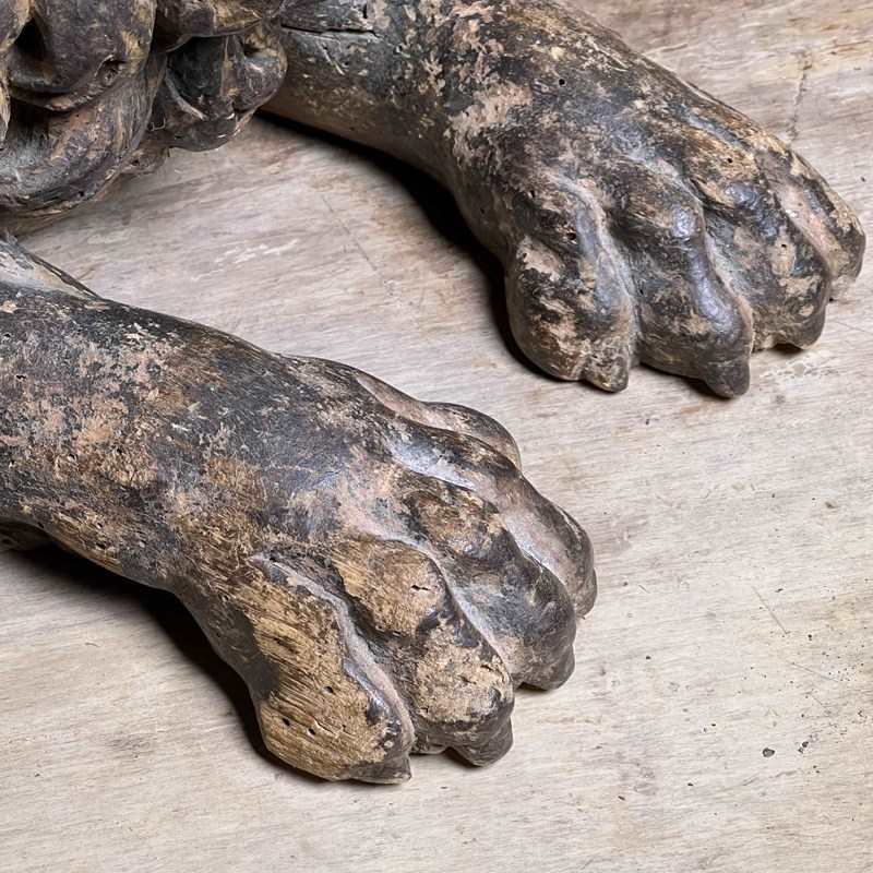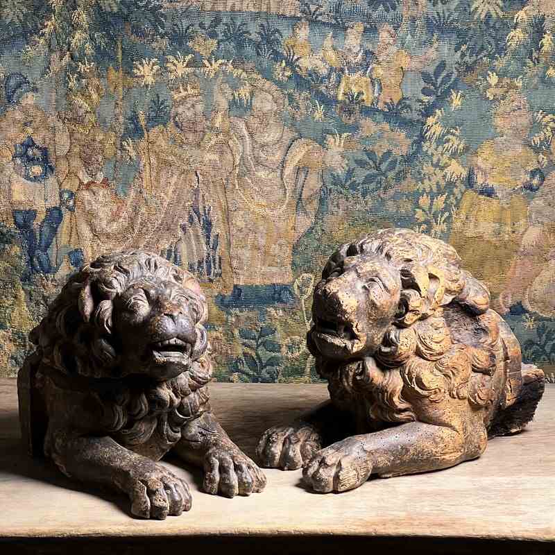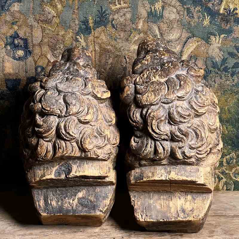 Boldly modelled as recumbent guardian lions, each figure is carved with a richly undercut, scrolling mane, heavy-lidded eyes and an expressive muzzle, creating dramatic depth and shadow in true Baroque fashion.