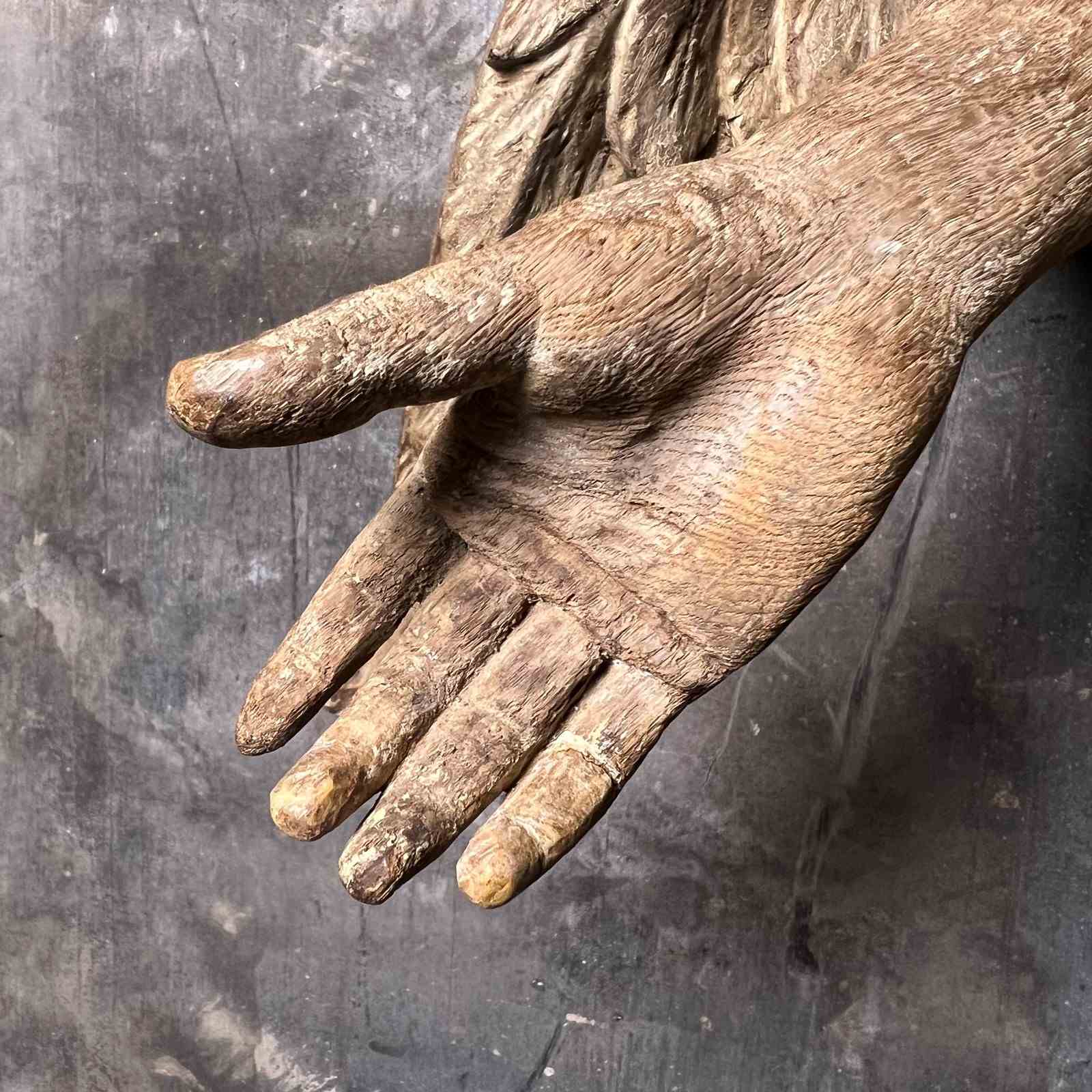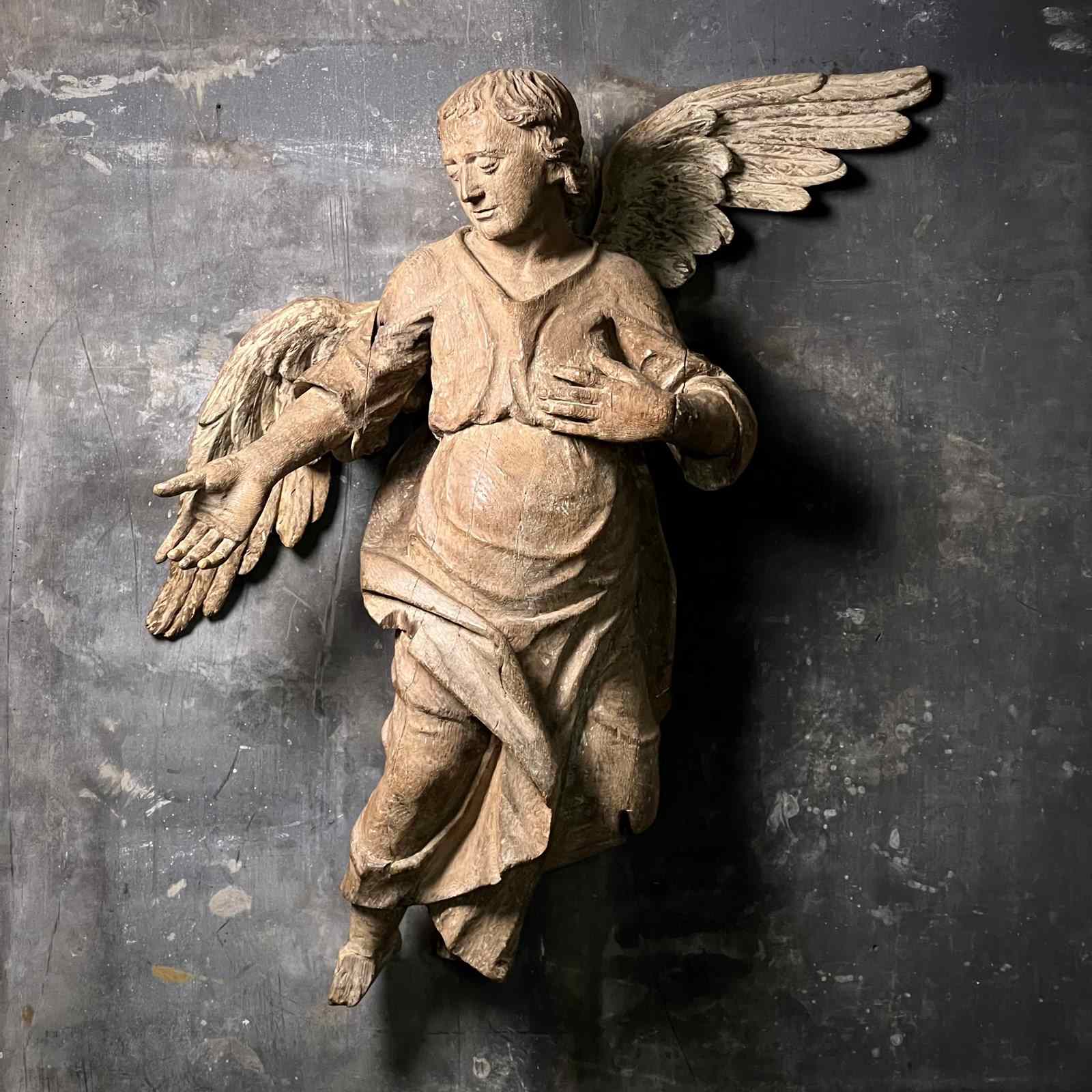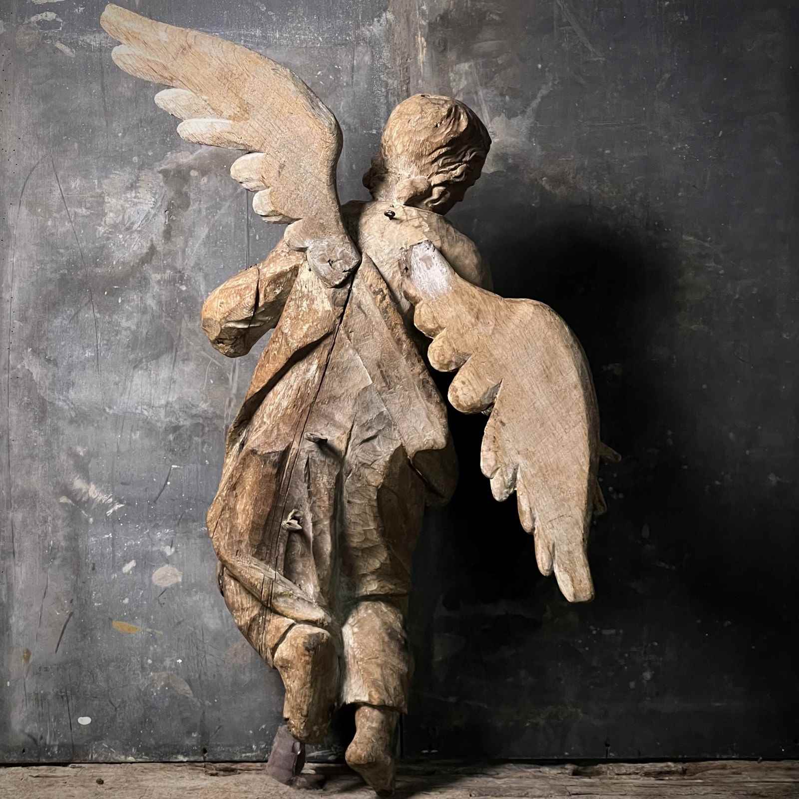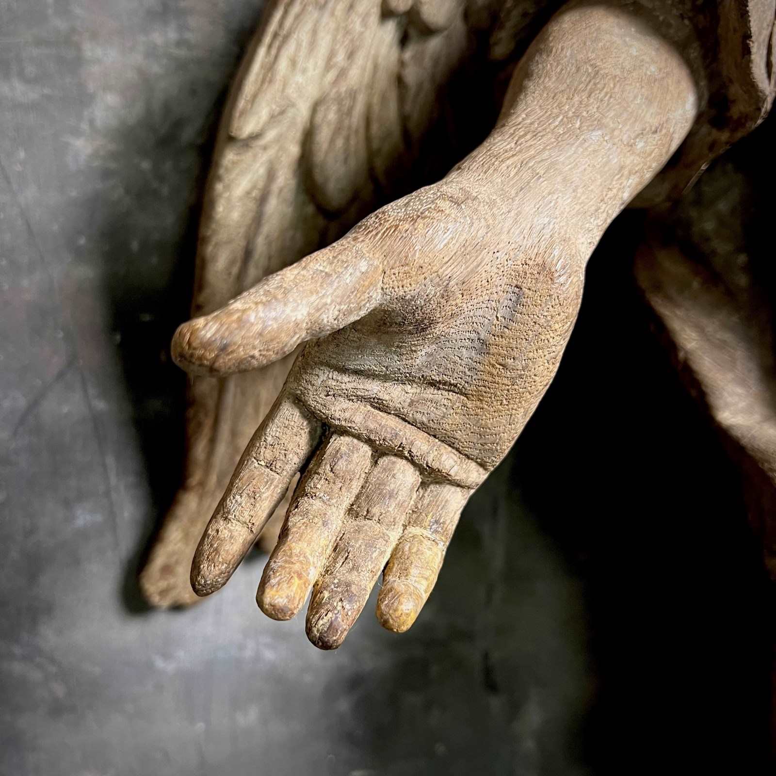 The angel survives in a complete state, retaining its original hands, feet, and wings — an increasingly rare feature for sculpture of this type. The hair is formed in thick, rhythmic locks, lending weight and balance when viewed in elevation, while the flowing drapery and extended wings create a magical sense of movement and lightness.
