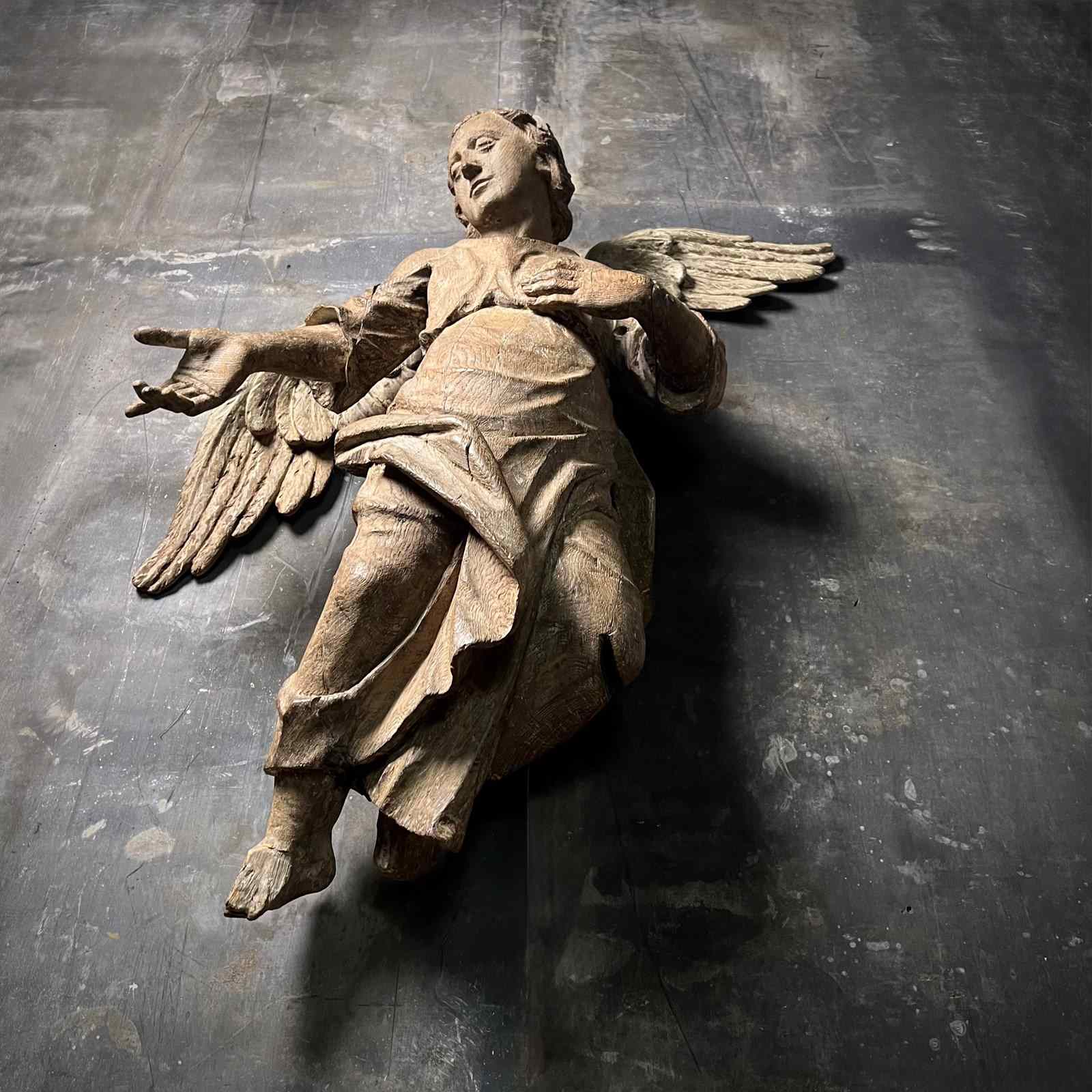 This beautiful carved wooden angel was originally created to be suspended within a Baroque altar or architectural frieze, forming part of a larger ecclesiastical ensemble. During the late 17th and early 18th centuries, Central Europe — particularly regions corresponding to present-day Bavaria, Austria, and the Alpine territories — was a centre of highly accomplished Baroque church sculpture. Figures of this type were designed to be viewed from below, hovering within altar structures and engaging directly with light, space, and movement.