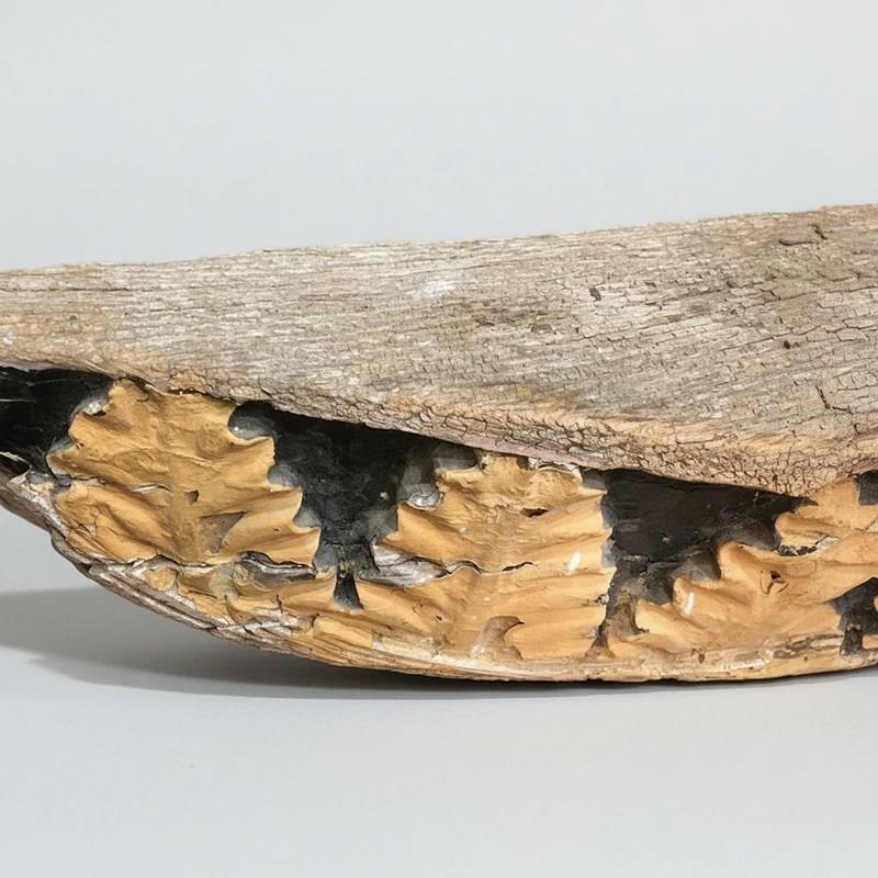 Acanthus ornament was the standard language of carved naval decoration in this era, appearing on stern fascias, quarter galleries and bulwark friezes. Here the leafwork is finished in a distinctive peach-toned paint layer over a darker ground — a palette consistent with painted ship ornament designed to stand out against the black hull and catch shifting light at sea.