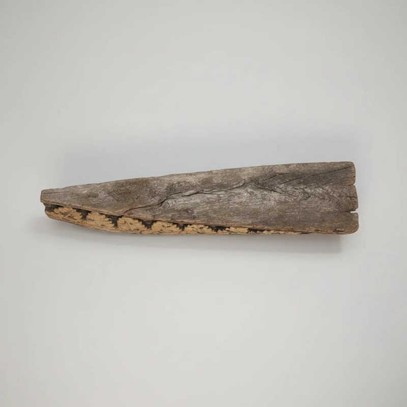 The surface—layered with age, pigment wear and salt-softened texture—suggests long service before the piece was reputably dislodged in combat, or removed when the vessel was later broken up. The gentle, hull-like curve and the exposed, weathered grain all reinforce its maritime character.
