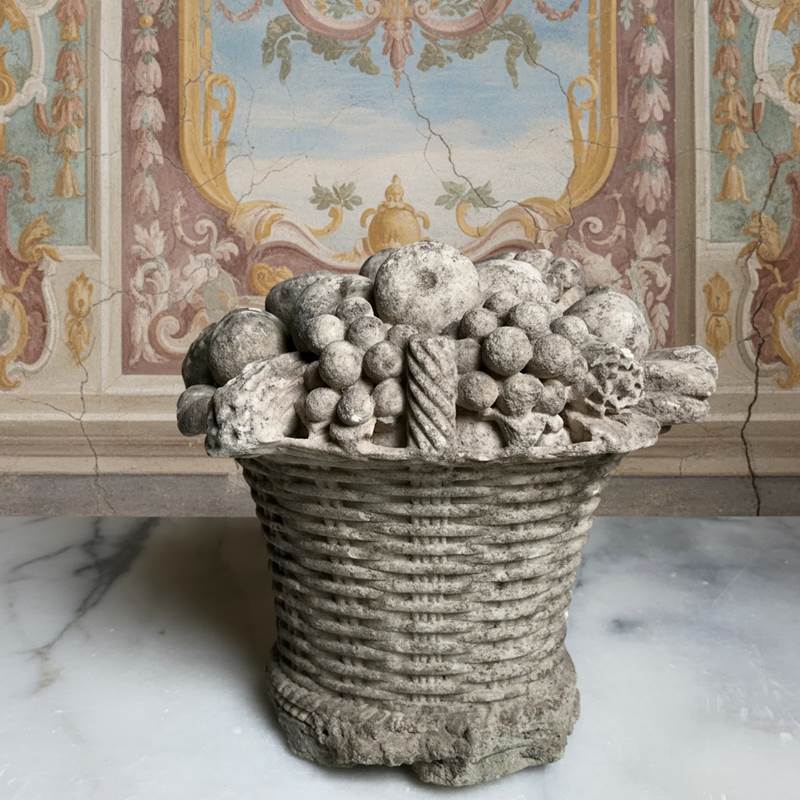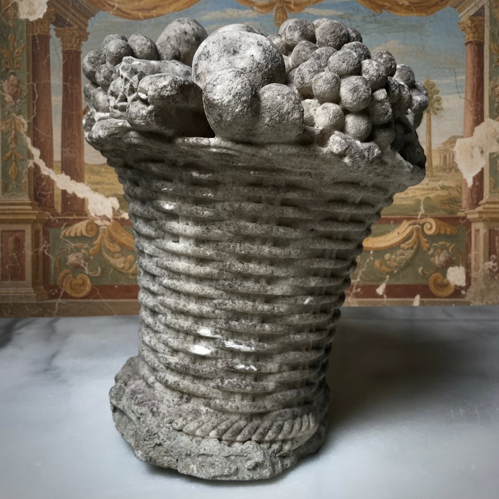 Exquisitely and realistically carved, this white marble basket overflows with a selection of fashionable fruits — luxuries that would have been rare and highly prized in the 18th century.