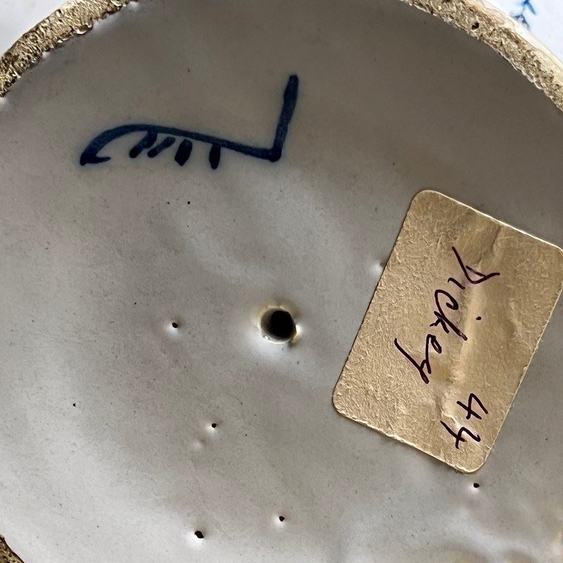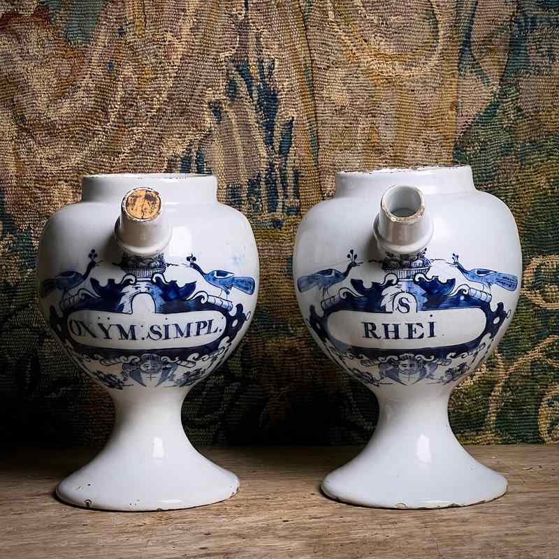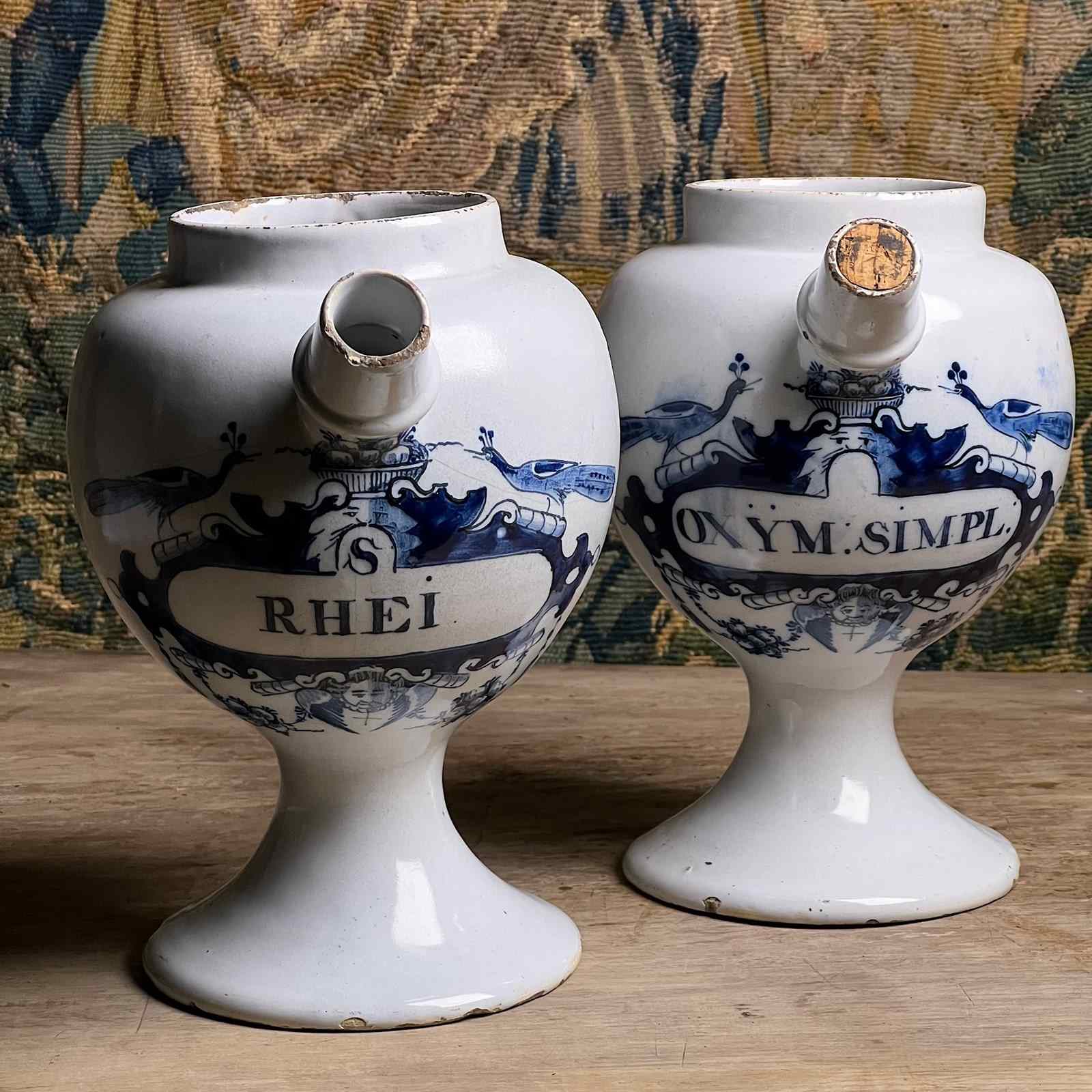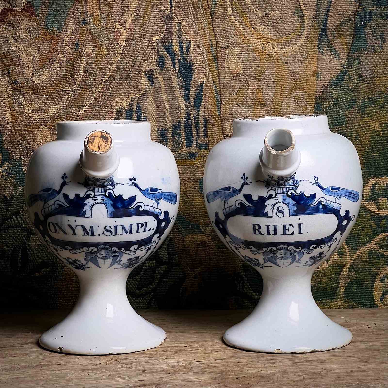 Each is raised on a tall pedestal foot and fitted with a side spout for pouring. One retains its cork stopper. Painted in rich underglaze cobalt, their bulbous bodies are wrapped with scrolling strapwork and bold cartouches with angelic faces and fruit filled baskets, inscribed “OXYM. SIMPL.” (Oxymel simplex — honey and vinegar) and “S. RHEI.” (Syrupus Rhei — rhubarb syrup), time-honoured preparations from the world of the early apothecary.