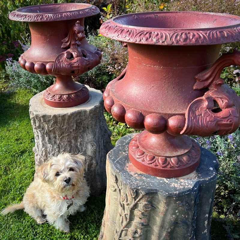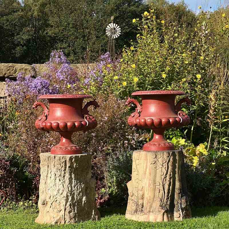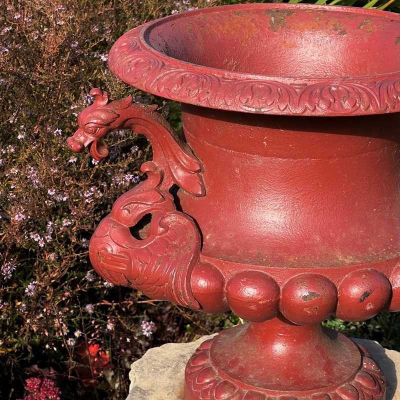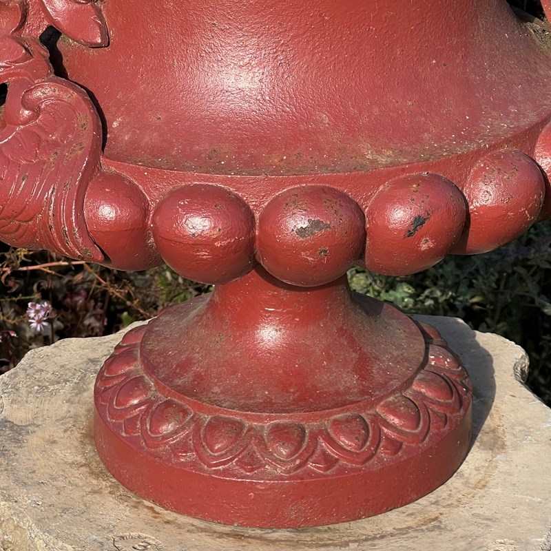 Cast in solid iron and retaining an older painted surface in deep red, the urns follow 19th-century classical revival designs, reflecting the continued taste for architectural ornament in English gardens well into the 20th century. Their surface finish has weathered attractively, giving a warm patina and a quiet, sculptural character suited to both traditional and contemporary settings.