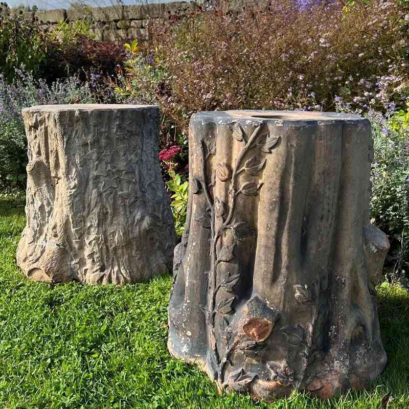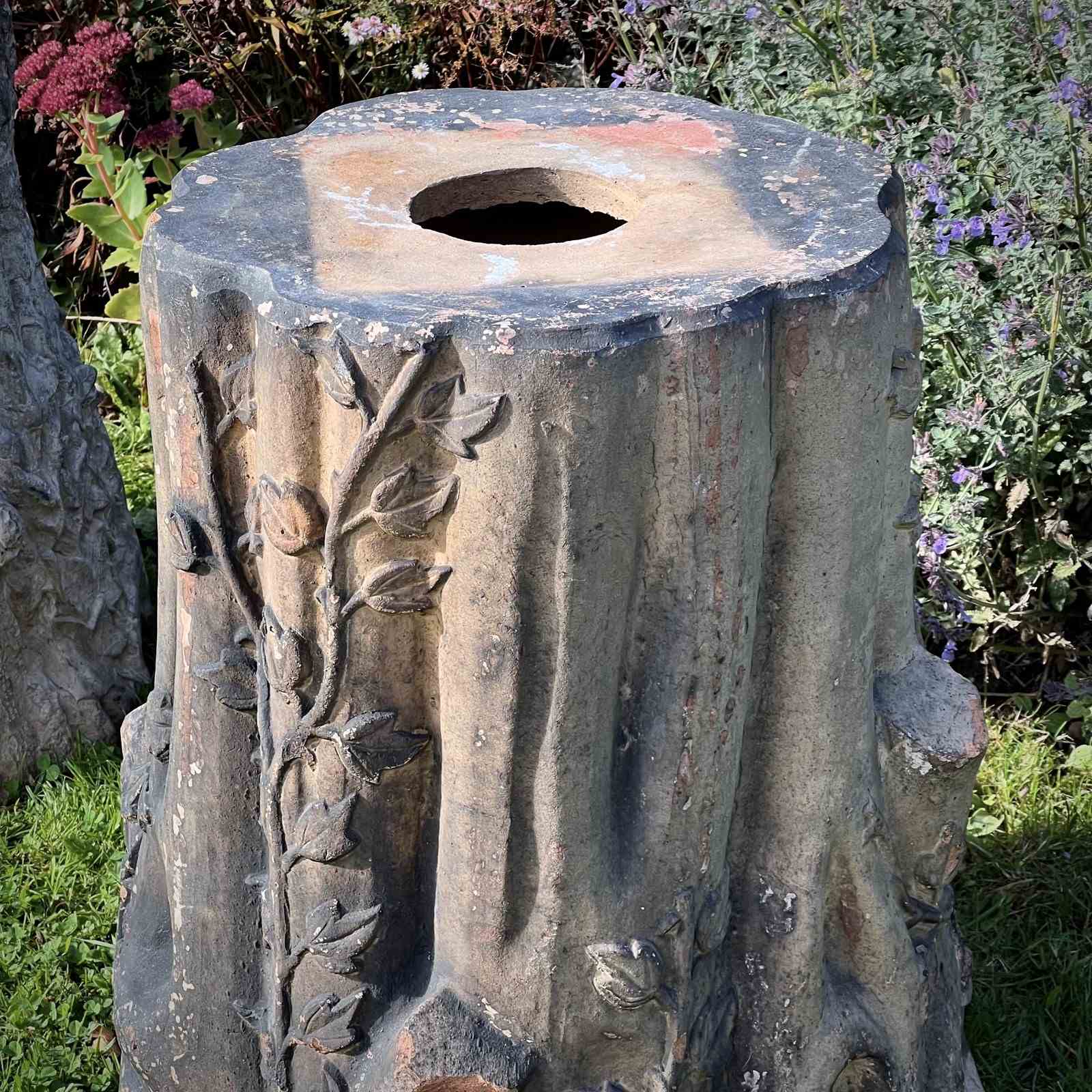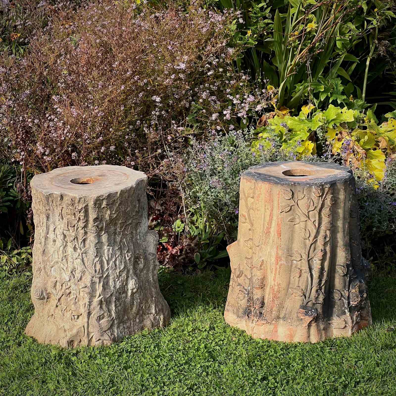 Each formed as a tree stump entwined with ivy vines and detailed with naturalistic bark patterning. One example bears the impressed maker’s mark “GIBBS & CANNING / TAMWORTH.” Their richly weathered surfaces, and gentle lichen growth, give them the perfect character for a stumpery or woodland garden setting.