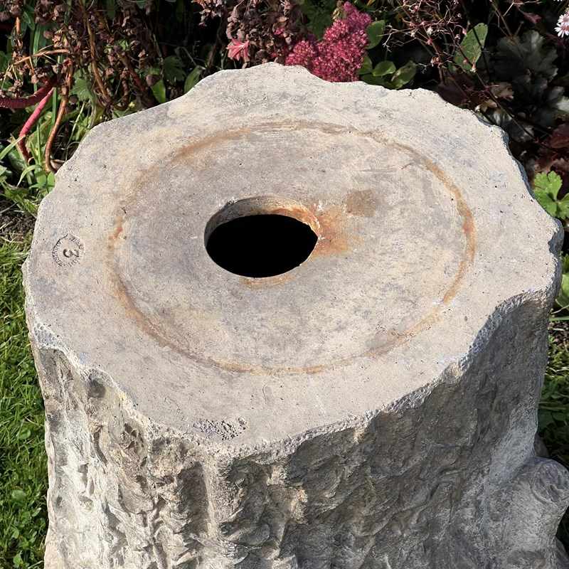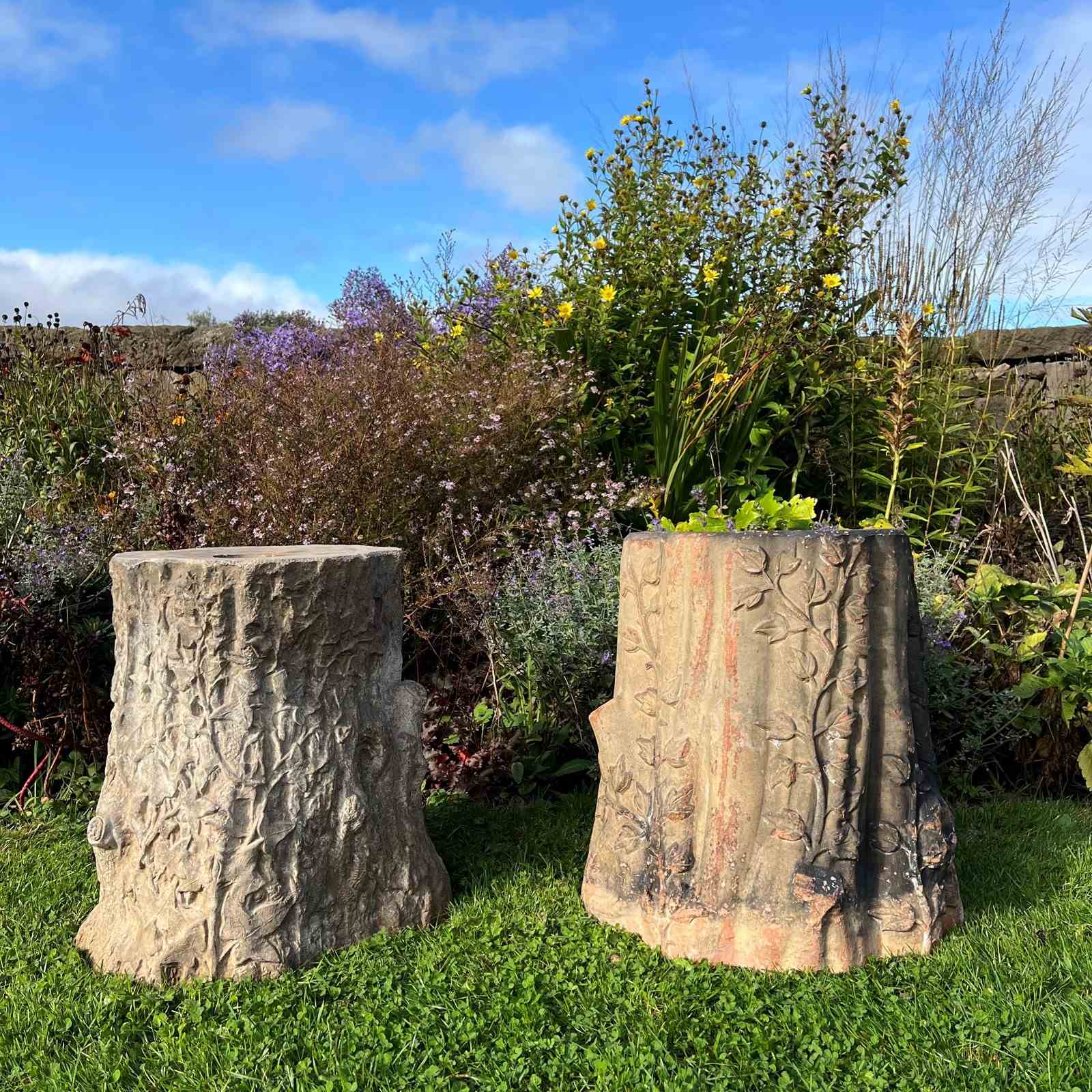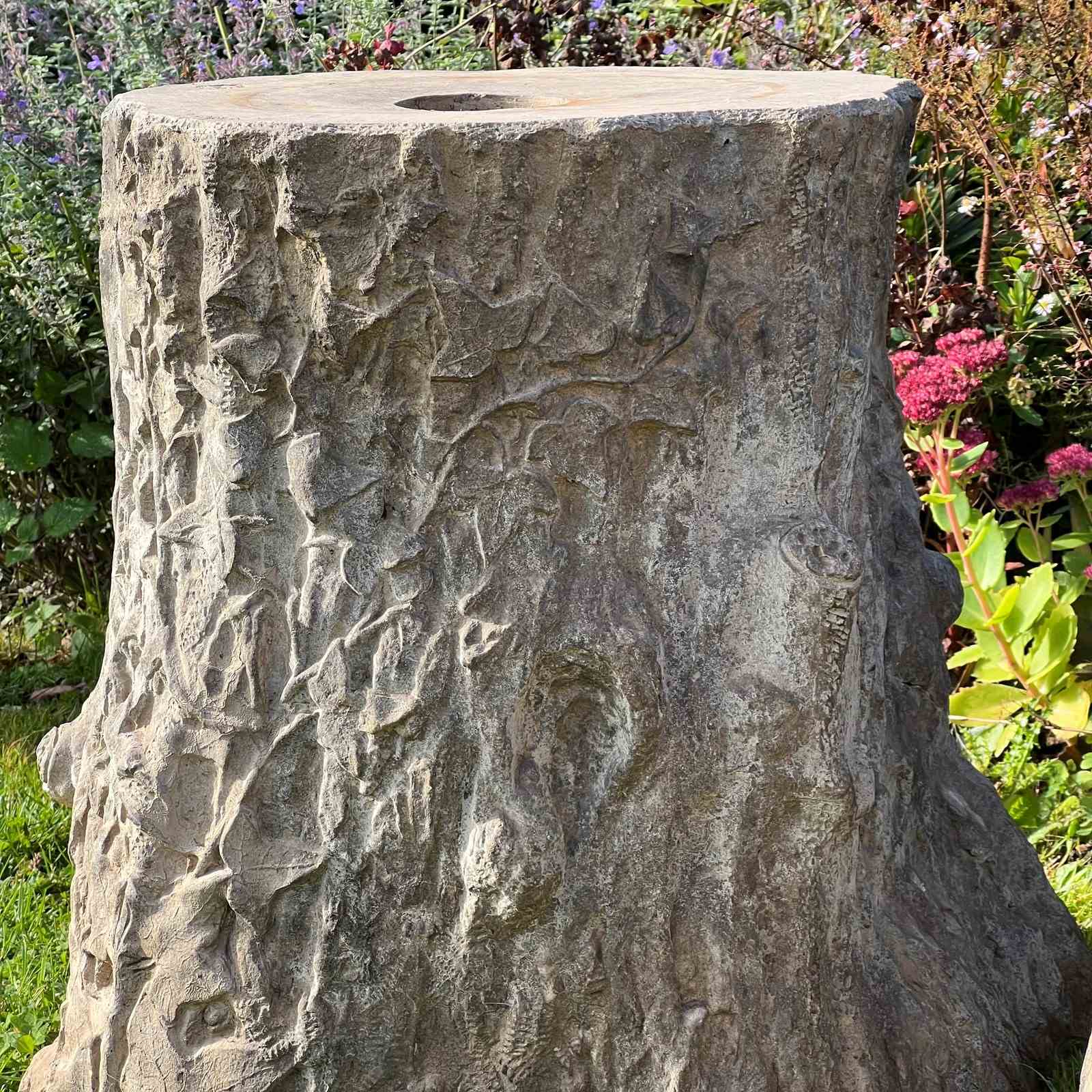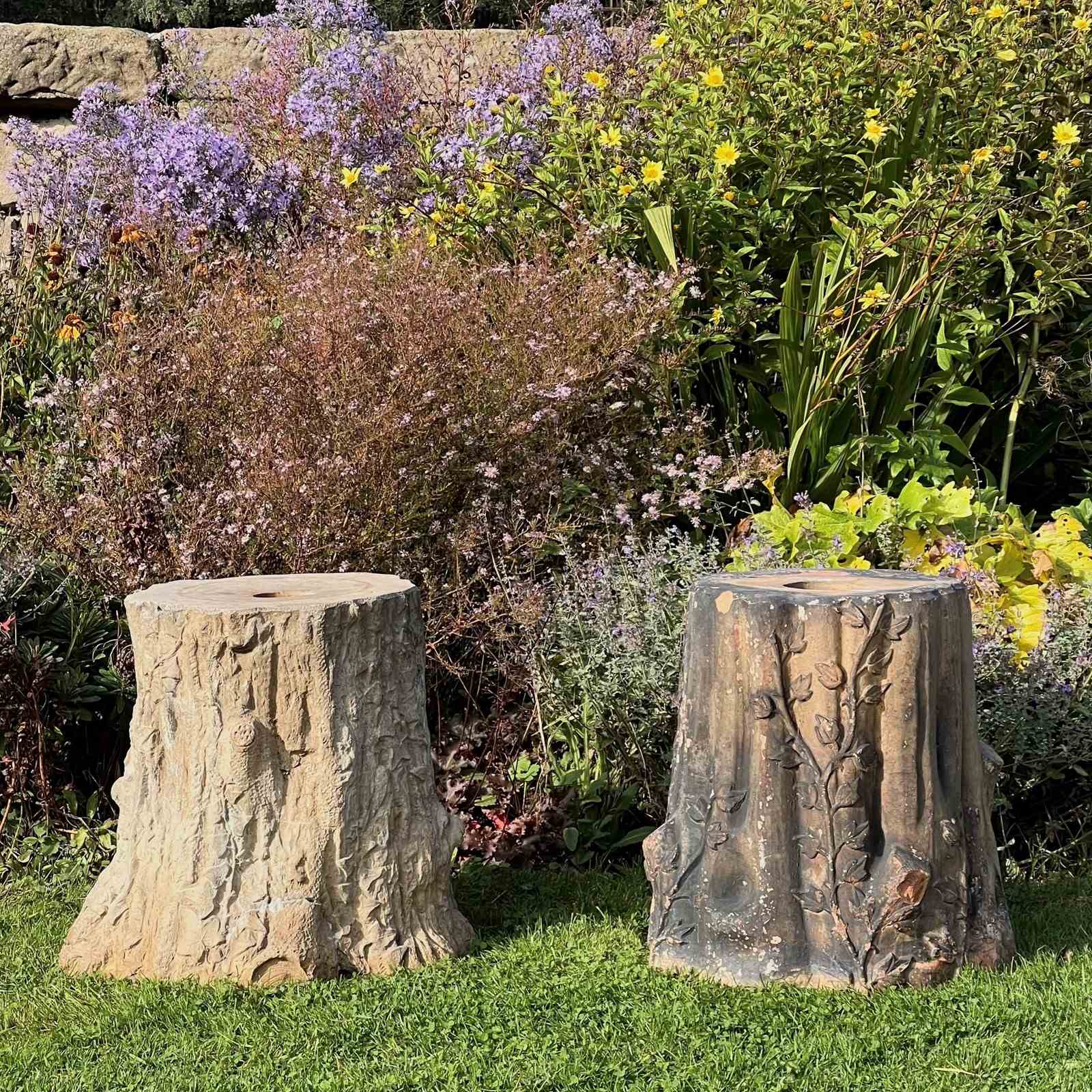 Each formed as a tree stump entwined with ivy vines and detailed with naturalistic bark patterning. One example bears the impressed maker’s mark “GIBBS & CANNING / TAMWORTH.” Their richly weathered surfaces, and gentle lichen growth, give them the perfect character for a stumpery or woodland garden setting.