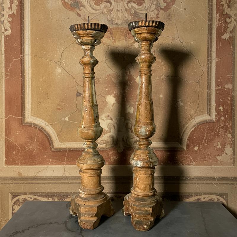 The baluster stems rise from scrolled tripod feet, their generous profiles and architectural rhythm typical of Northern Italian Baroque and early Rococo church furnishings. Each retains its original iron pricket and drip tray. The reverse sides are traditionally left plain, an authentic detail confirming their ecclesiastical origin.
