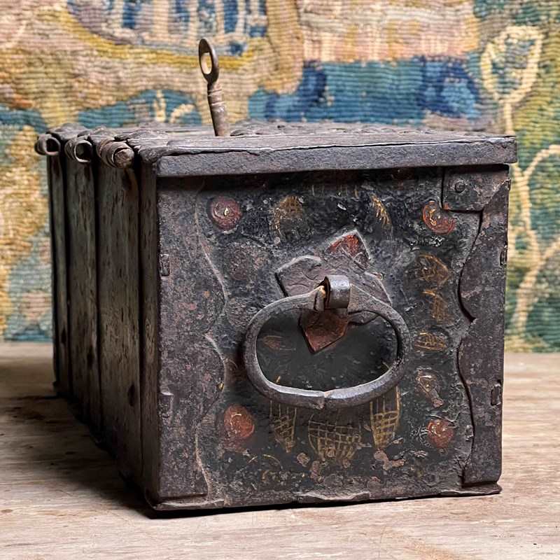Iron coffrets of this type were used for the secure storage of money, documents and other small valuables, and examples surviving with original painted decoration and complex locking systems are increasingly scarce.