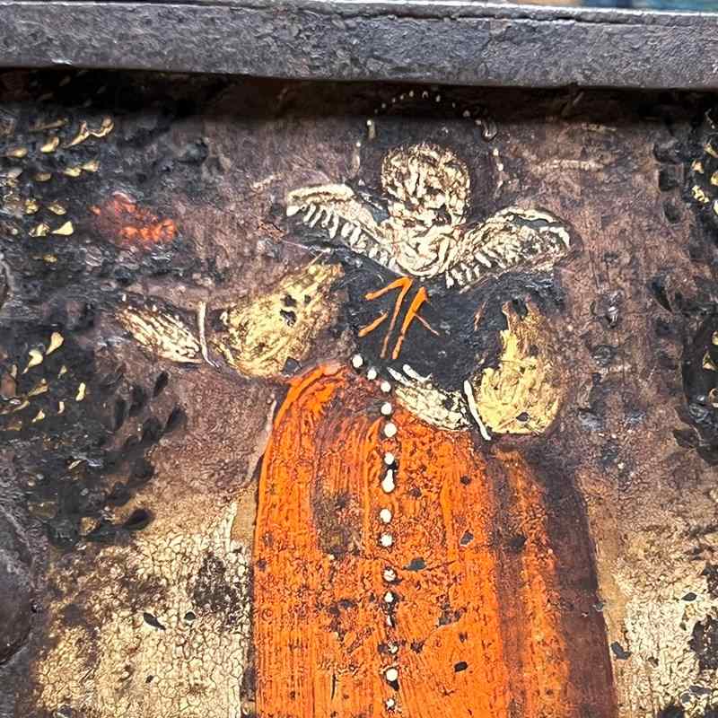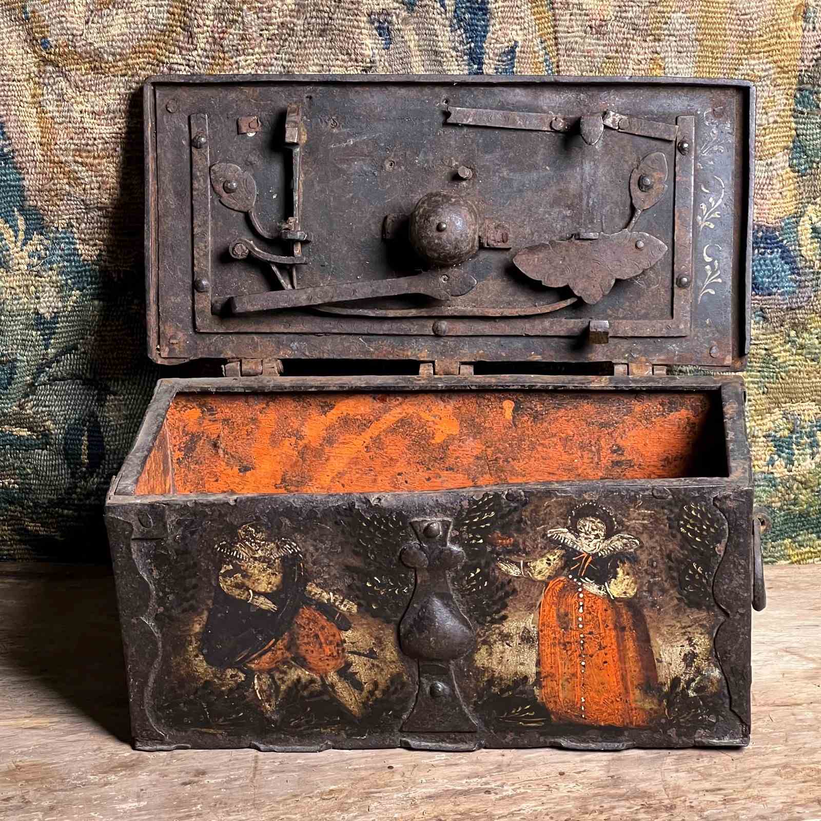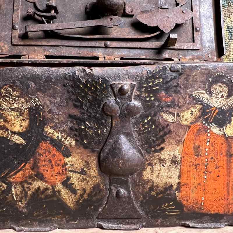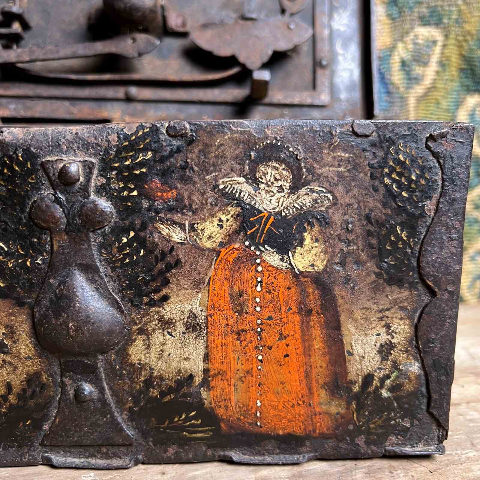 The rectangular coffret is constructed of iron panels held by armoured and hand-forged wrought iron straps, secured with heavy rivets and ornamented with quatrefoil-headed studs. The front panel retains original polychrome decoration, depicting two winged figures, one with a halo, rendered in contemporary late Renaissance dress, including ruffled collars, flanking a faux central lock plate.
