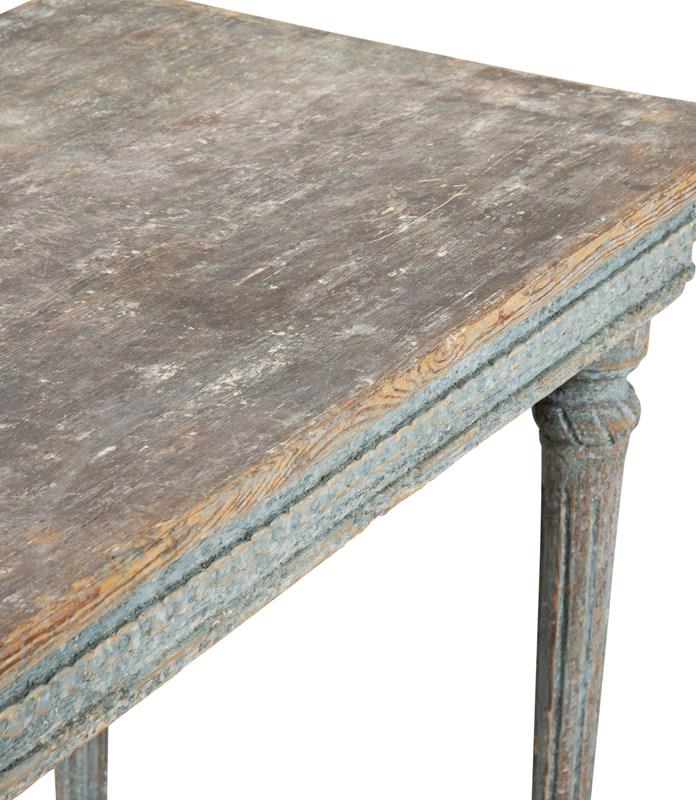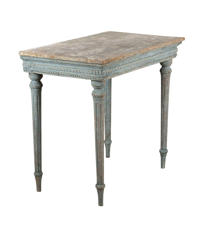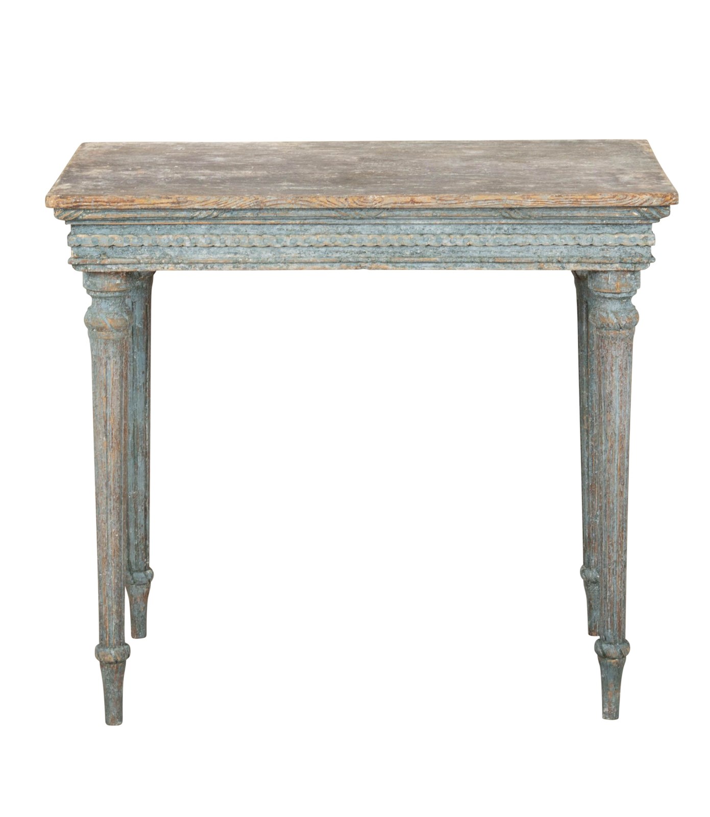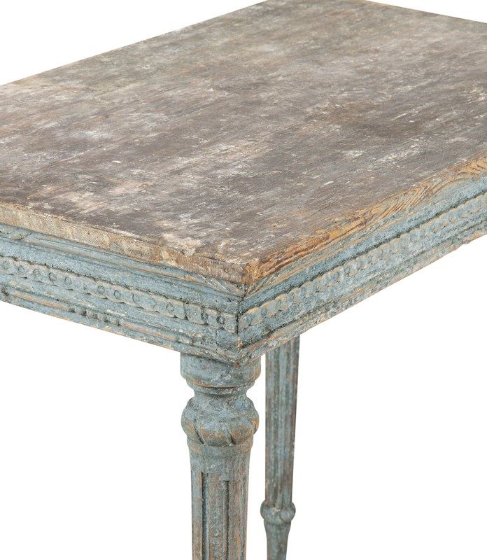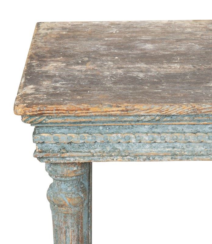 Decorative carved detailing around three sides, carved and turned legs and repainted in soft blue.