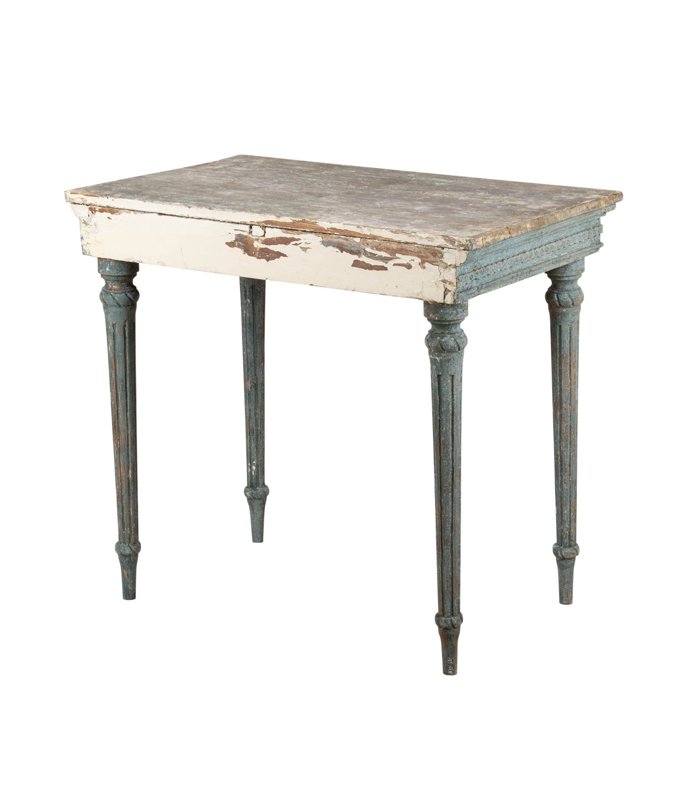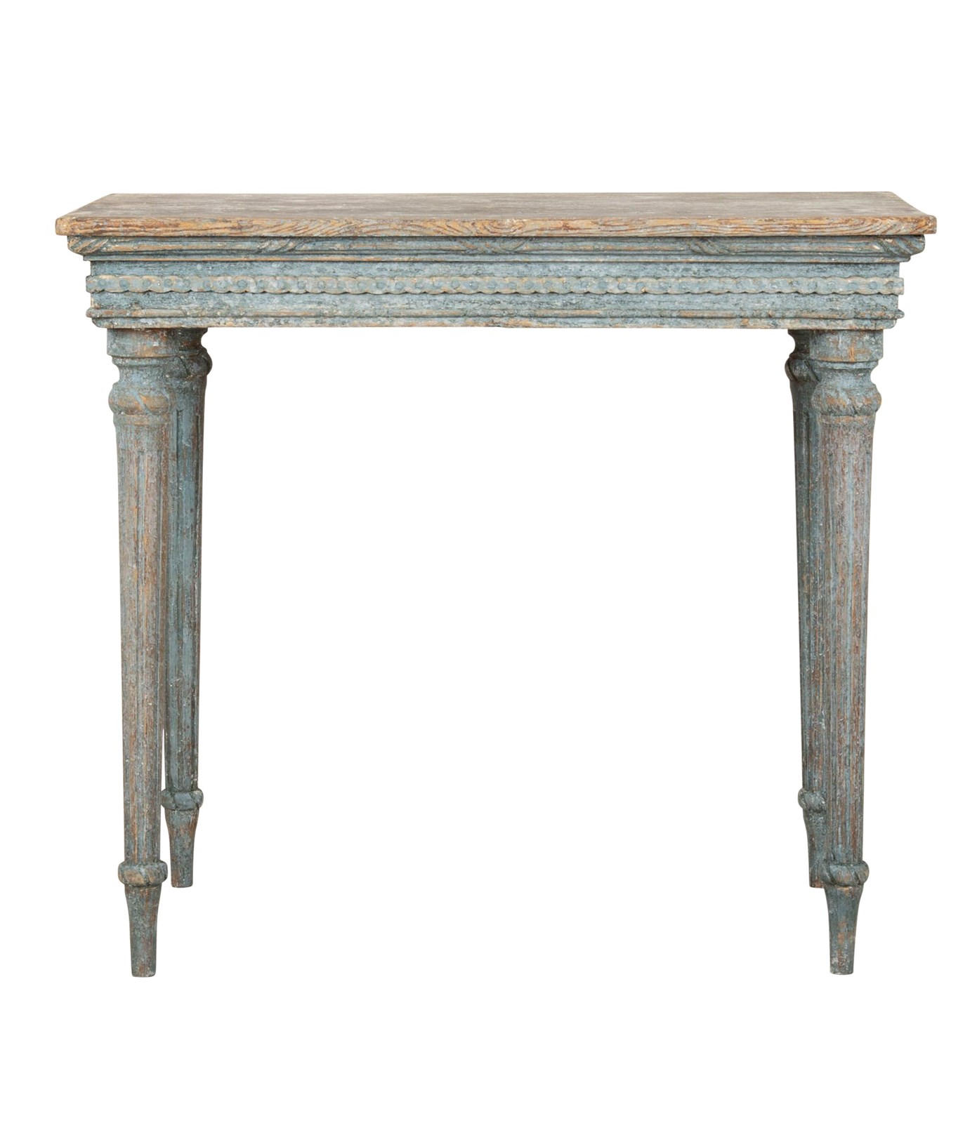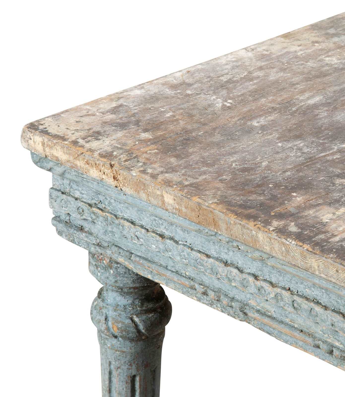 Decorative carved detailing around three sides, carved and turned legs and repainted in soft blue.