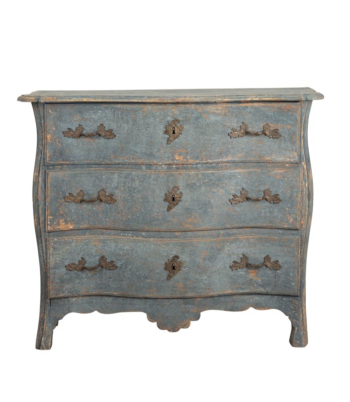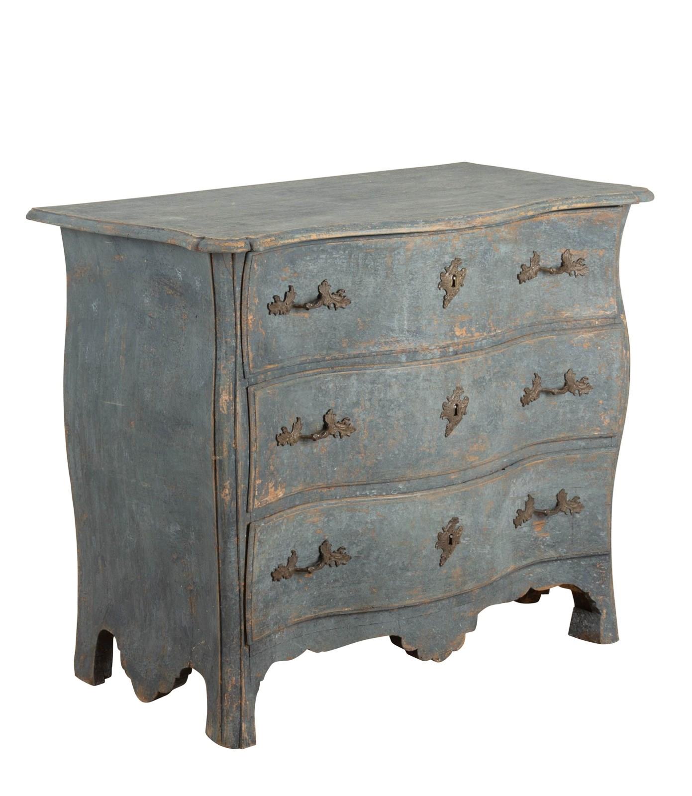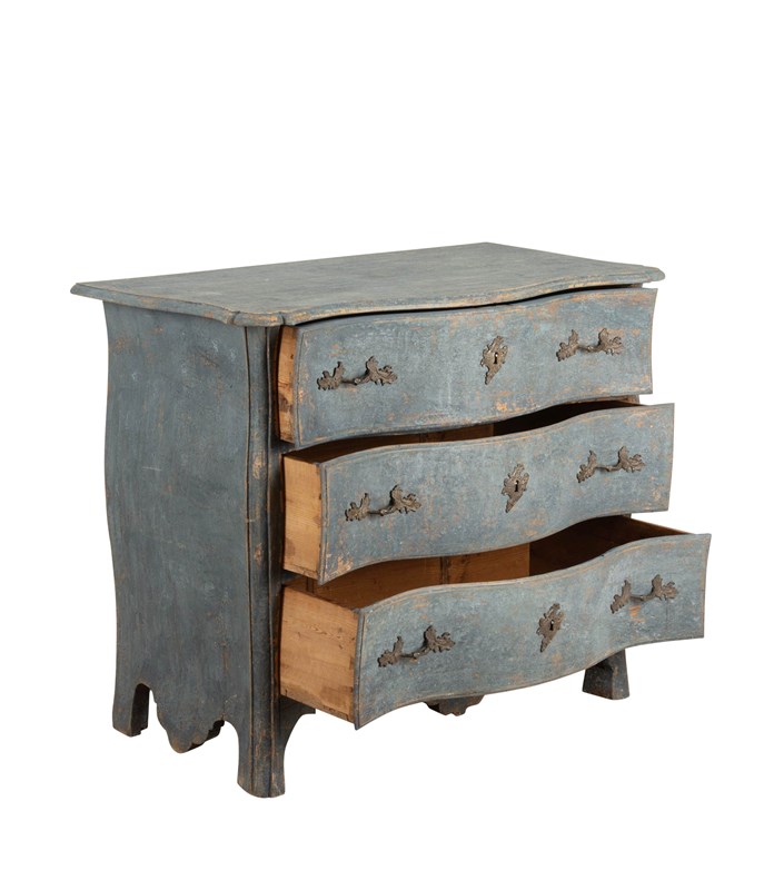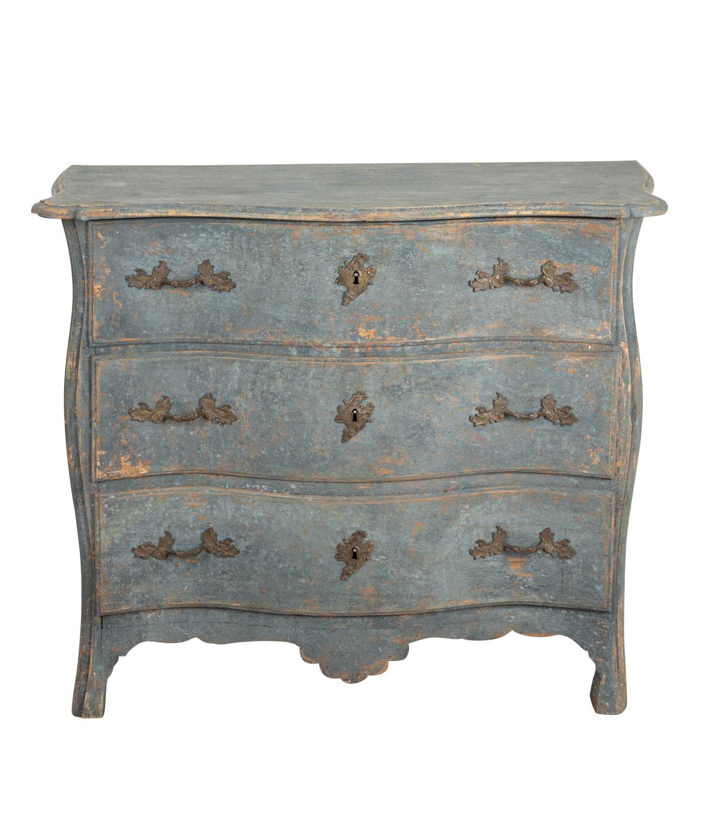 Elegant, tall and with narrow proportions. With serpentine front and three drawers, repainted in soft blue.