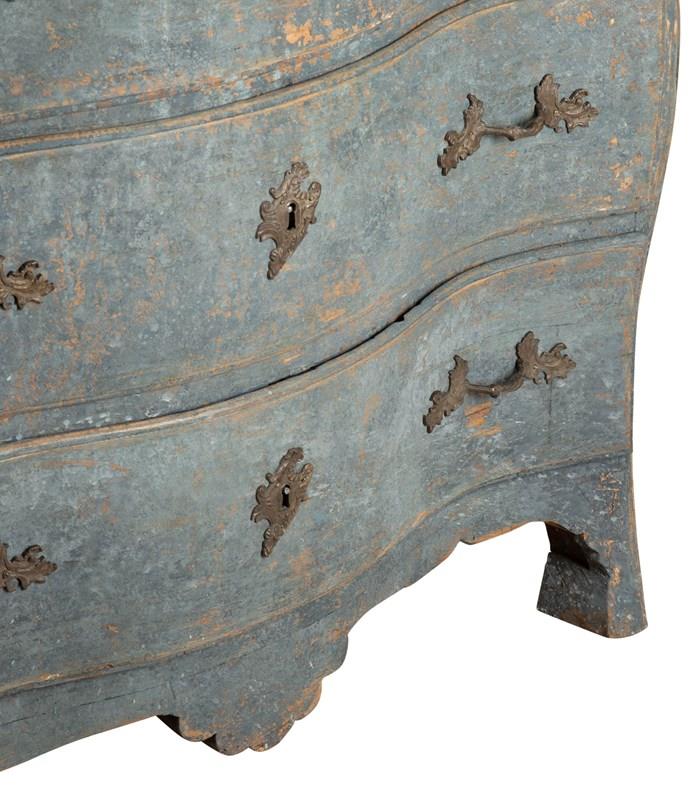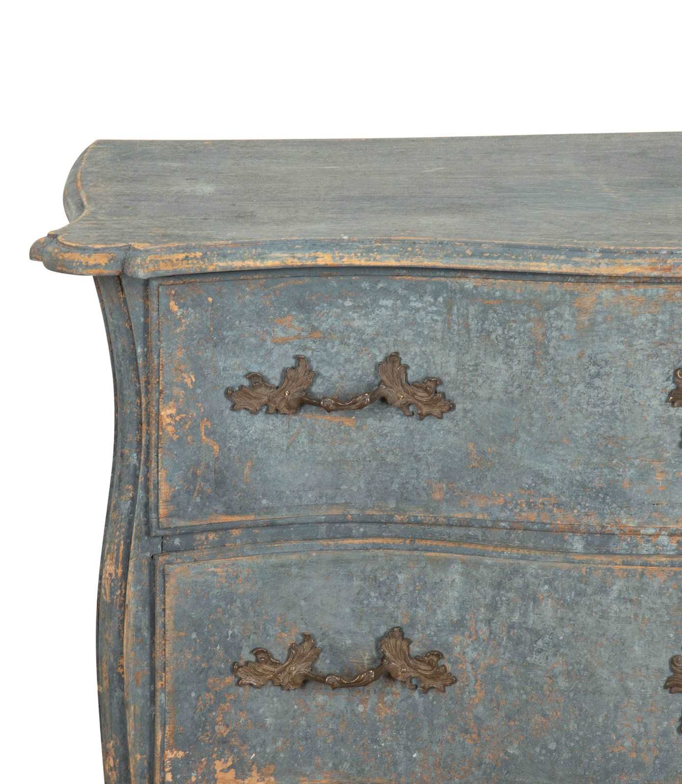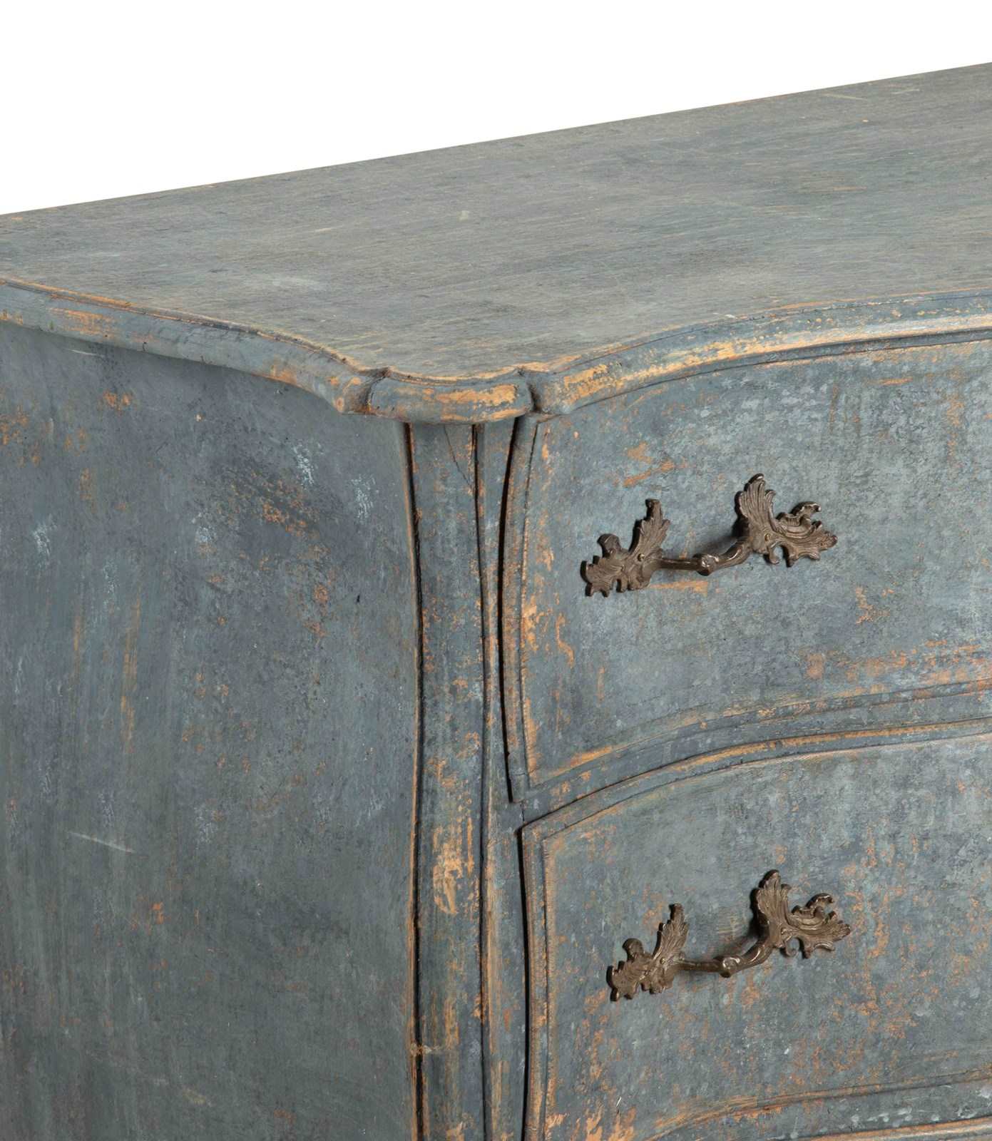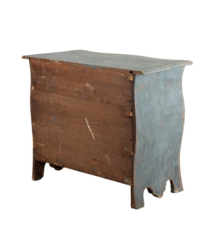 Elegant, tall and with narrow proportions. With serpentine front and three drawers, repainted in soft blue.