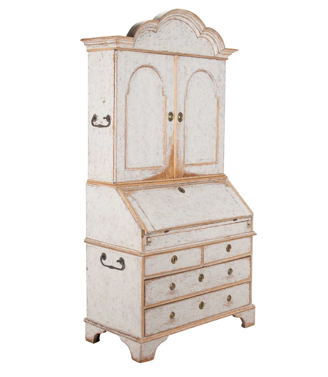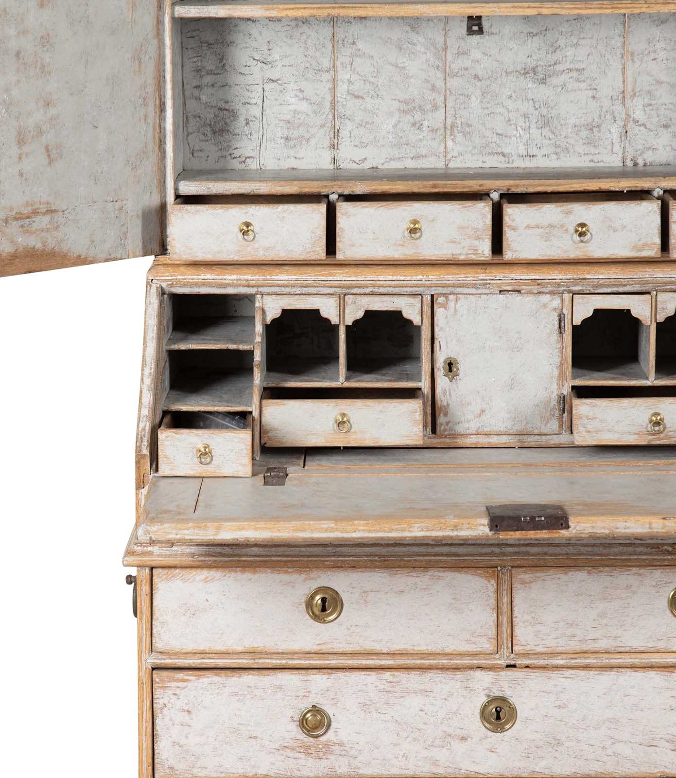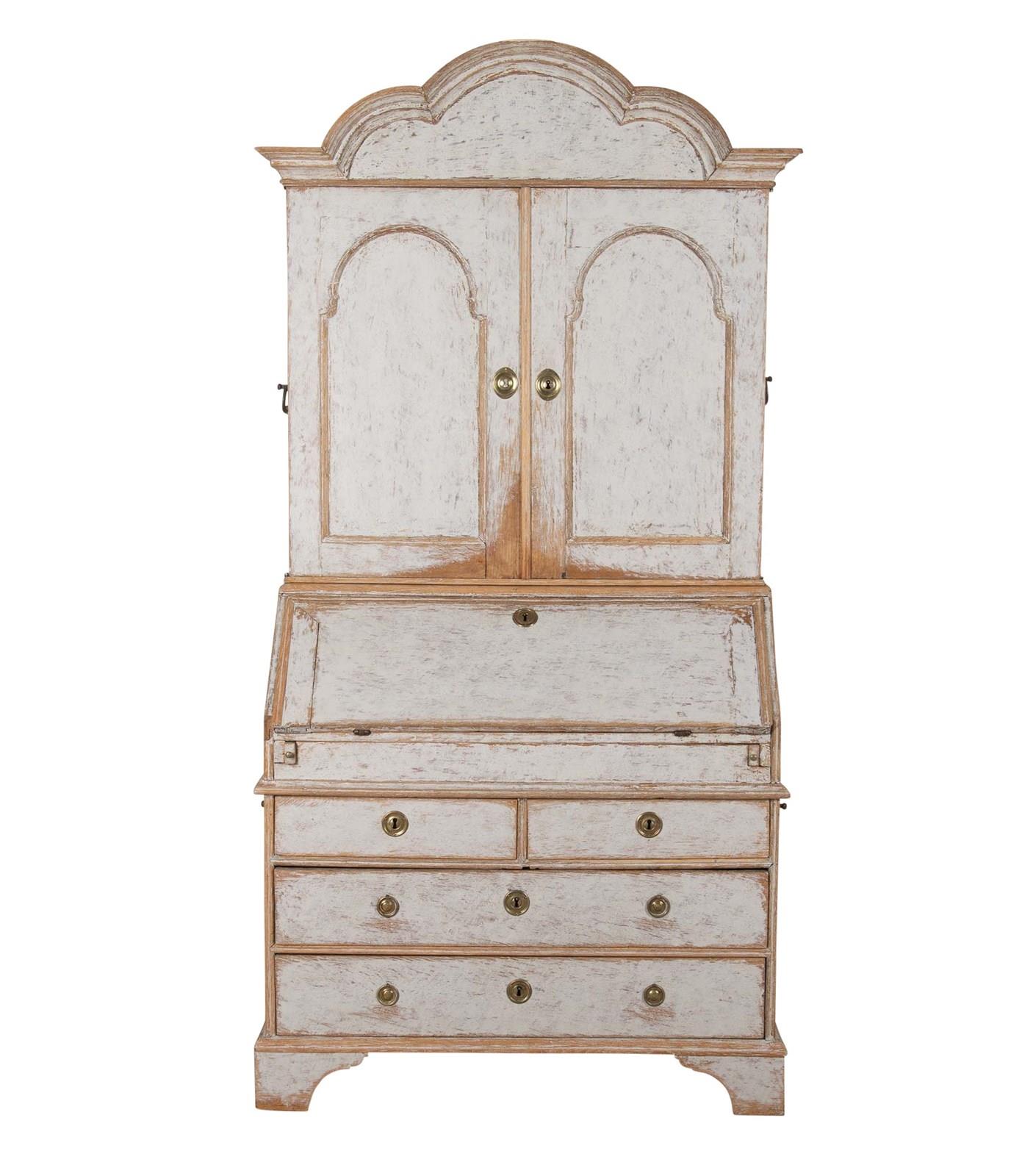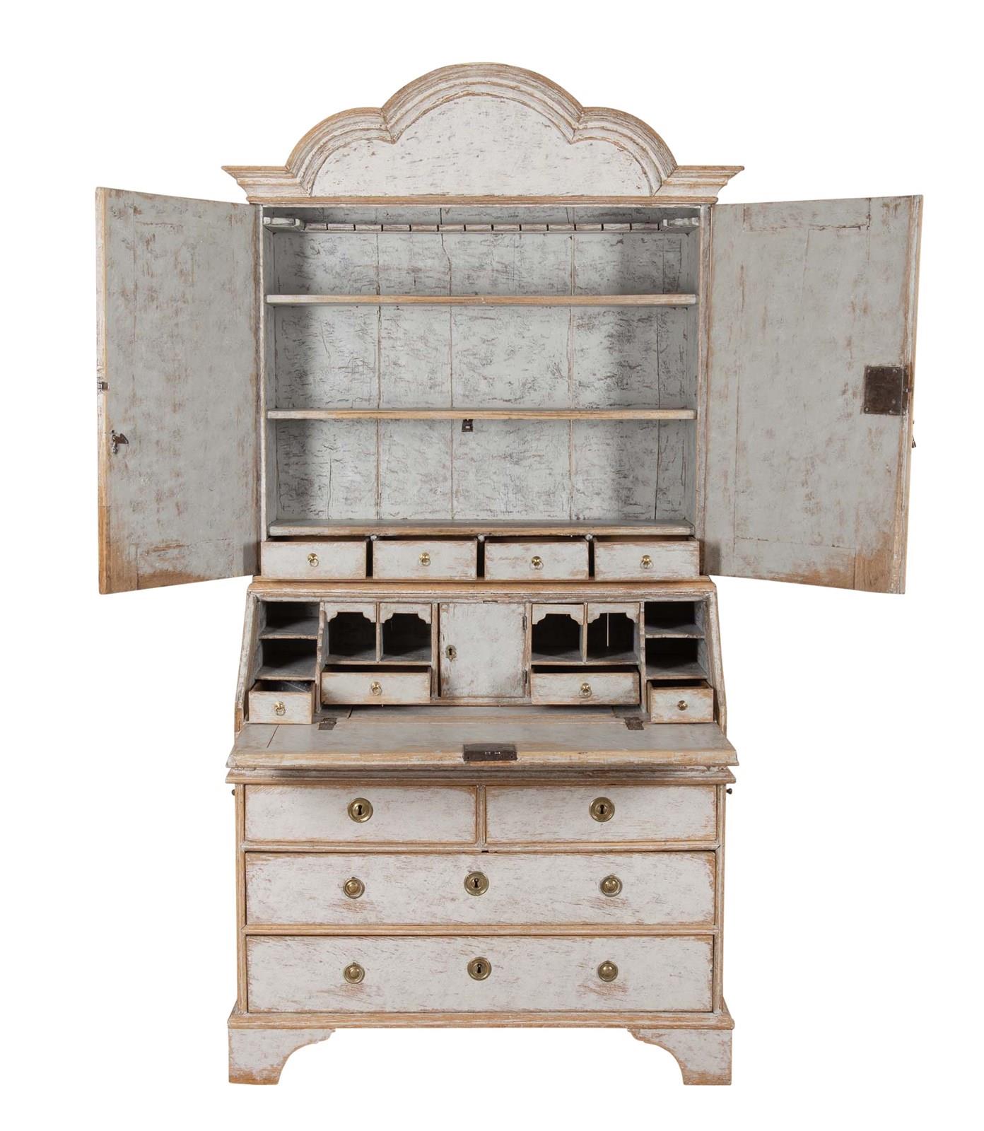 With decorative carved and curved pediment. Below, two doors opening to storage and a fall front desk opening to pigeon holes and drawers. With two short and two long drawers. Repainted in soft grey and with the original hardware. Circa 1760.