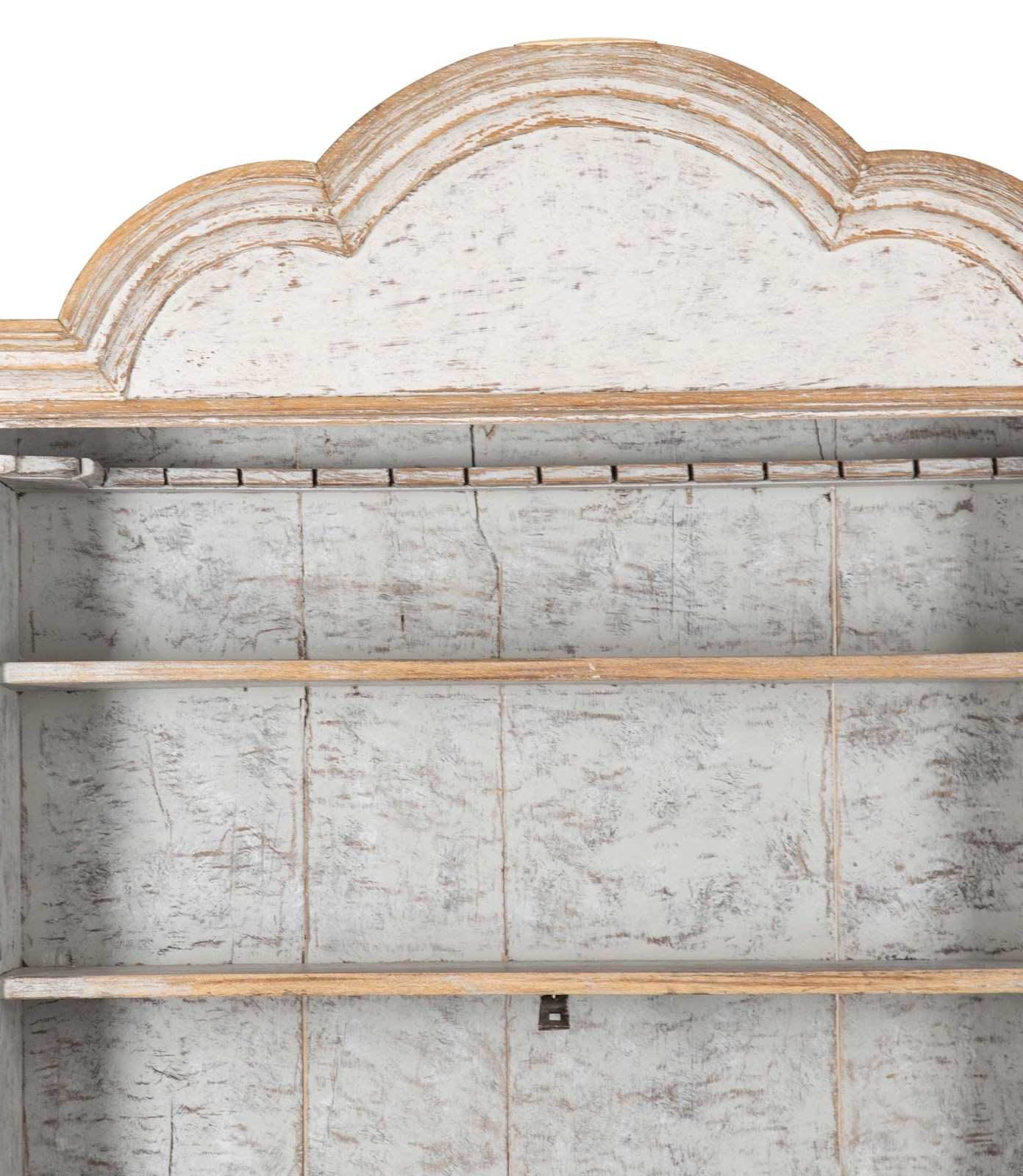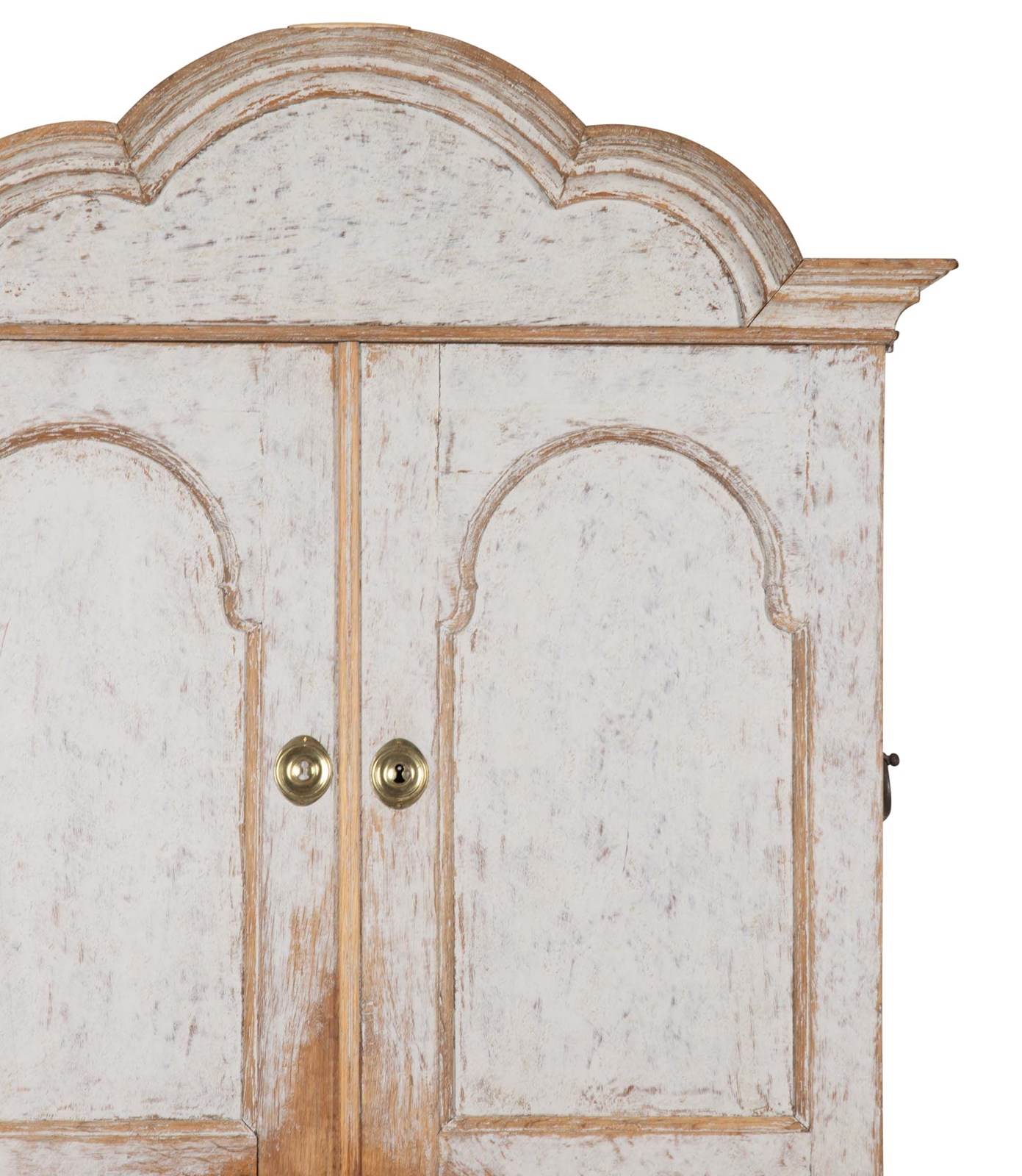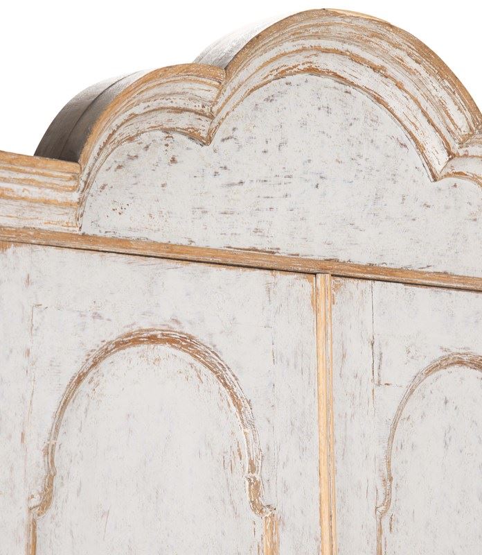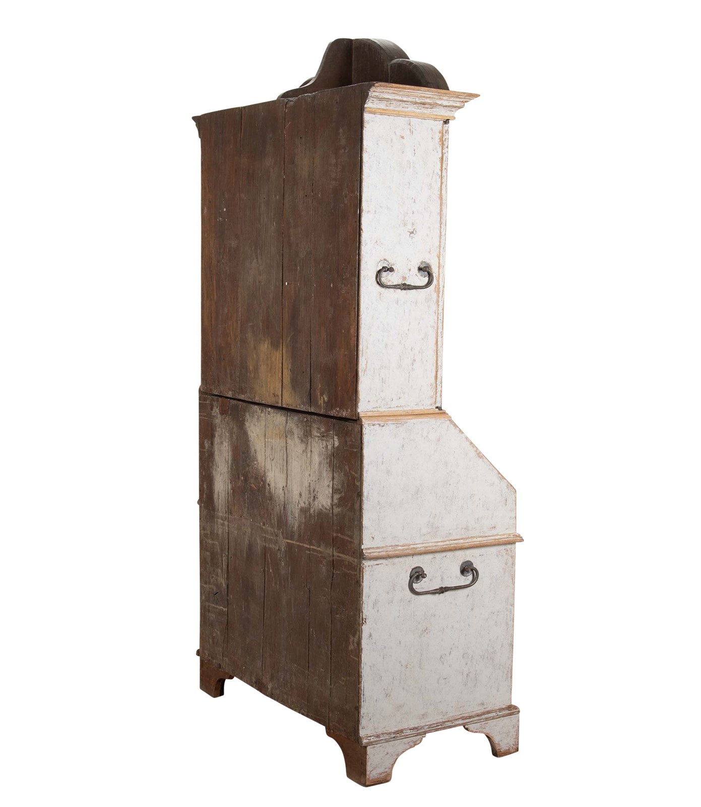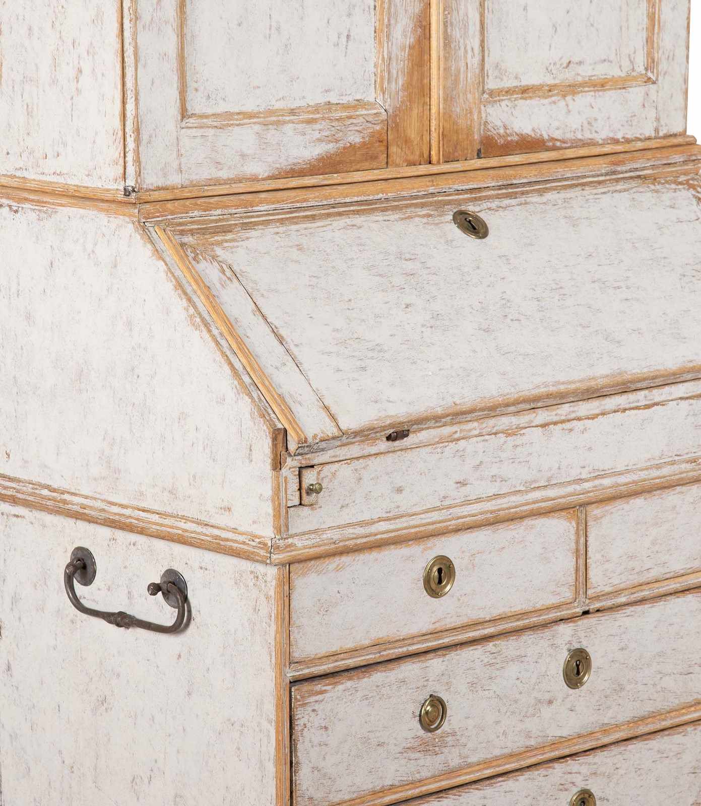 With decorative carved and curved pediment. Below, two doors opening to storage and a fall front desk opening to pigeon holes and drawers. With two short and two long drawers. Repainted in soft grey and with the original hardware. Circa 1760.