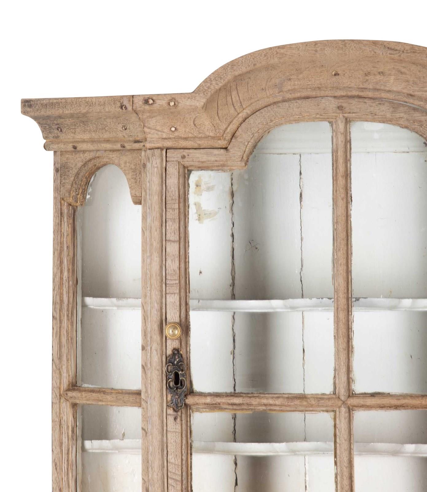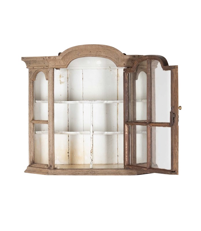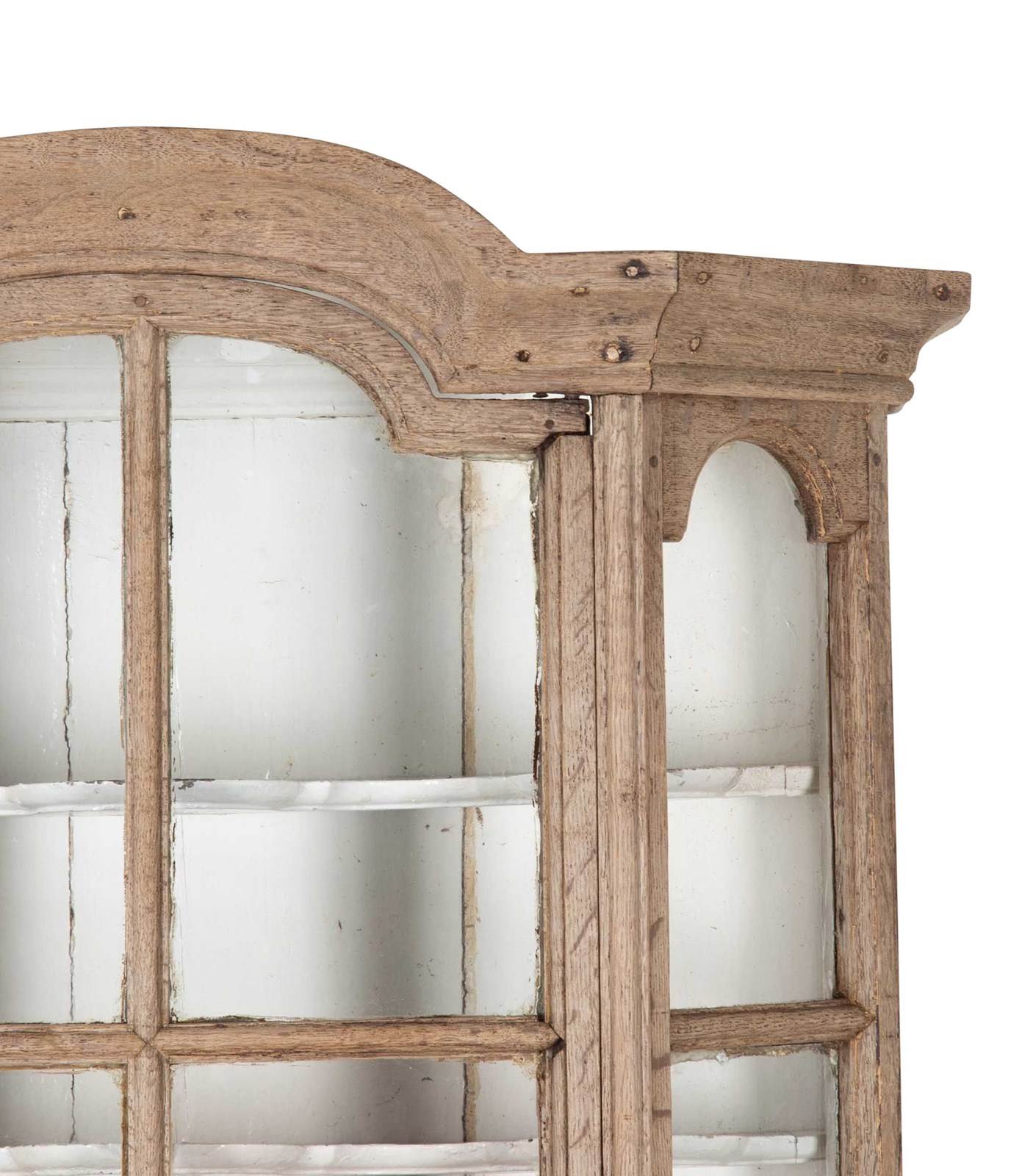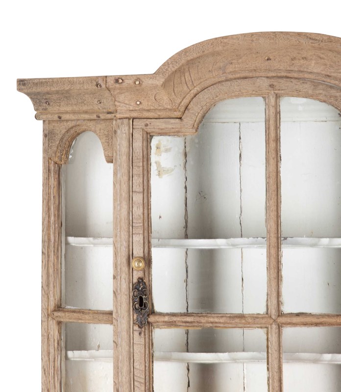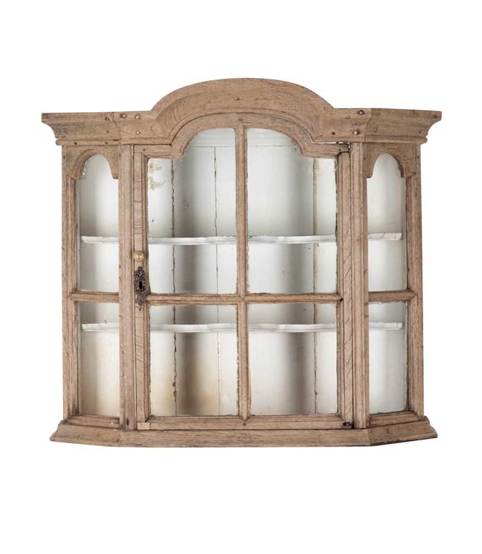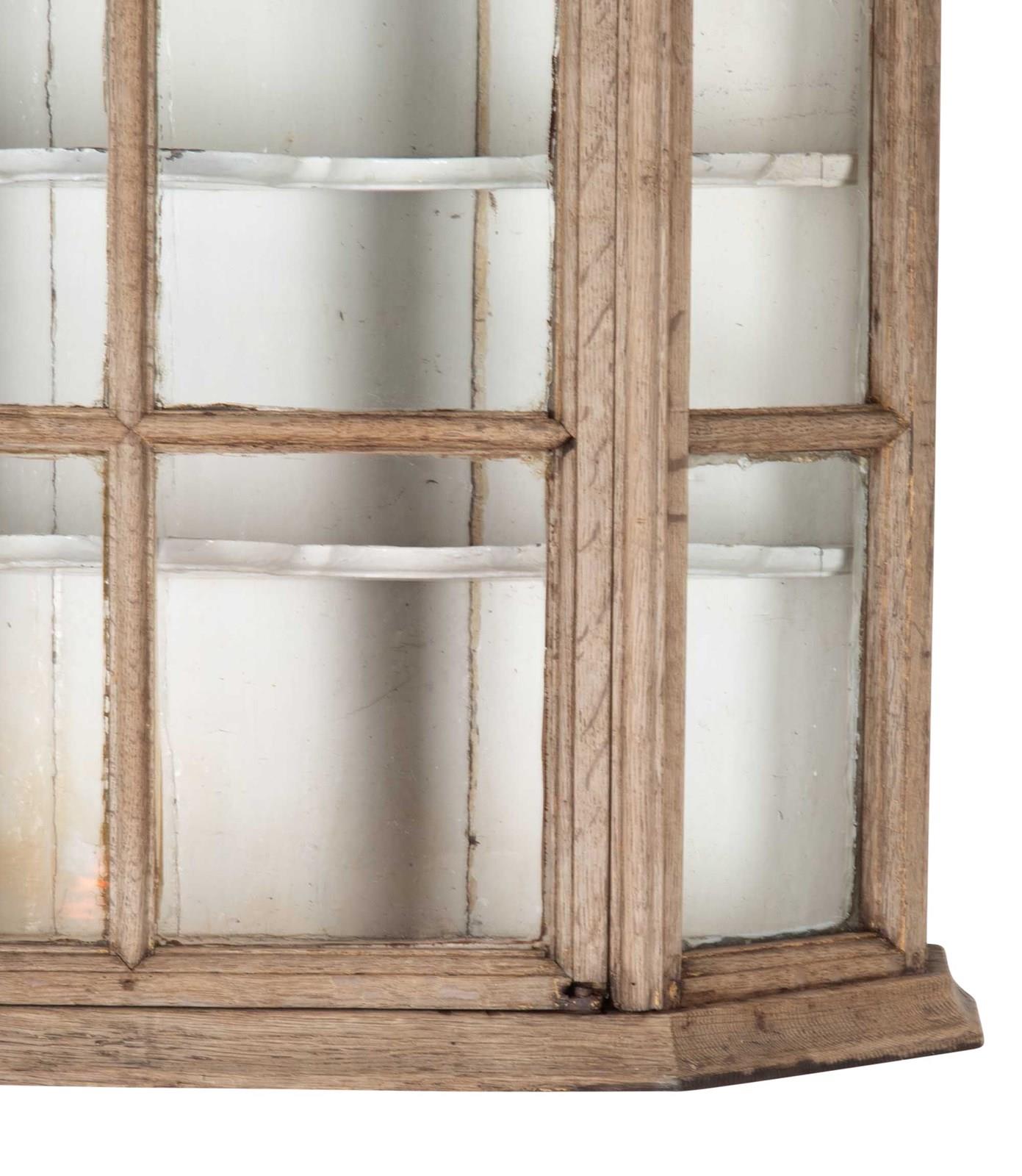 Bleached oak with glazed panels and door opening to shelved display. Circa 1880.