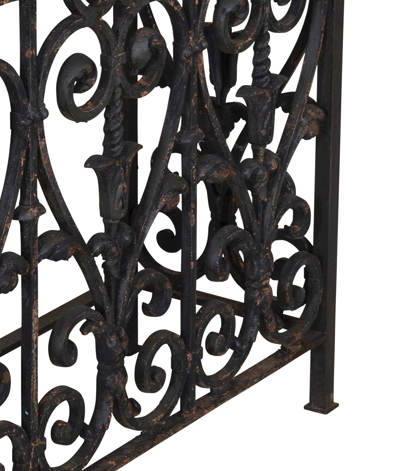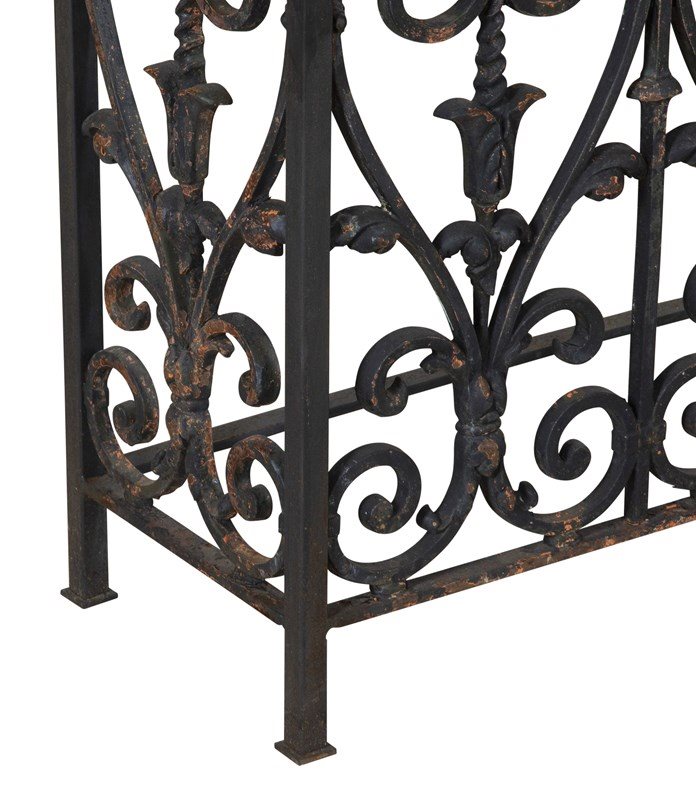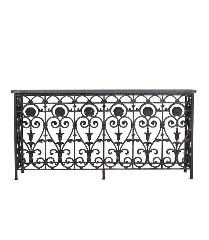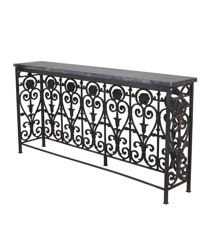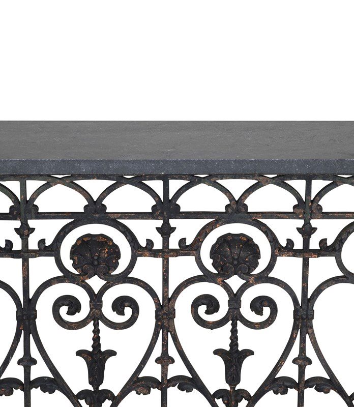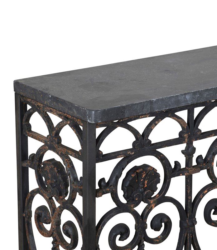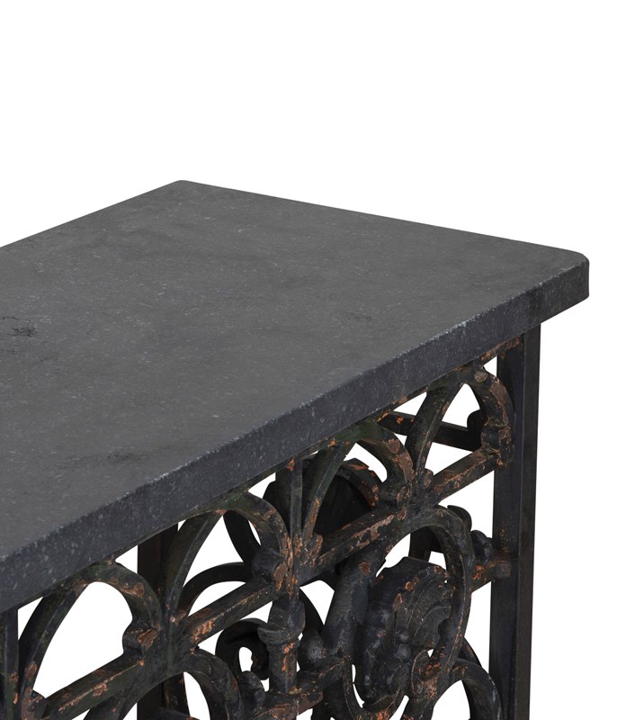 Excellent workmanship, with scroll and shell design and a time worn patina. Belgium blue slate top, ideal narrow consoles for a hallway, landing or over a radiator.