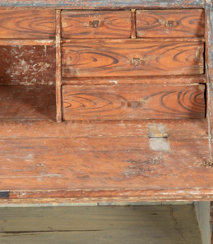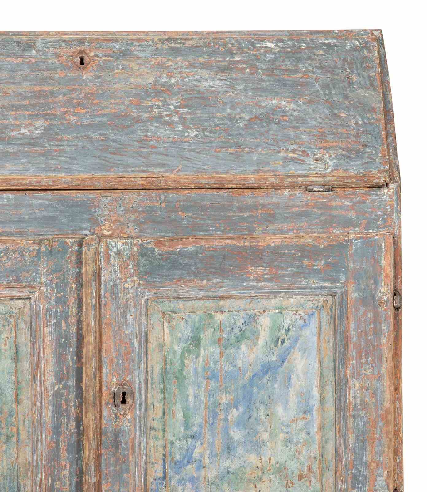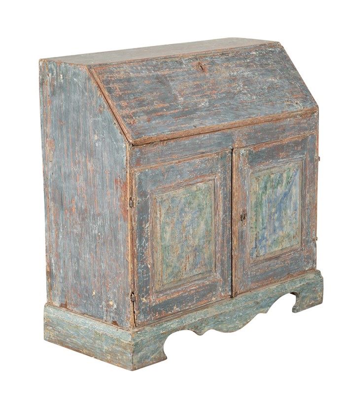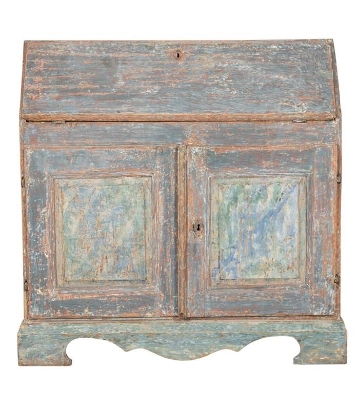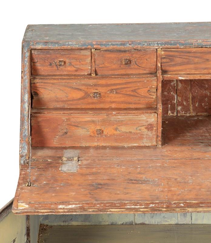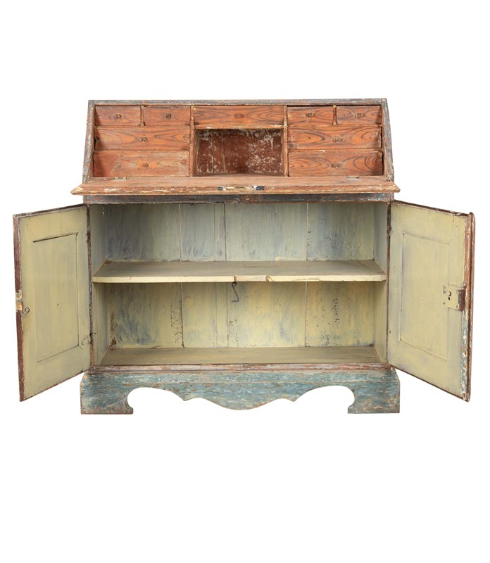 19th century Swedish bureau in original paint , fall front desk opening to useful work space , nine drawers , below two doors with decorative carved paneling , opening to useful storage