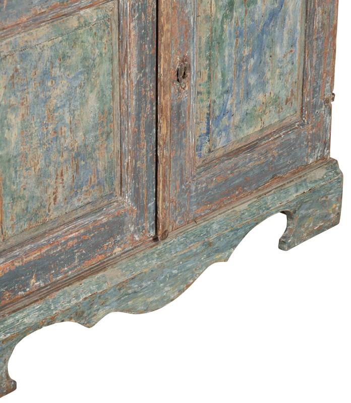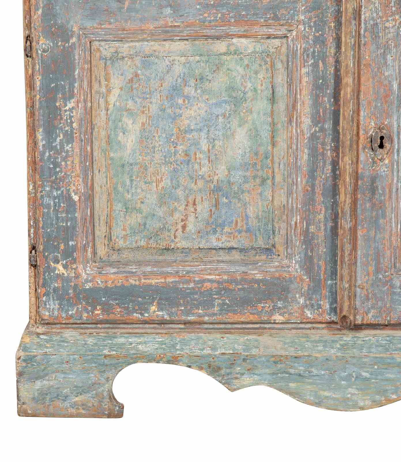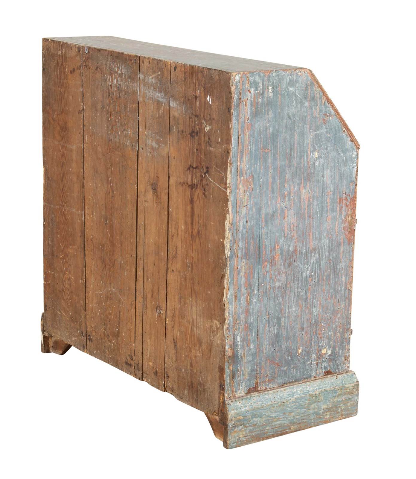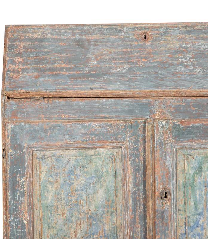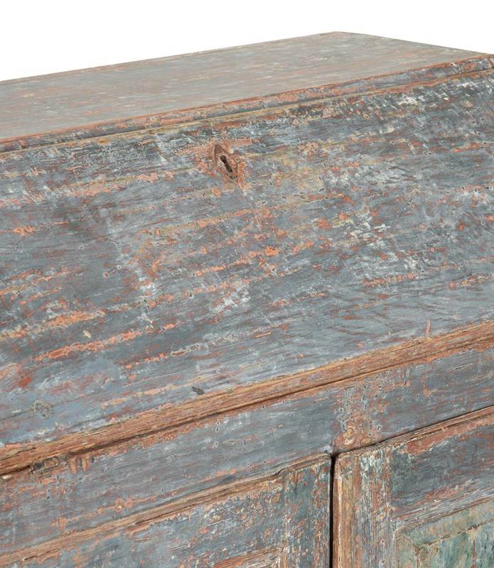 19th century Swedish bureau in original paint , fall front desk opening to useful work space , nine drawers , below two doors with decorative carved paneling , opening to useful storage