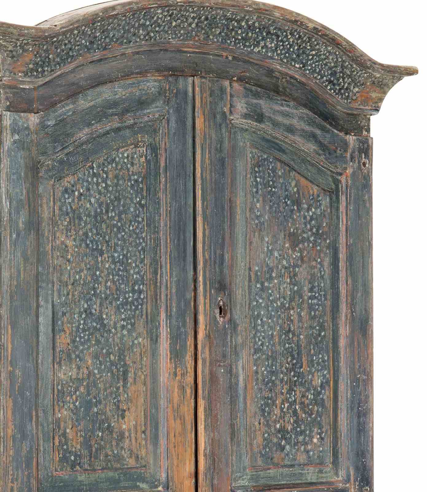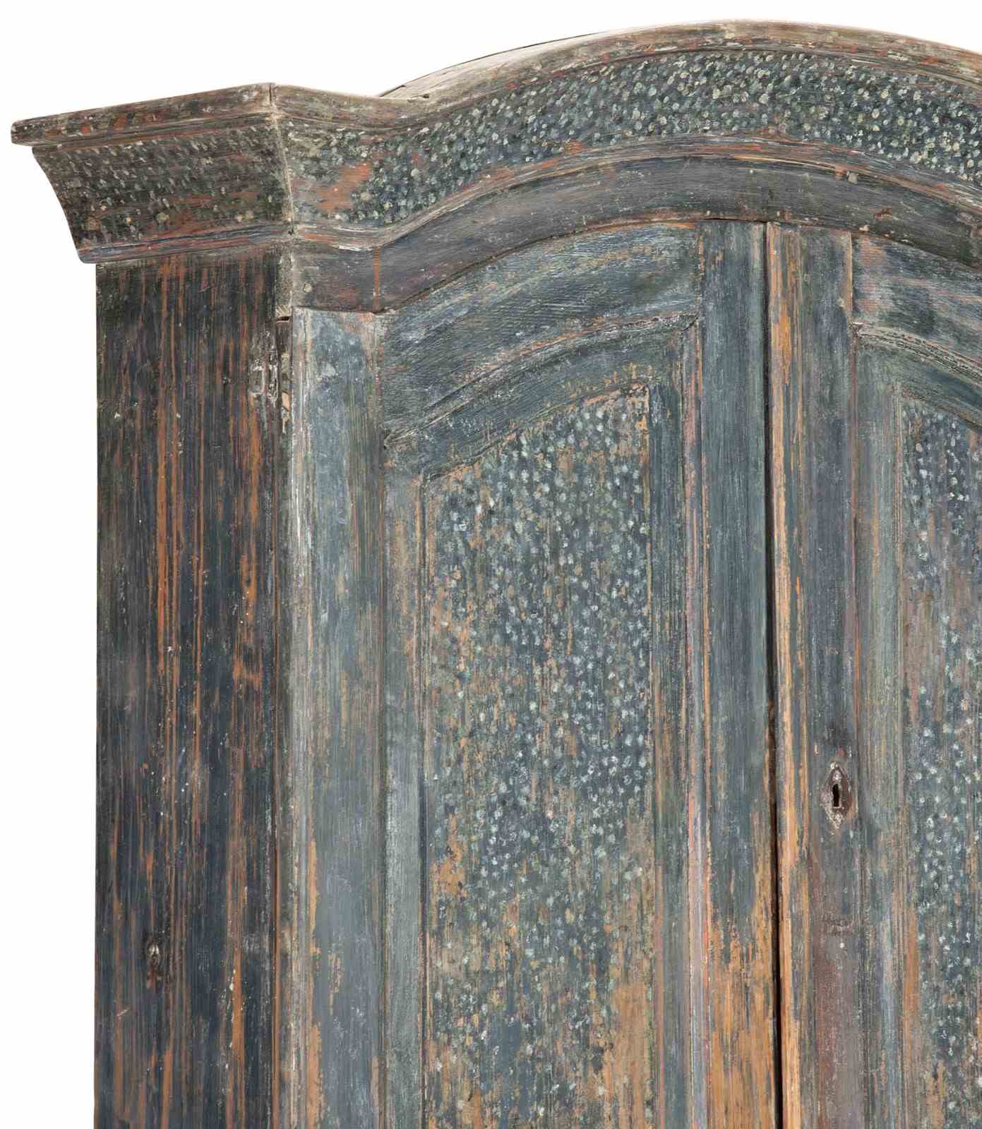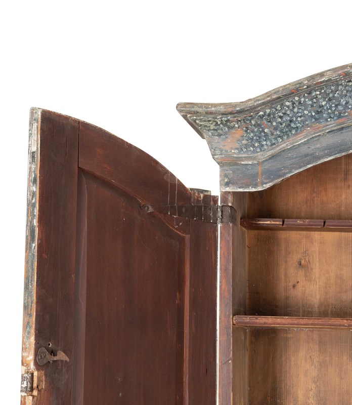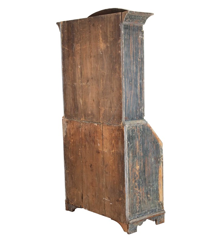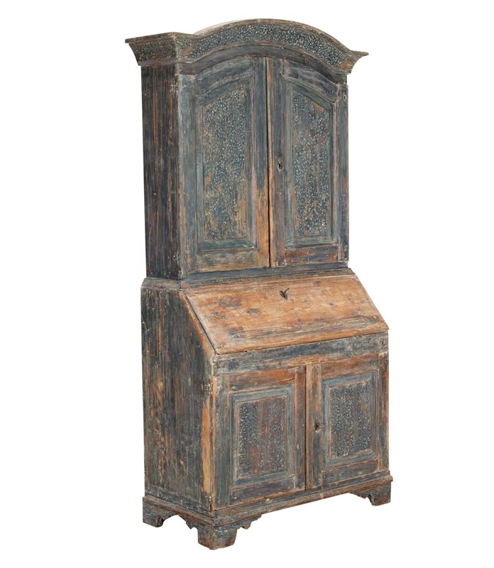 With a curved pediment, below two doors opening to storage. Below fall front desk opening to drawers and pigeon halls, scraped to original charming paint with dot design in blue.