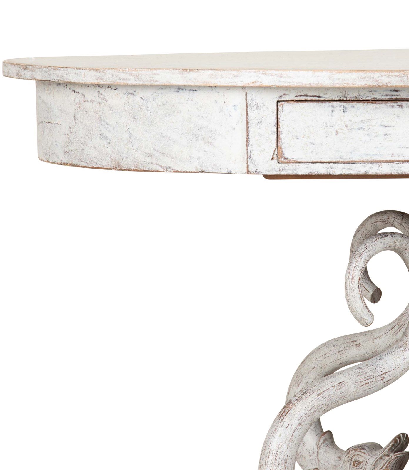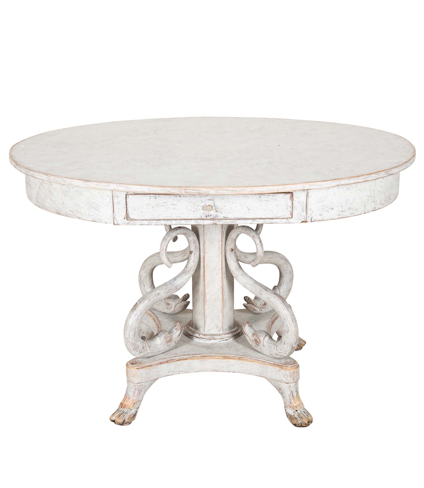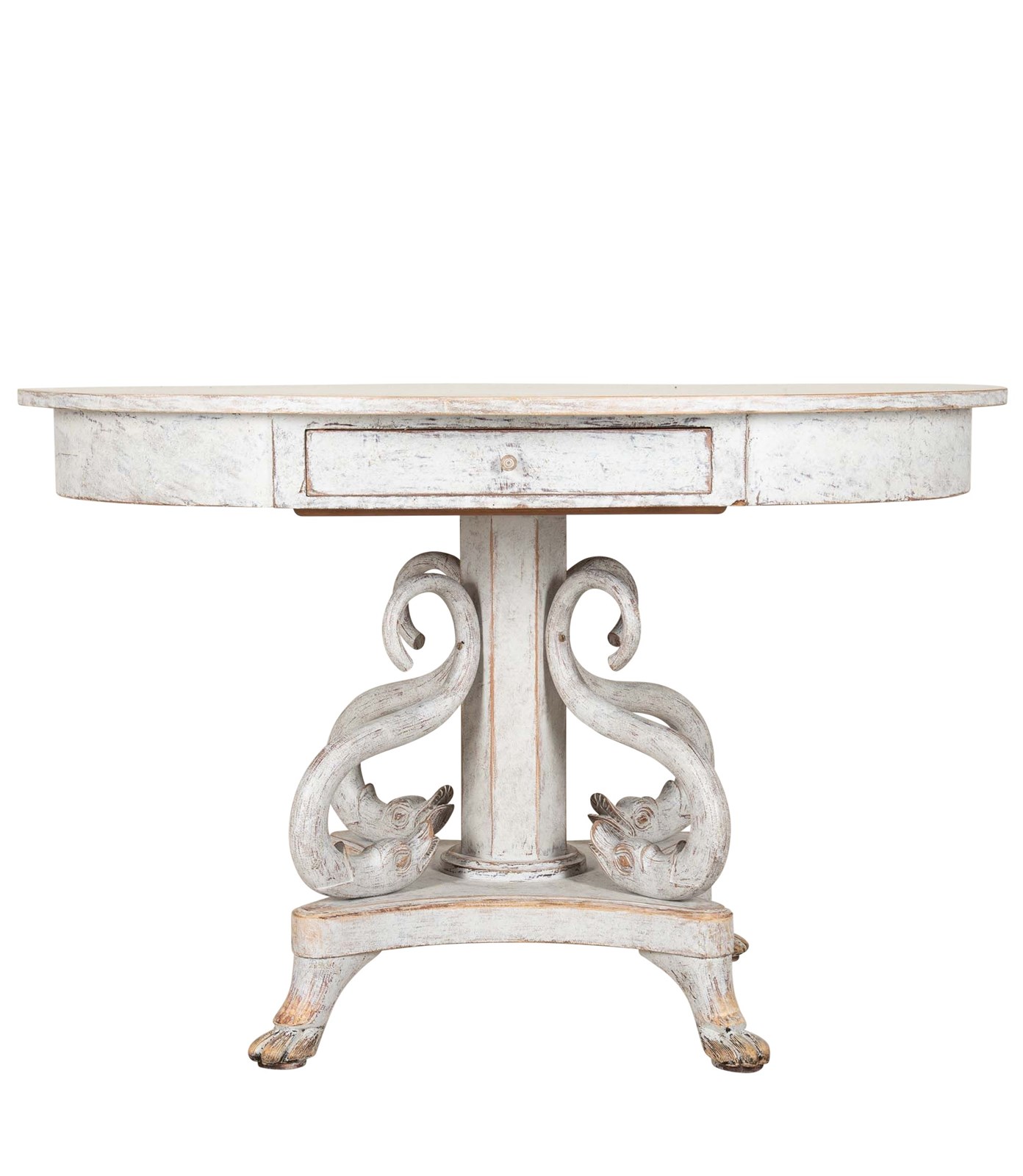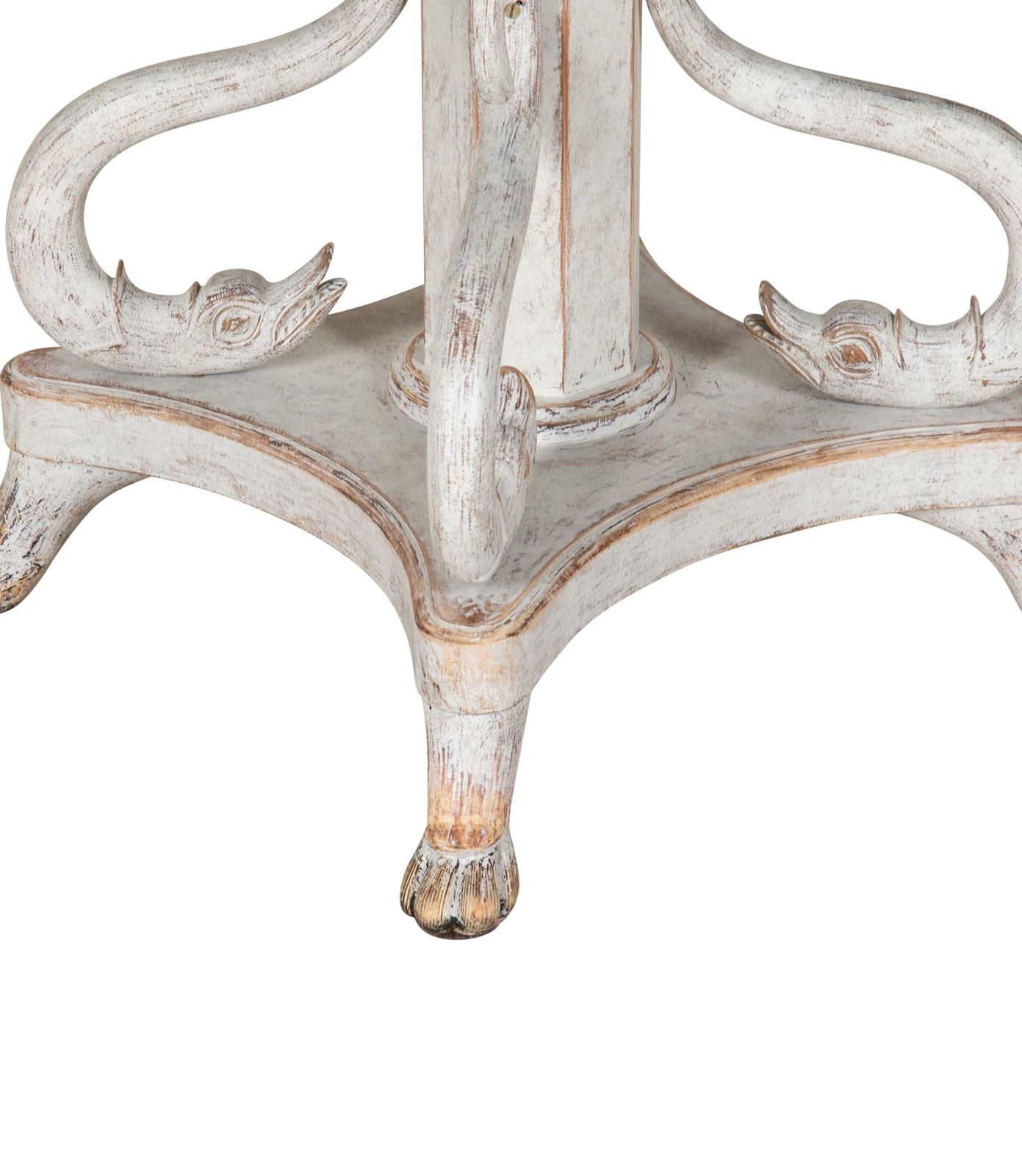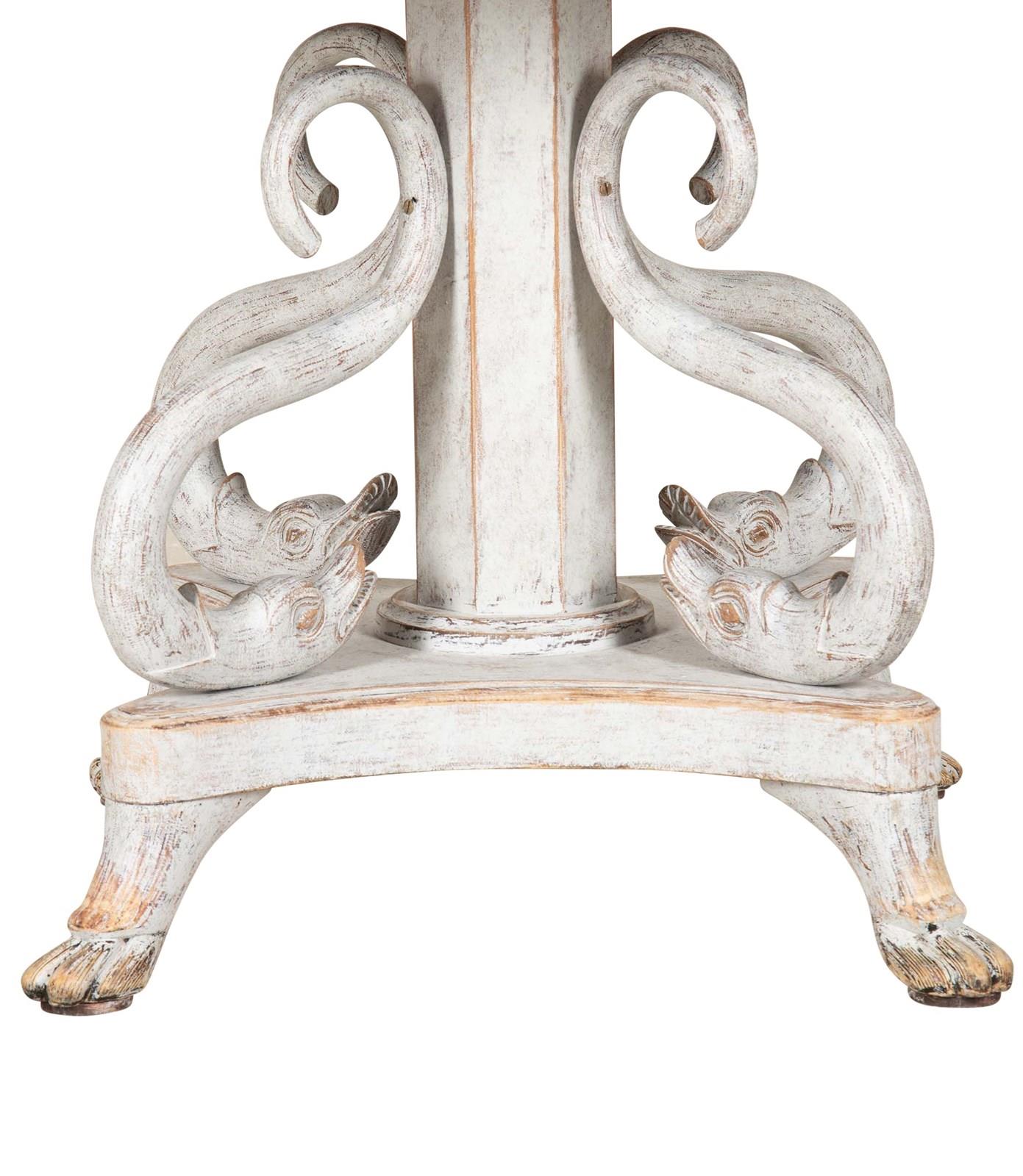 Detailed with carved decorative dolphins around a column curtailing to lions paw feet.