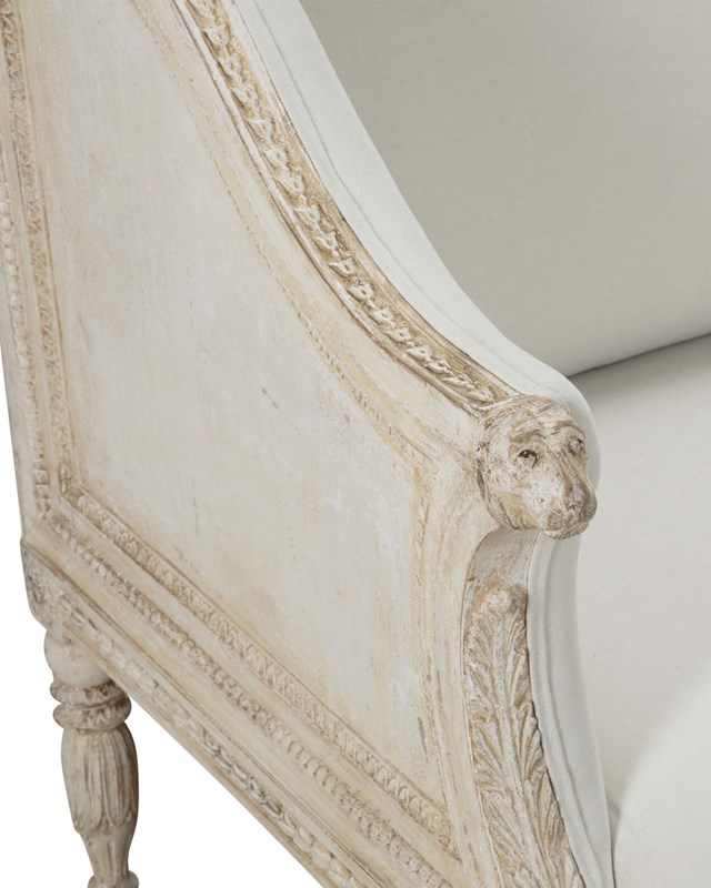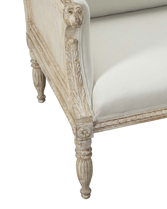 Superb decorative carving around the sofa, curtailing to decorative carved wooden lions heads.