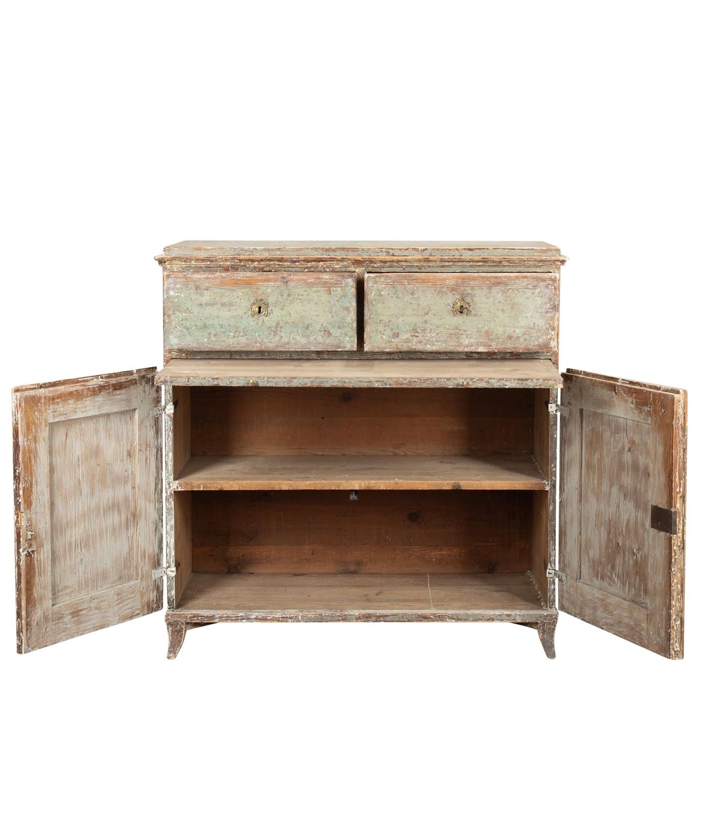 With two drawers for useful storage and below, a pull out shelf. Further below, two doors with carved decorative detailing. Scraped to original paint with light retouches in soft green. Circa 1820.
