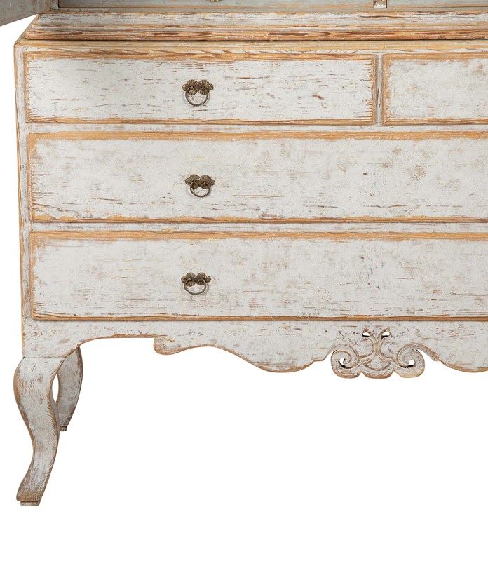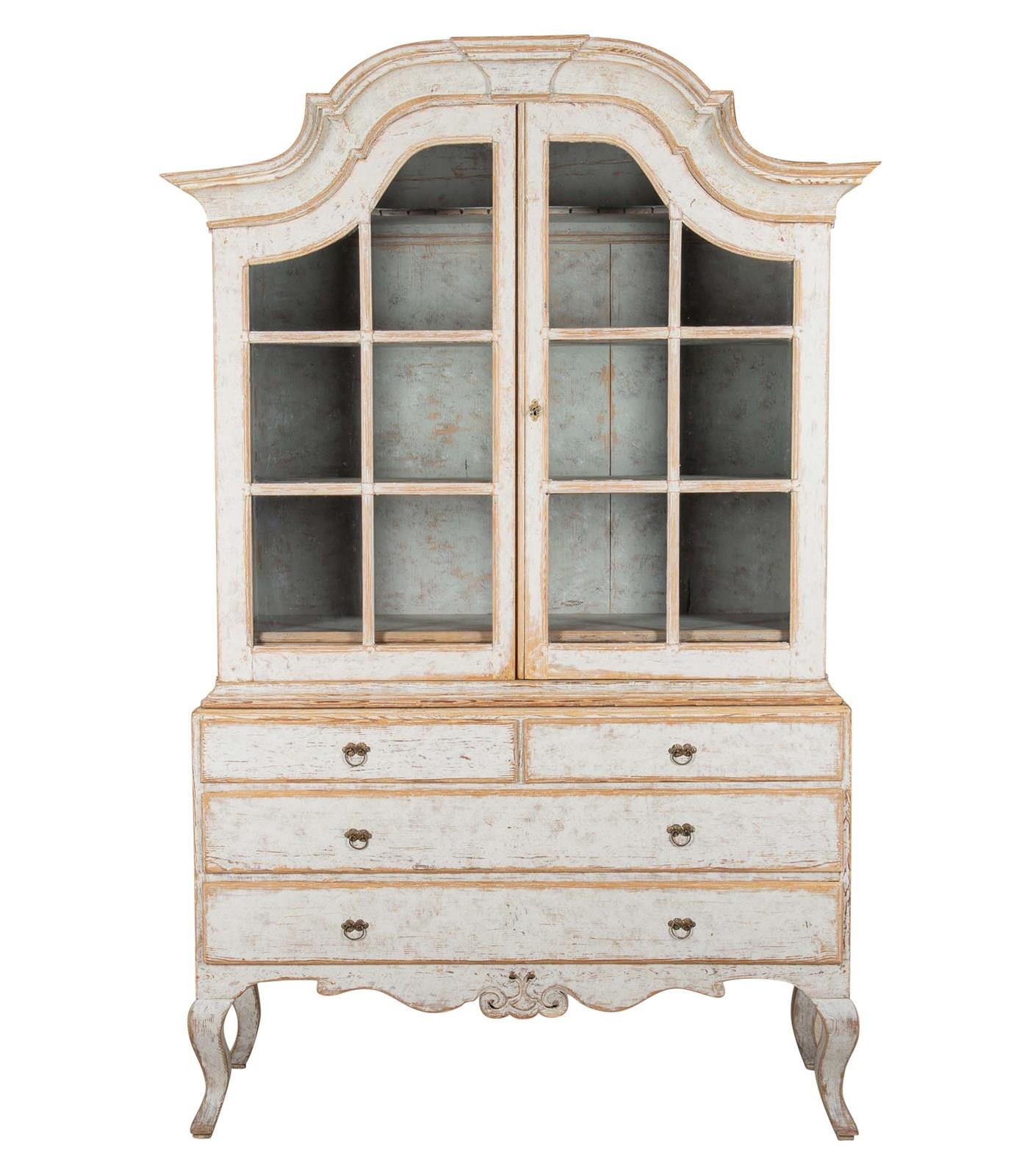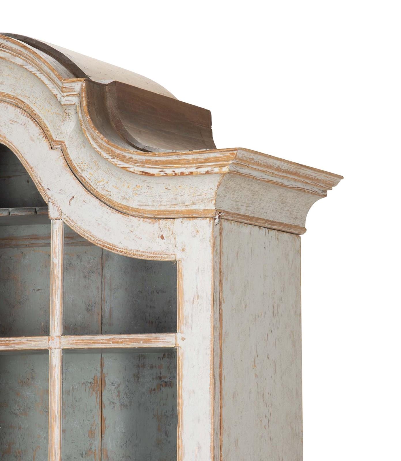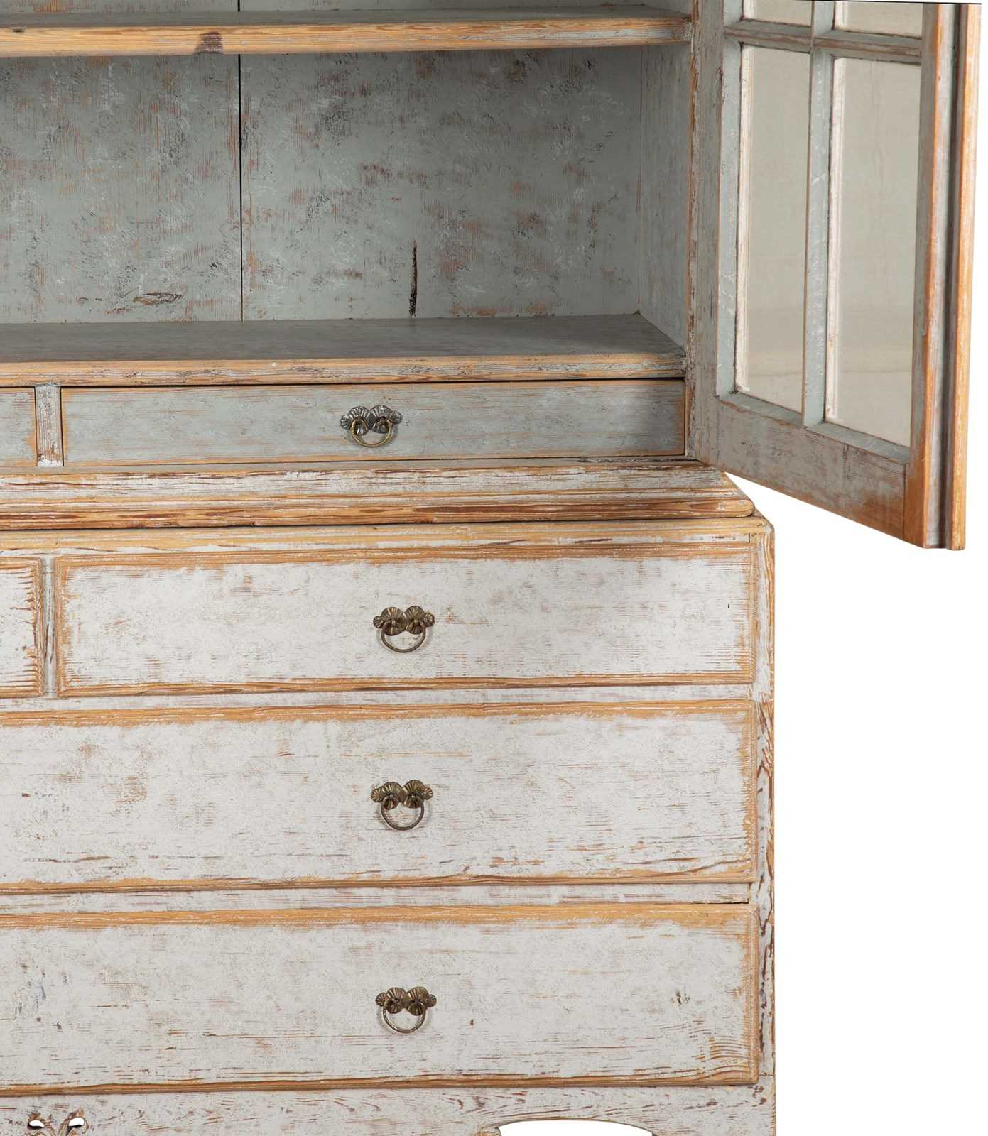 With crisp carving and good construction and proportions. With a decorative carved pediment, two glazed doors opening to storage. Below, two short and two long drawers. Repainted in soft grey outside and blue on the inner and the original hardware. Circa 1780.