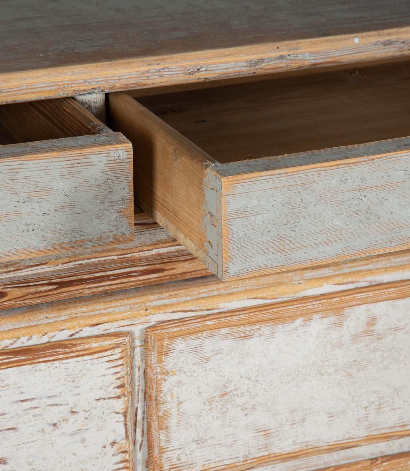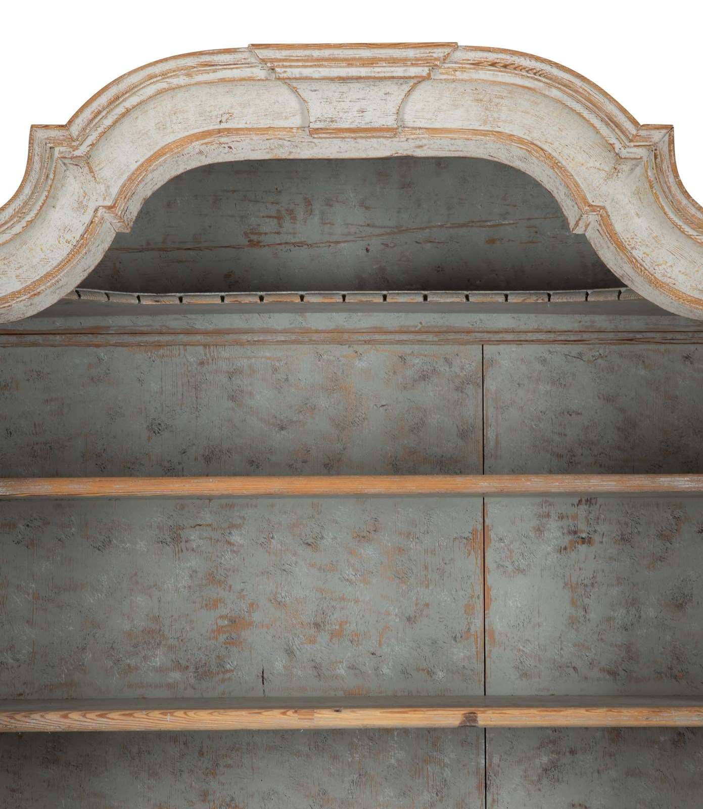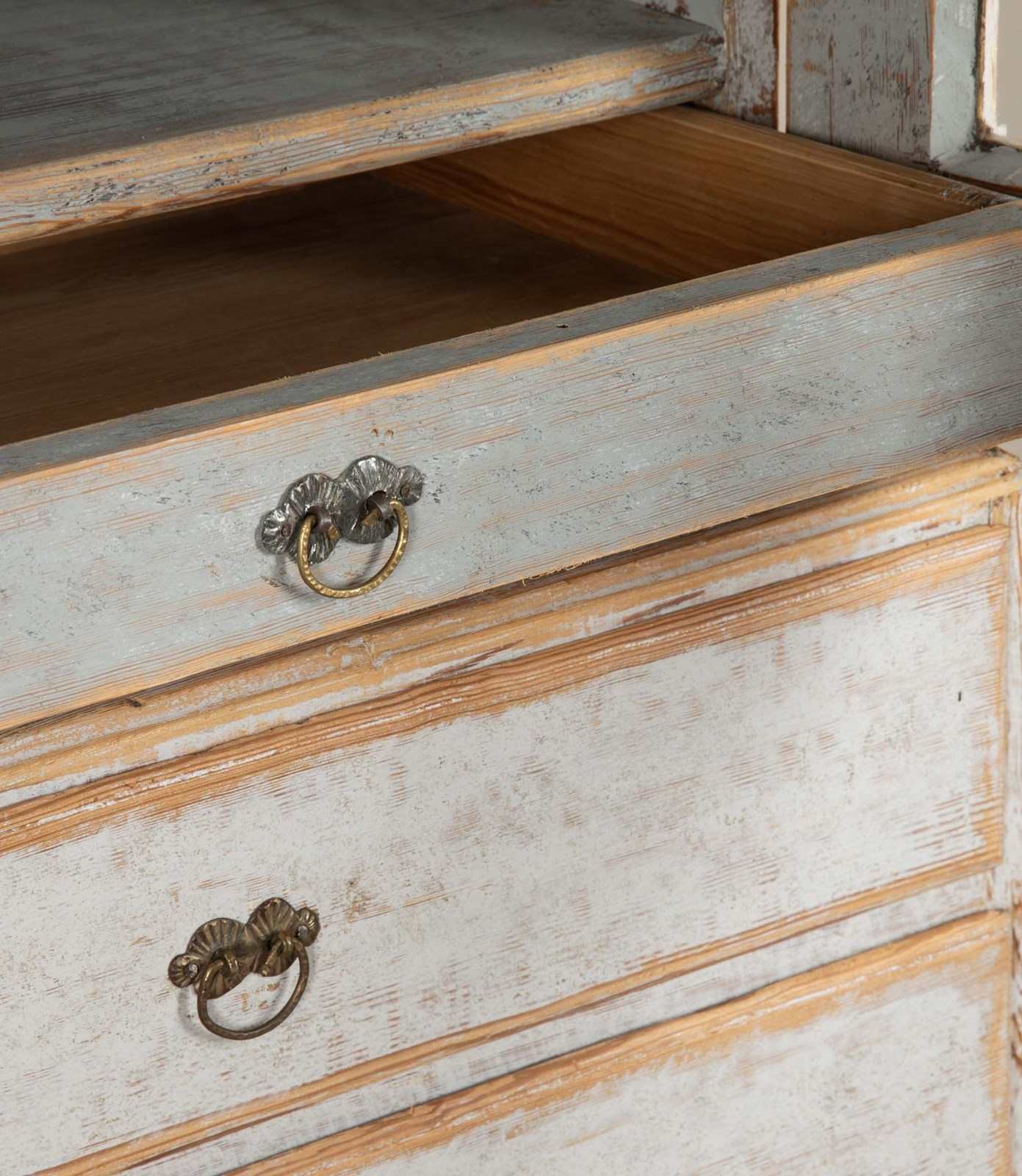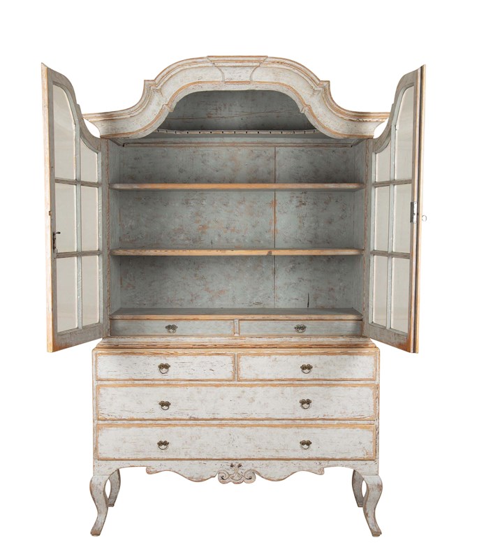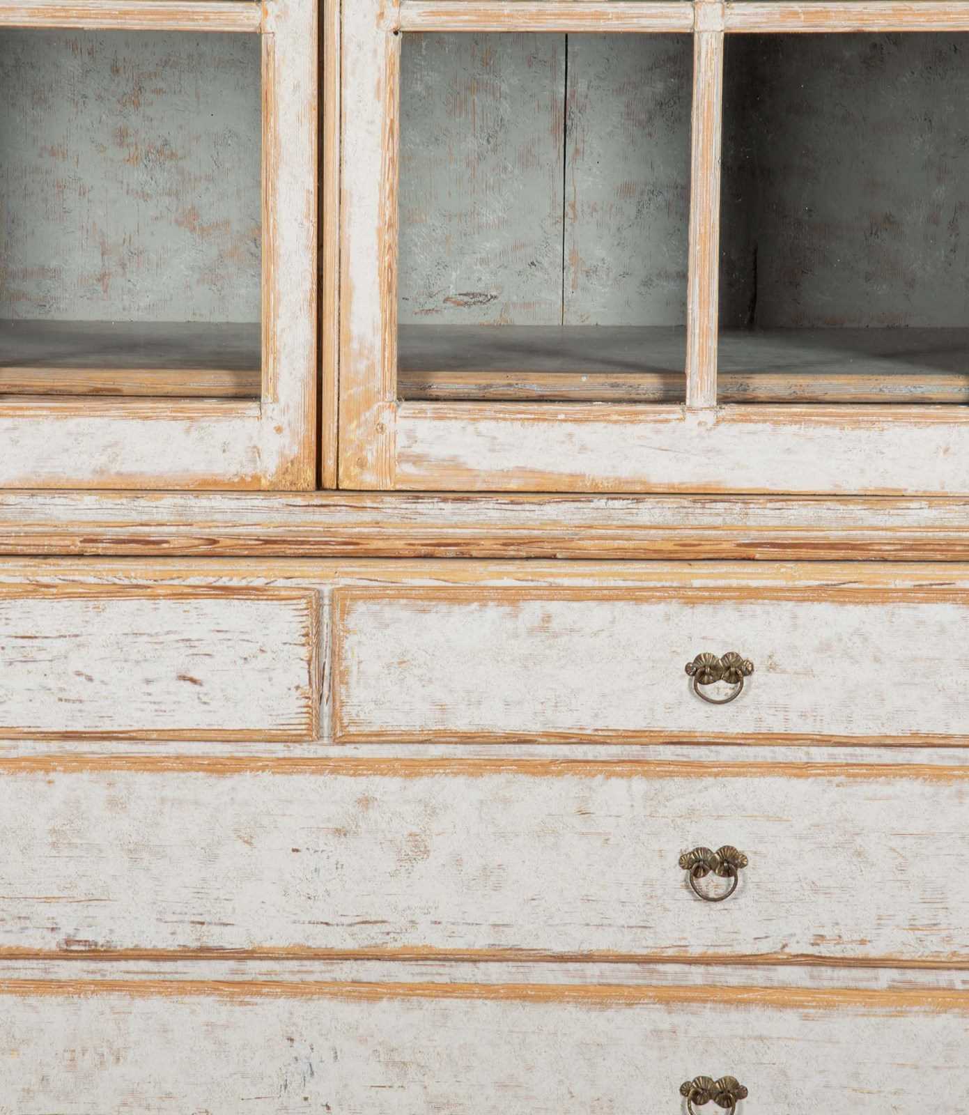 With crisp carving and good construction and proportions. With a decorative carved pediment, two glazed doors opening to storage. Below, two short and two long drawers. Repainted in soft grey outside and blue on the inner and the original hardware. Circa 1780.