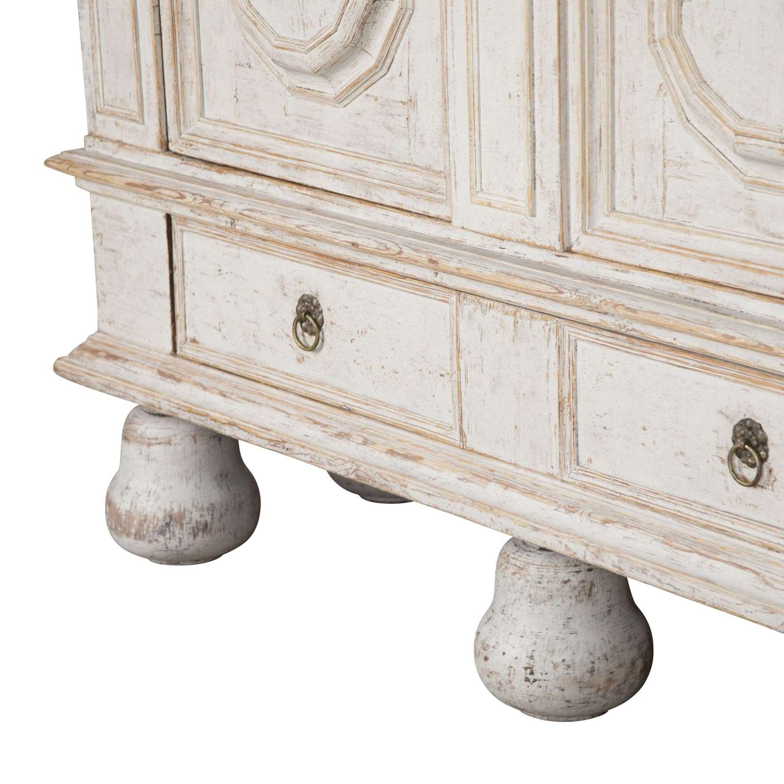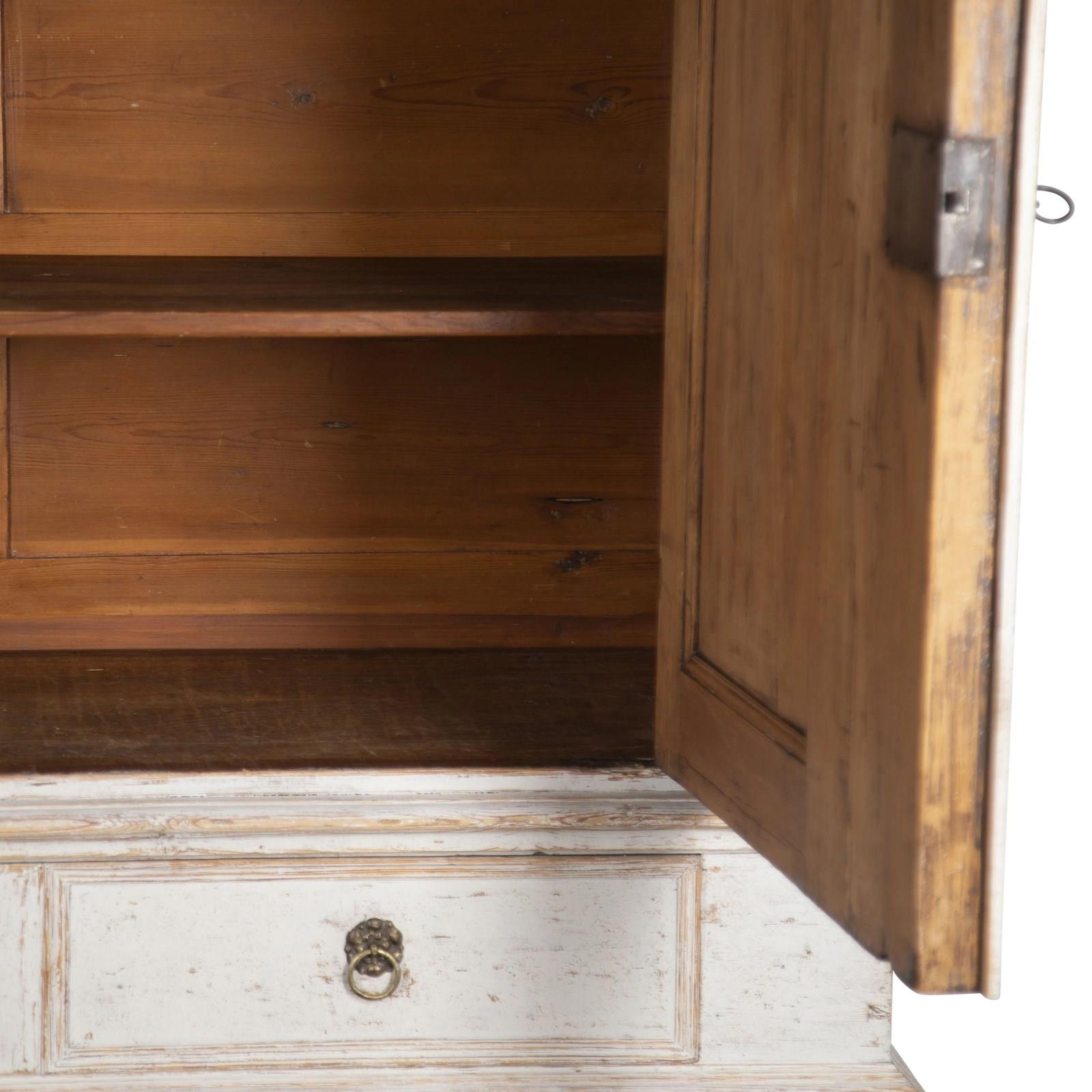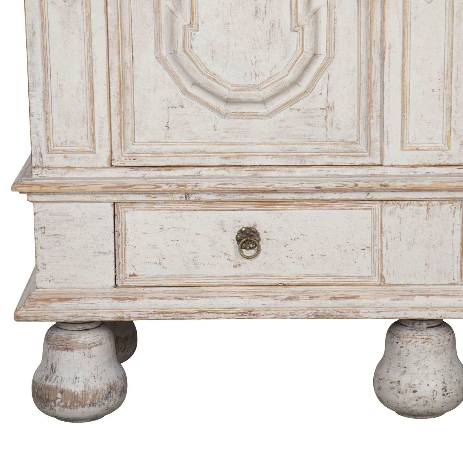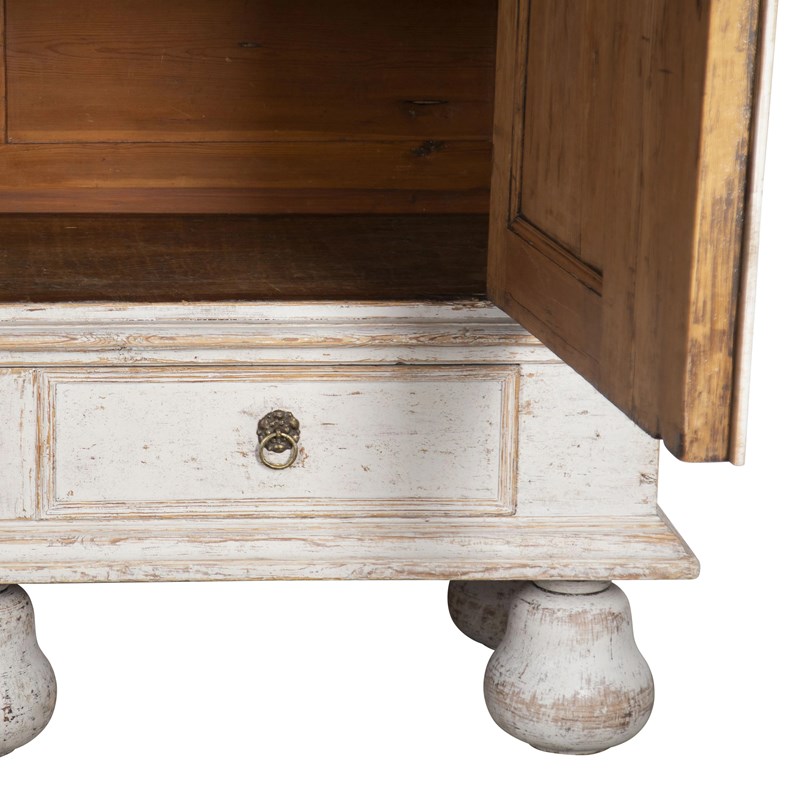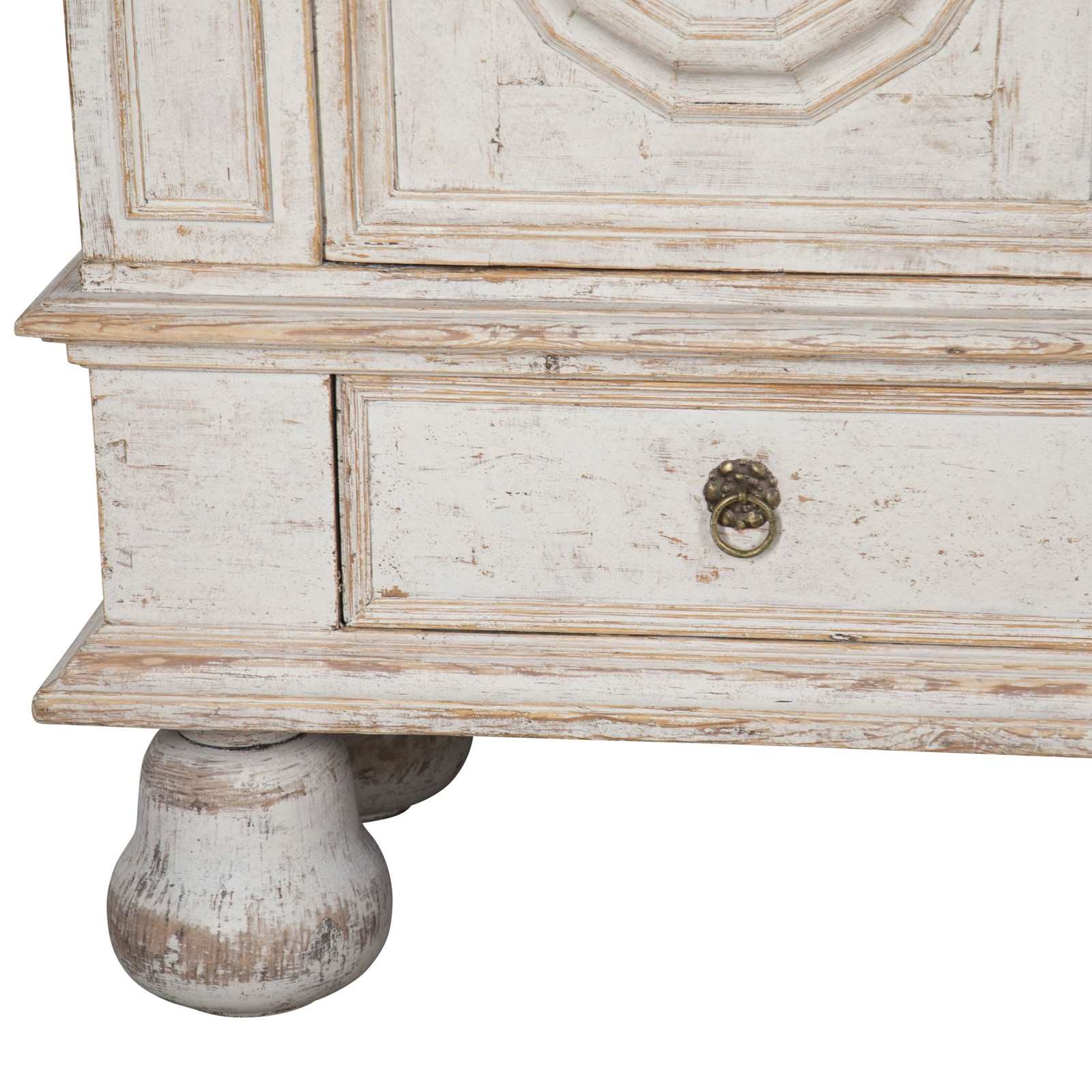 With a deeply carved pediment and decorative detailing on the doors. Below sit two drawers with their original loose pear-shaped feet.